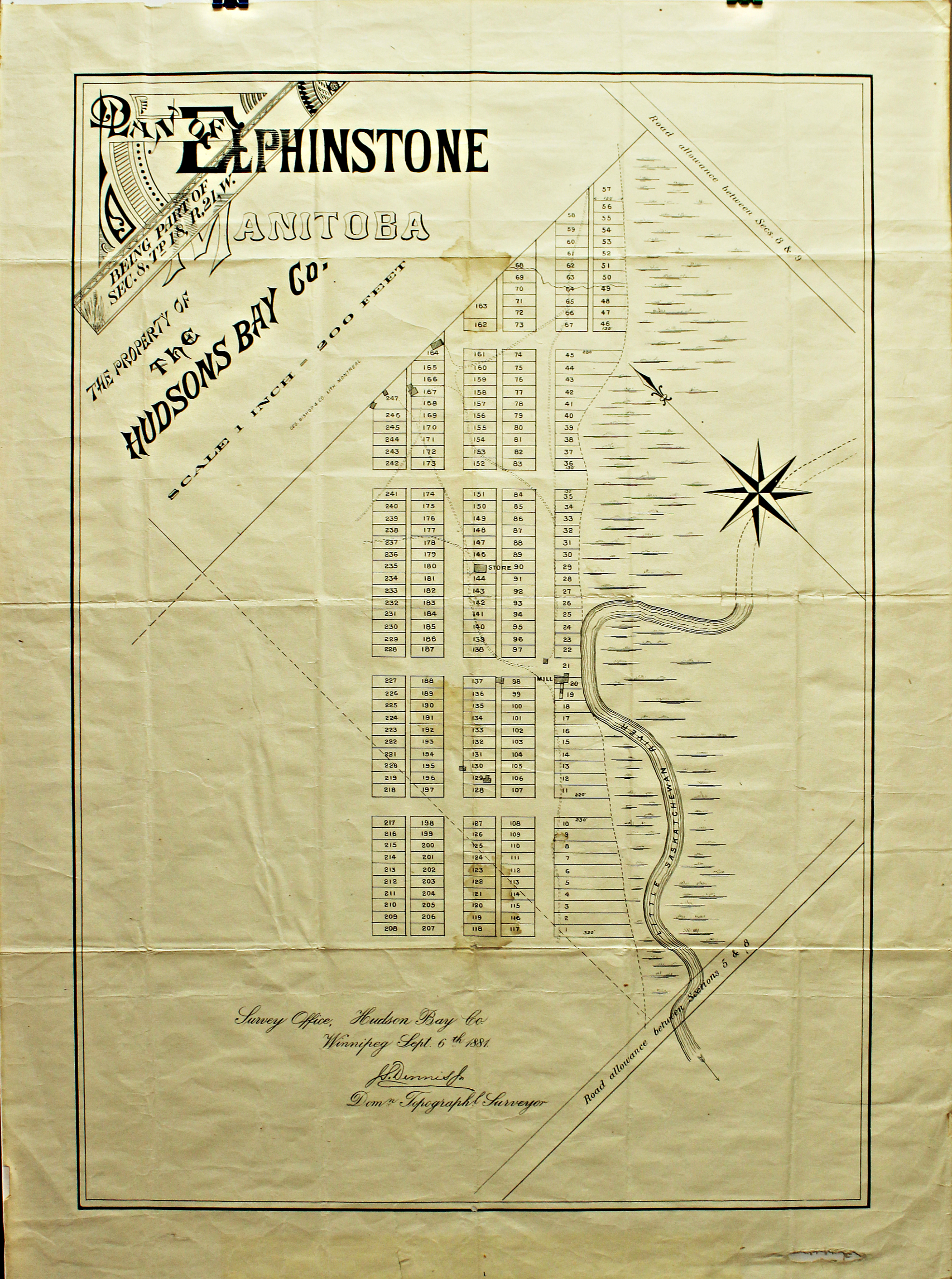 Object Desc The plan of Elphinstone, MB as surveyed by the Hudson Bay company on September 6th, 1881.