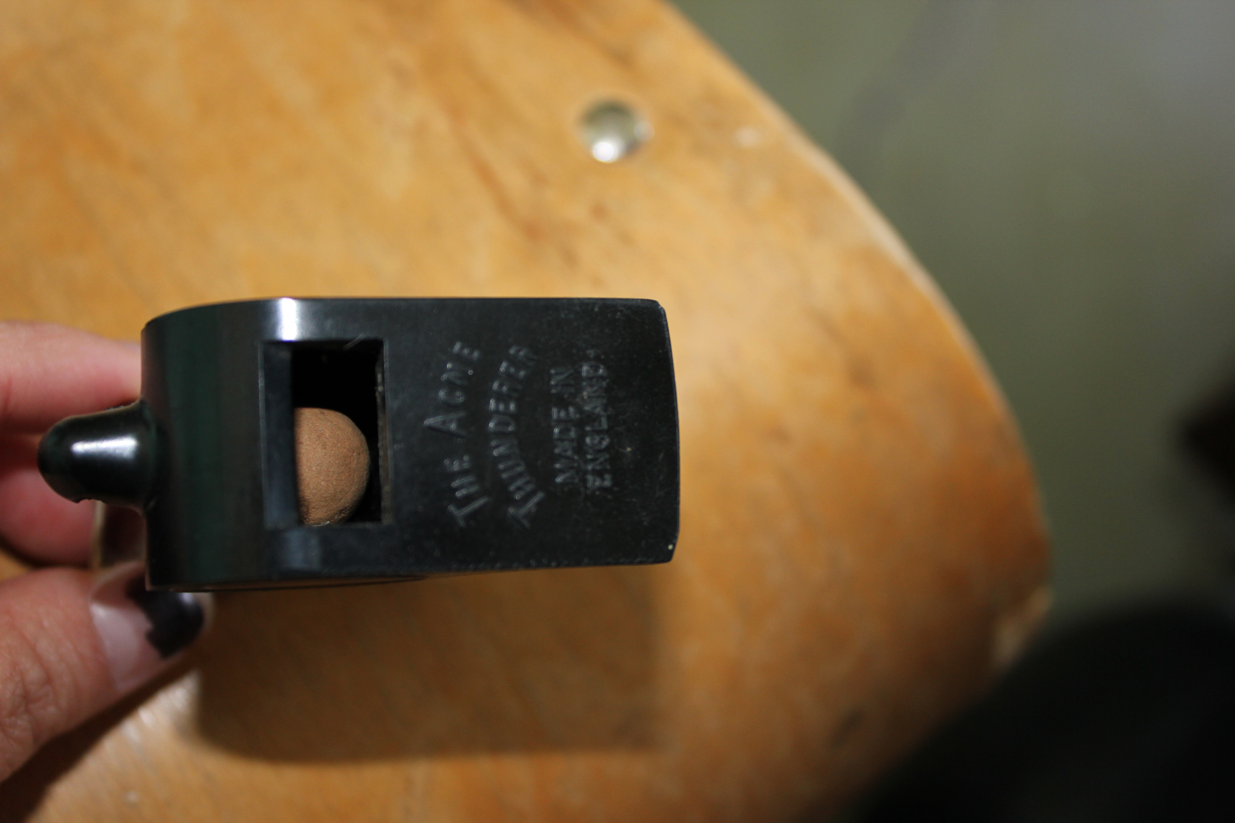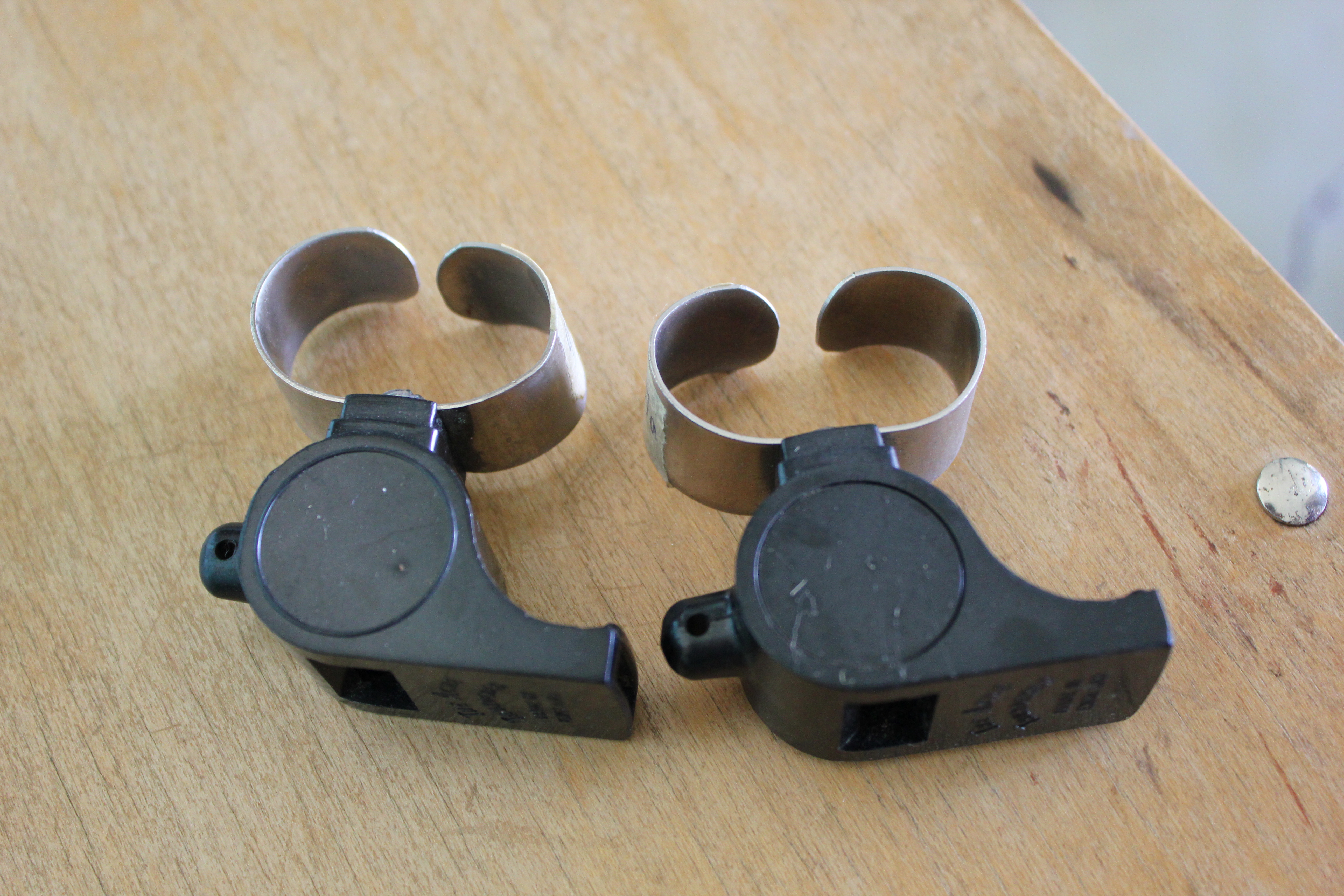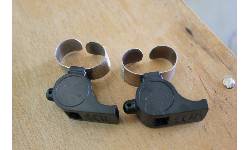 Object Desc 2 whistles for hockey refs. Are attached to knuckle by slipping hand into metal ring