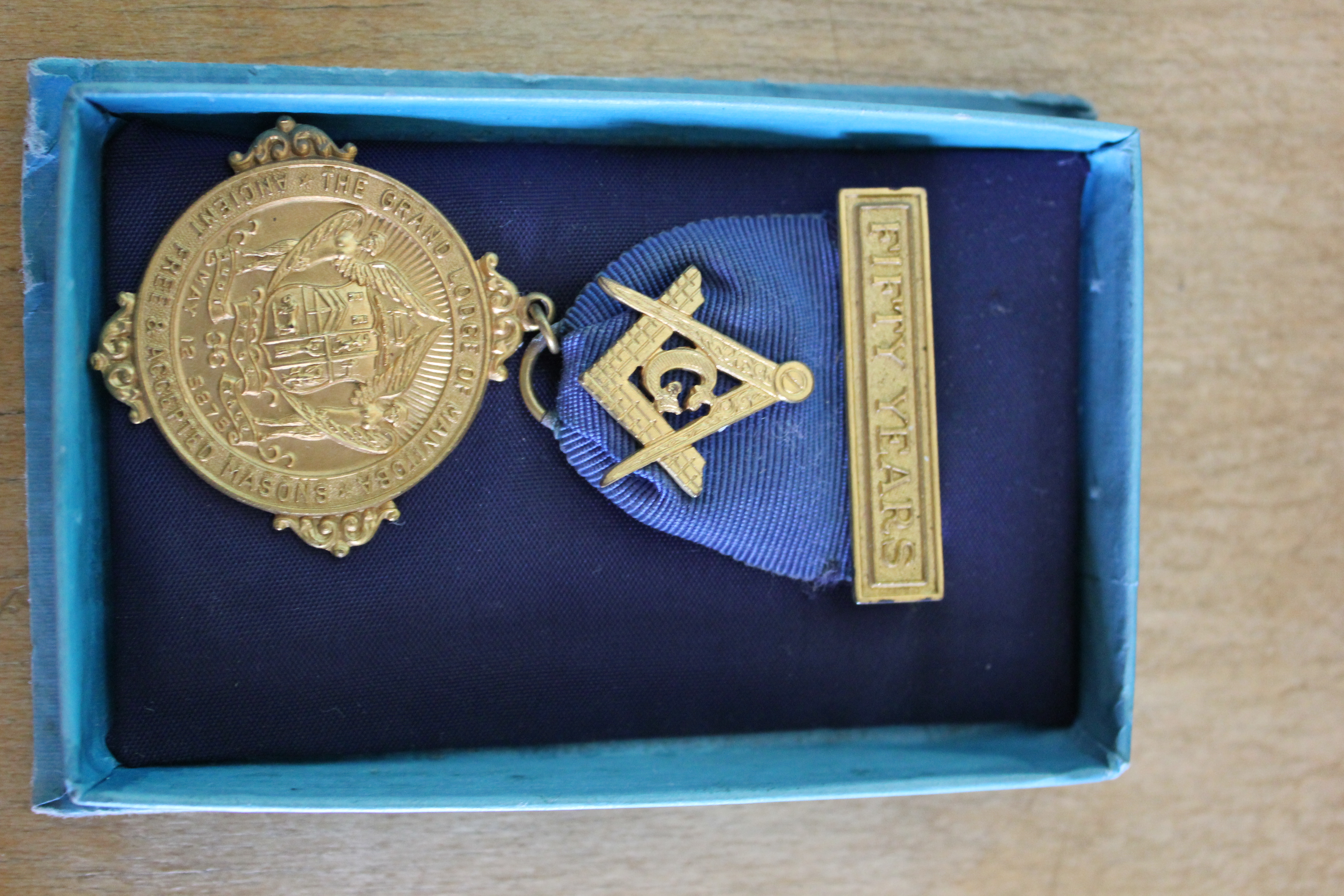 Object Desc A medal honoring fifty years with the Grand Lodge of Manitoba: Ancient Free and Accepted Masons.
