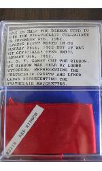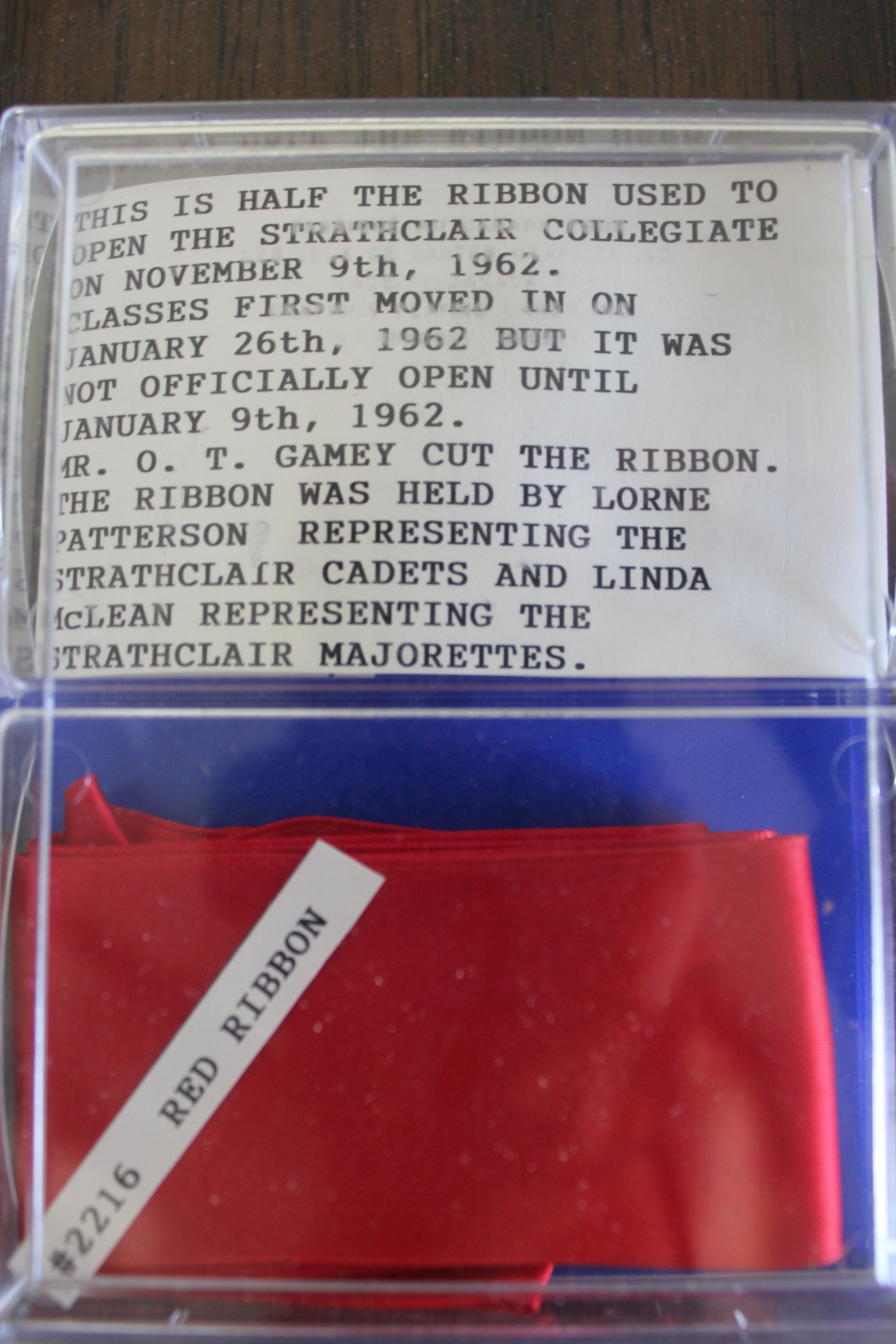 Object Desc This is half of the ribbon used to open the Strathclair Collegiate on November 9th, 1962. It was cut by Mr. O. T. Gamey and was held by Lorne Patterson representing the Strathclair Cadets and Linda McLean representing the Strathclair Majorettes.