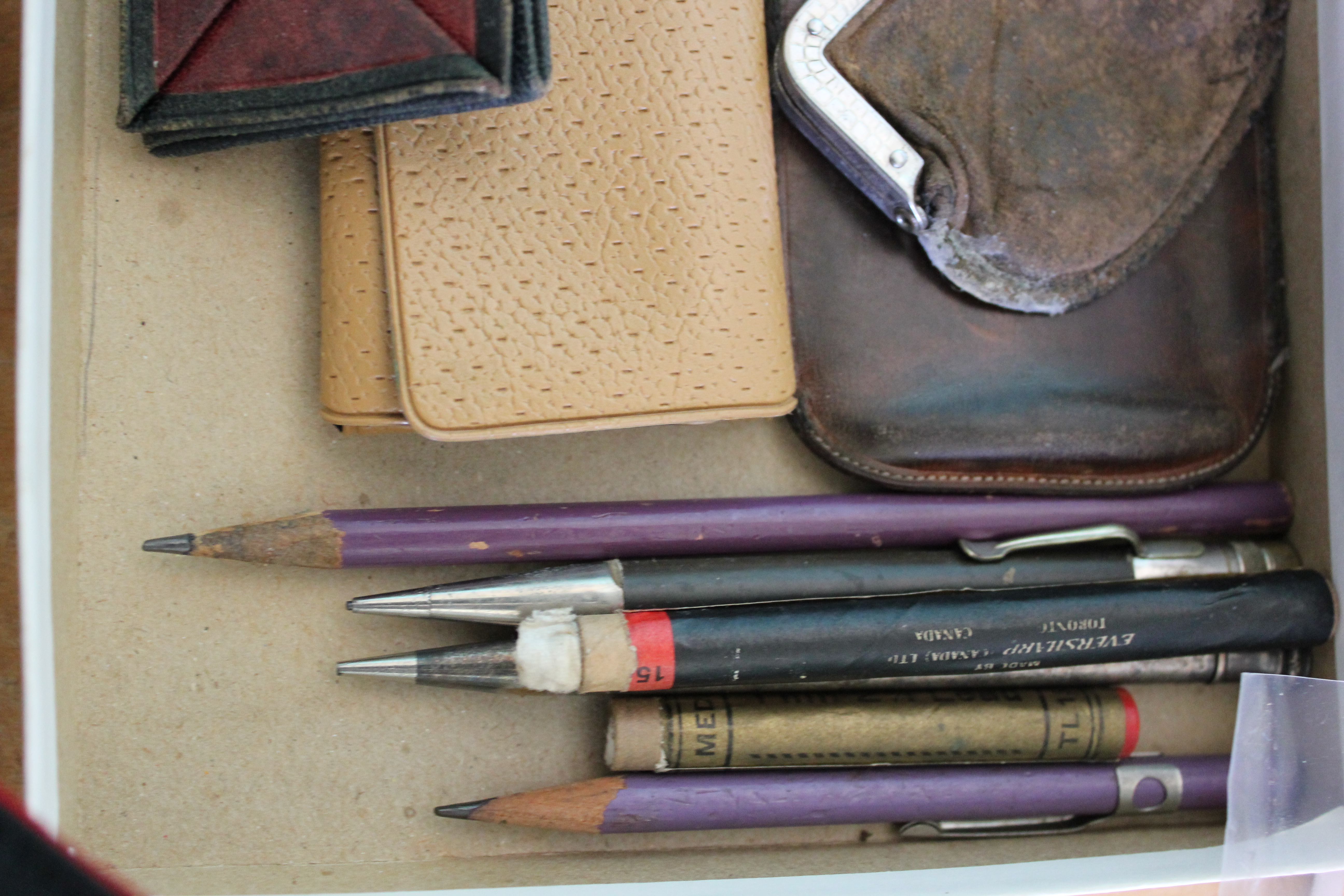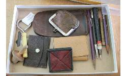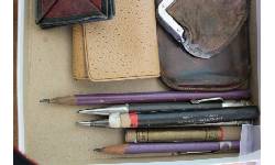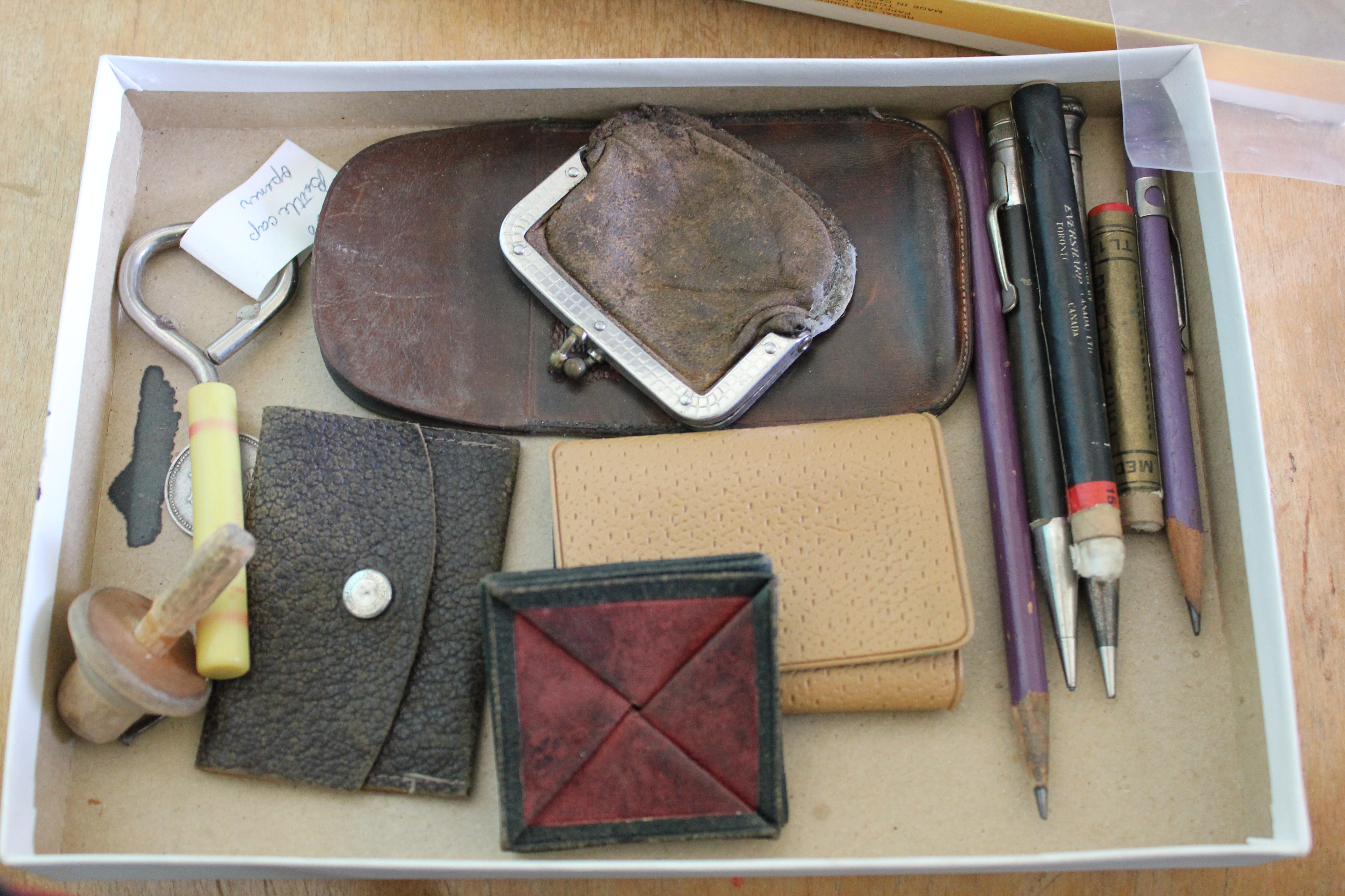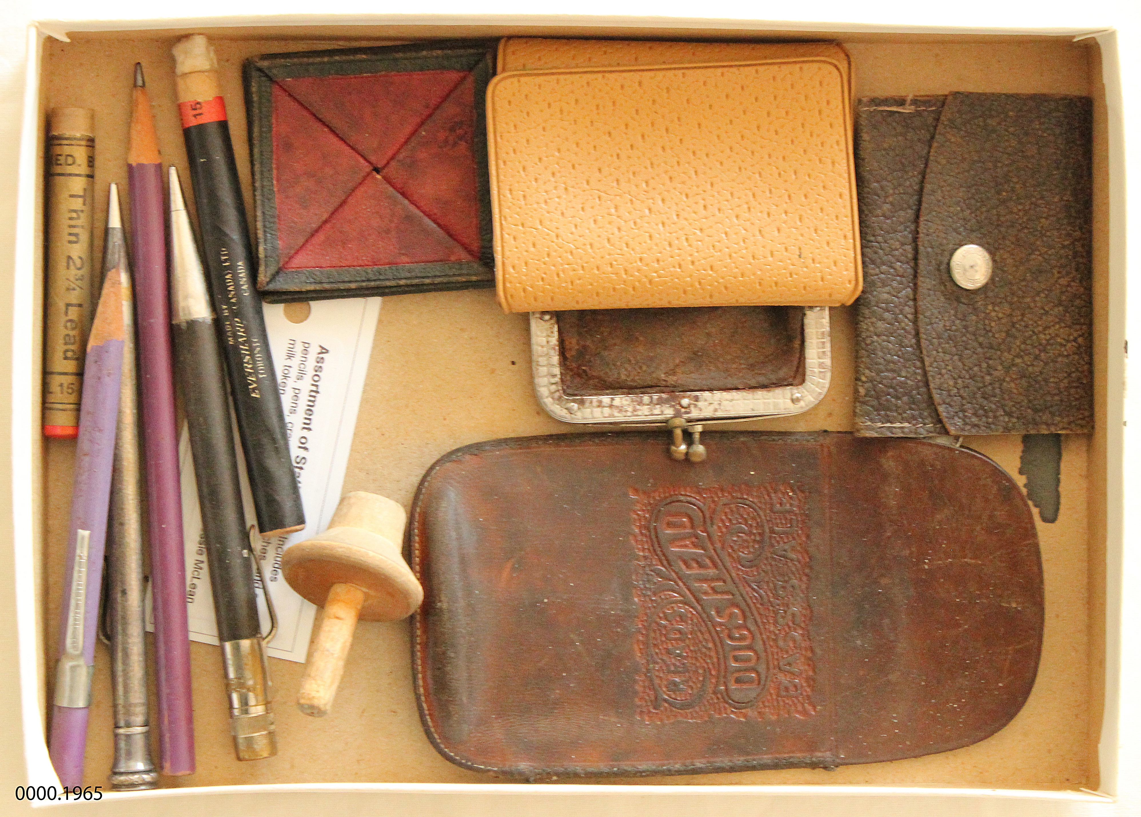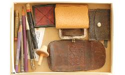 Object Desc Includes pencils, pens, crayons, leather pouches, and a milk token.