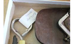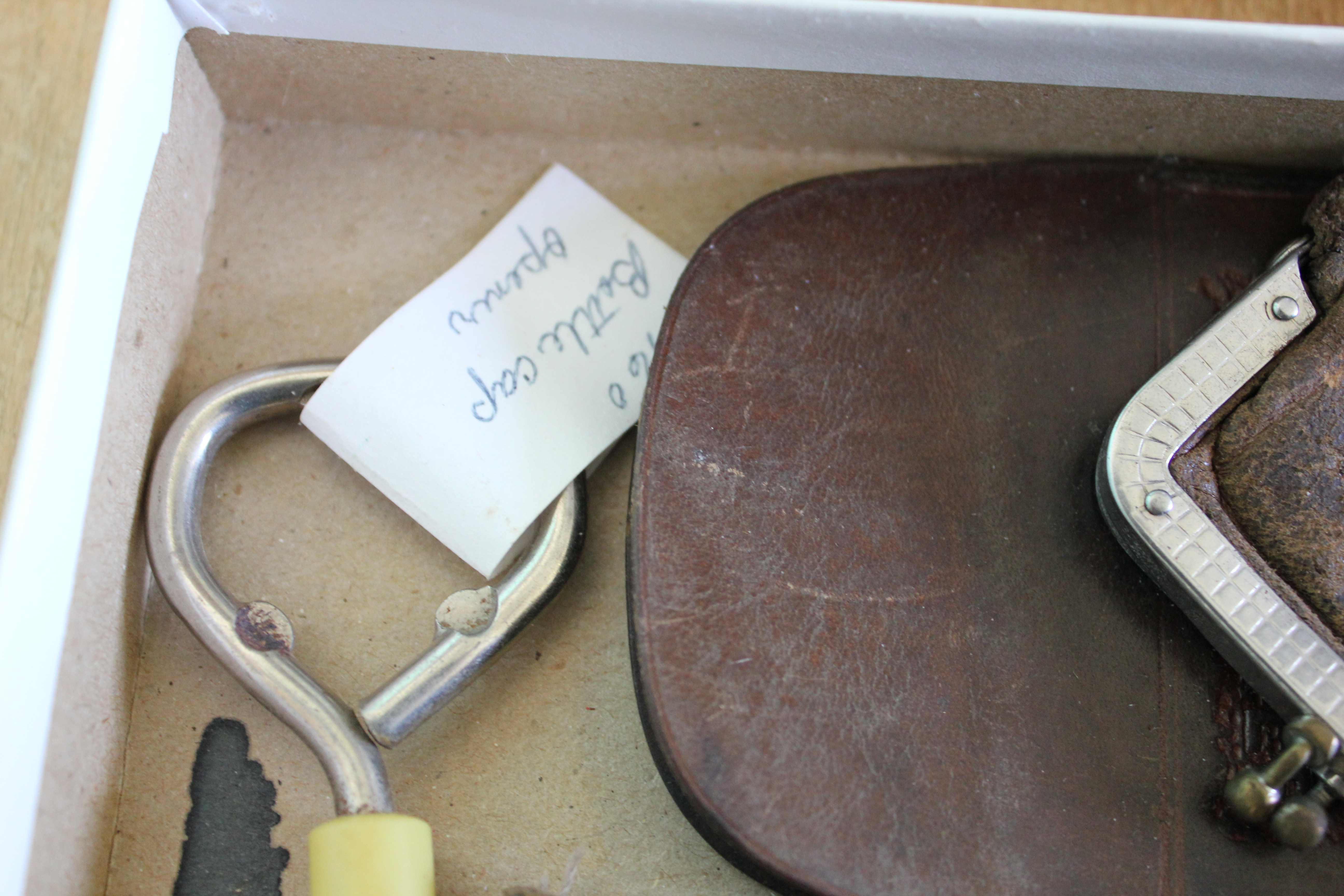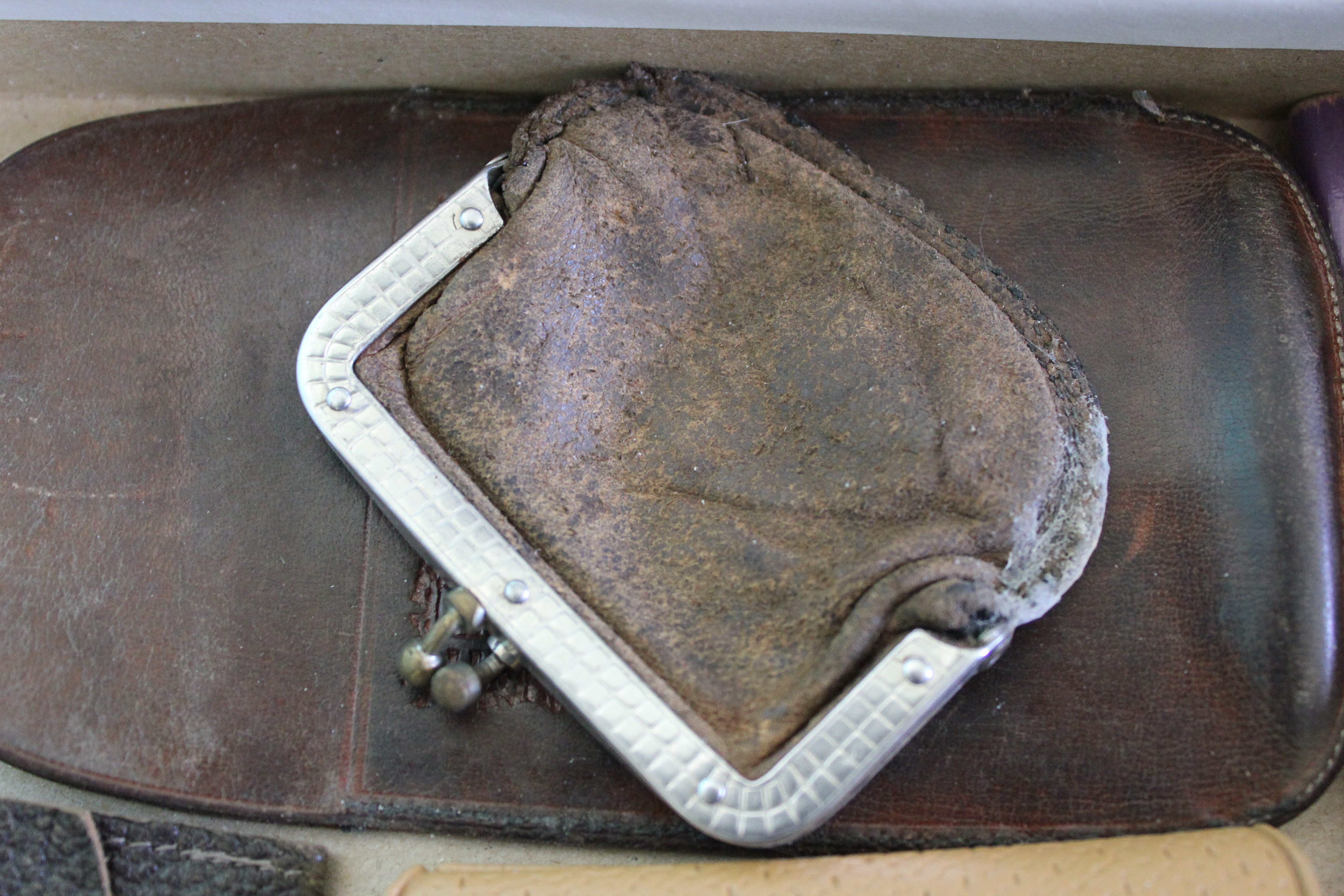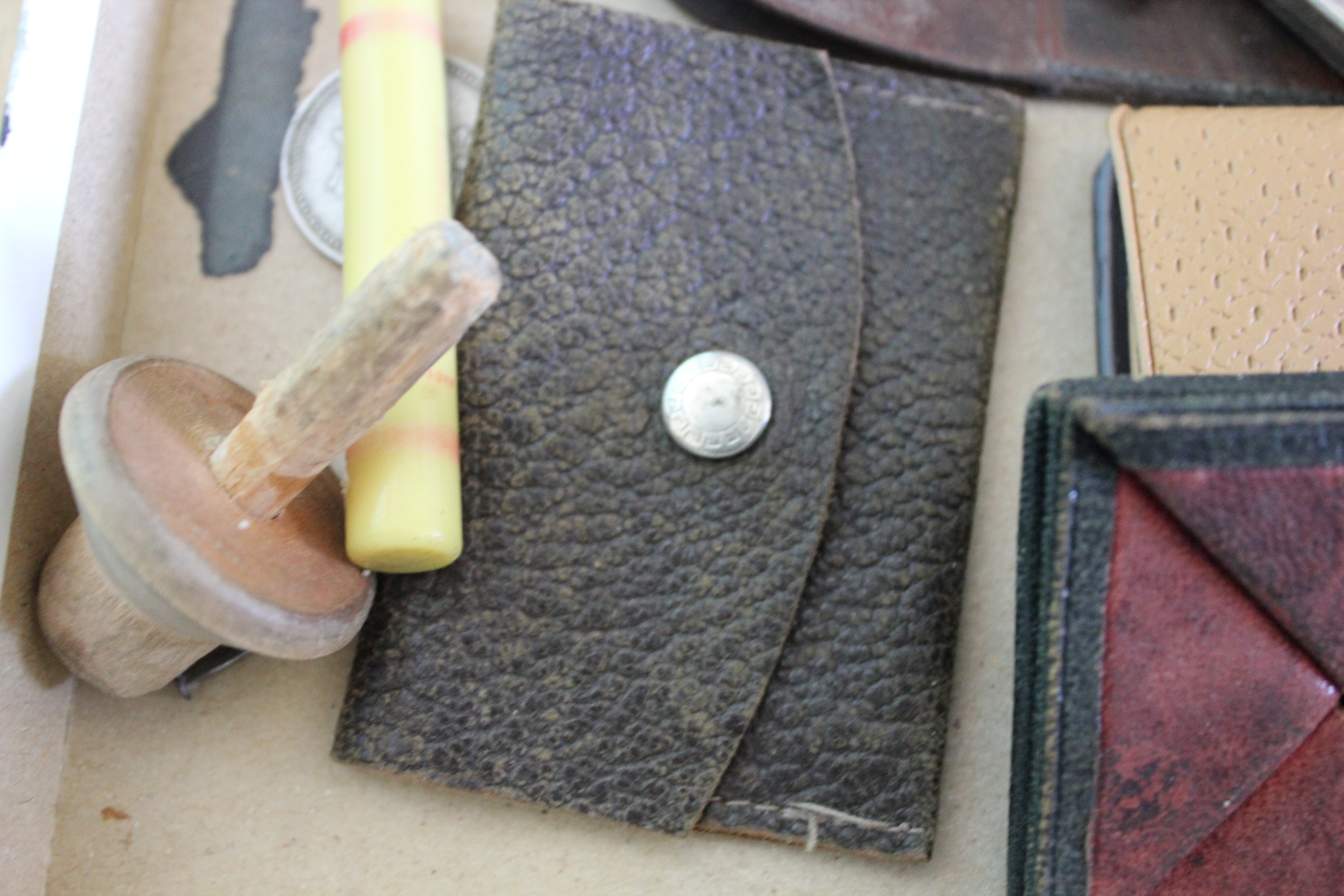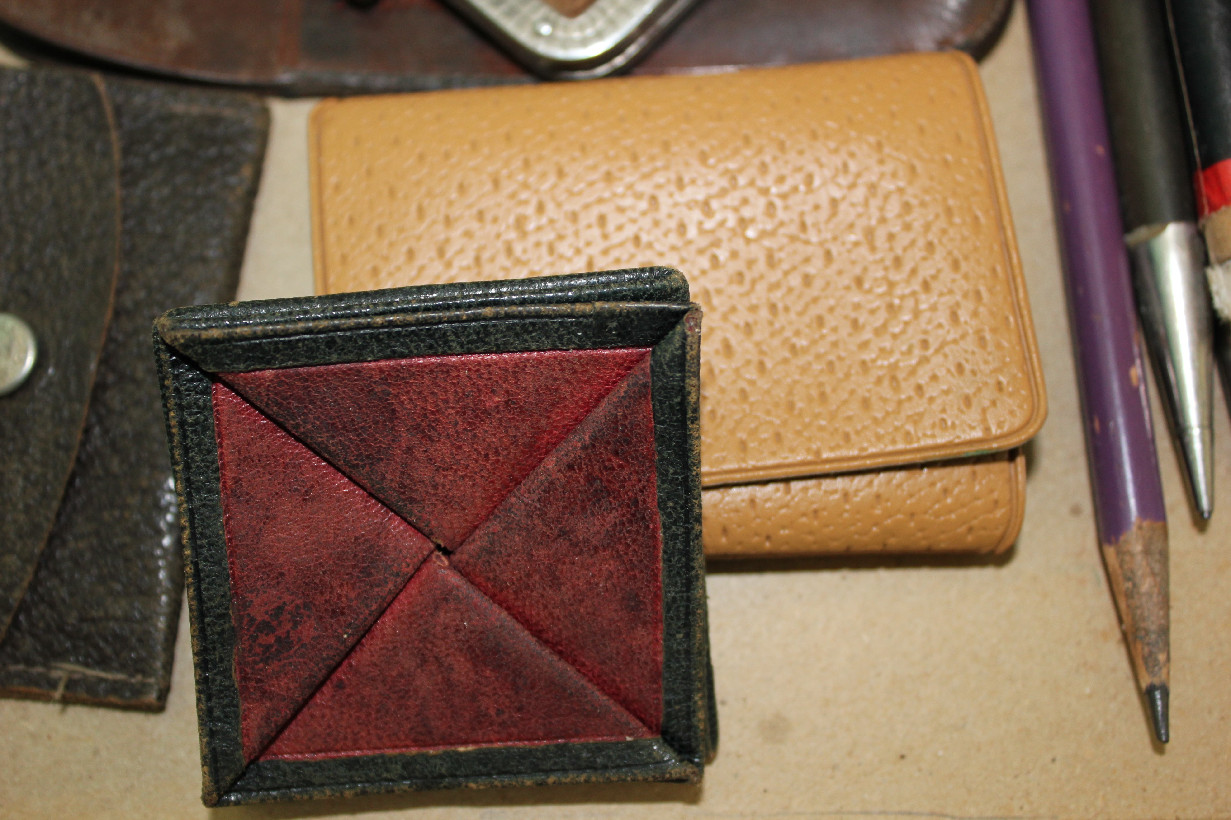 Object Desc Includes pencils, pens, crayons, leather pouches, and a milk token.