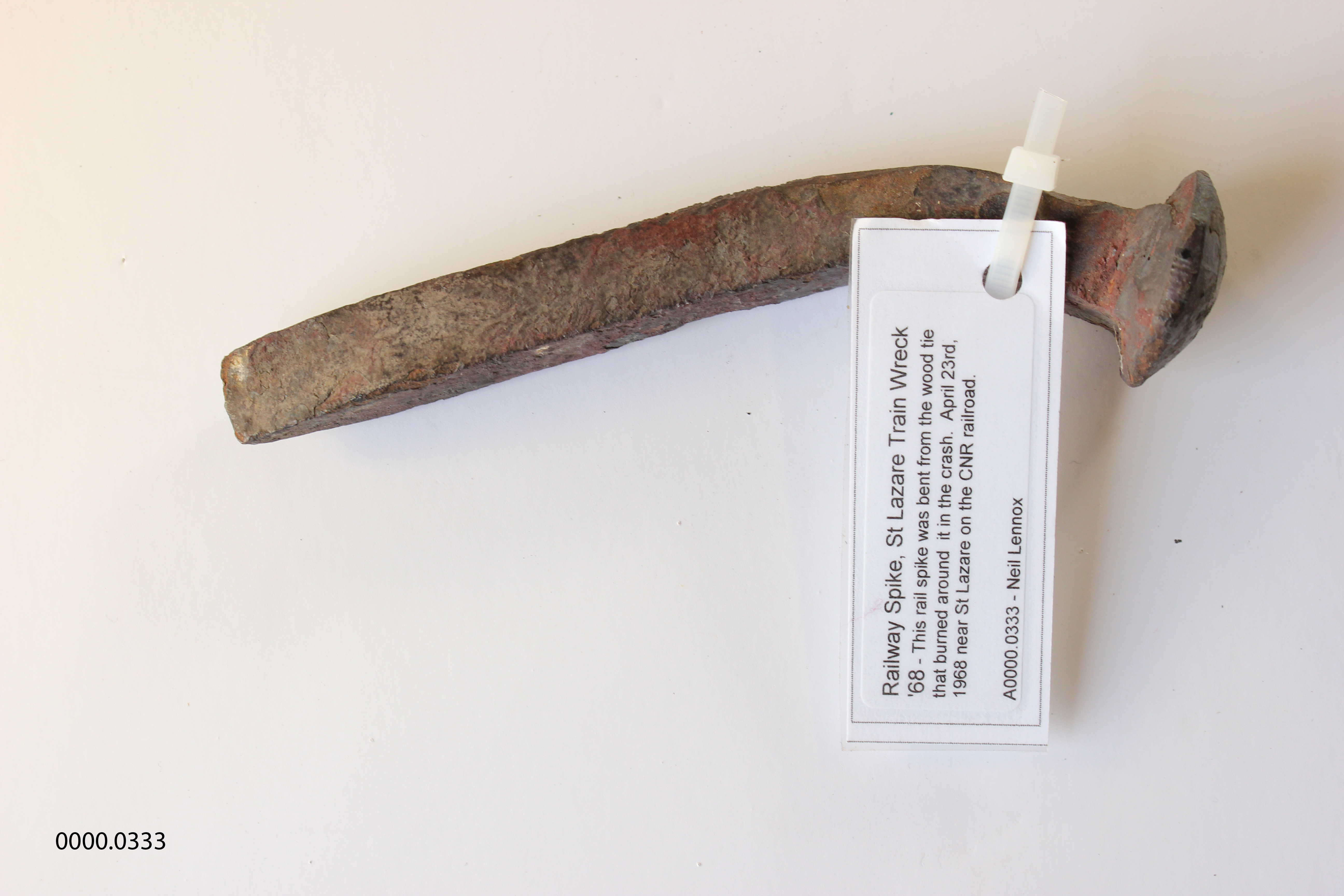 Object Desc This rail spike was bent from the wood tie that burned around around it in the crash. This is a piece of a small collection of items that was found near the train wreck site that occured April 23, 1968 near St Lazare on the CNR railroad.