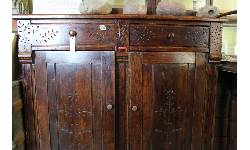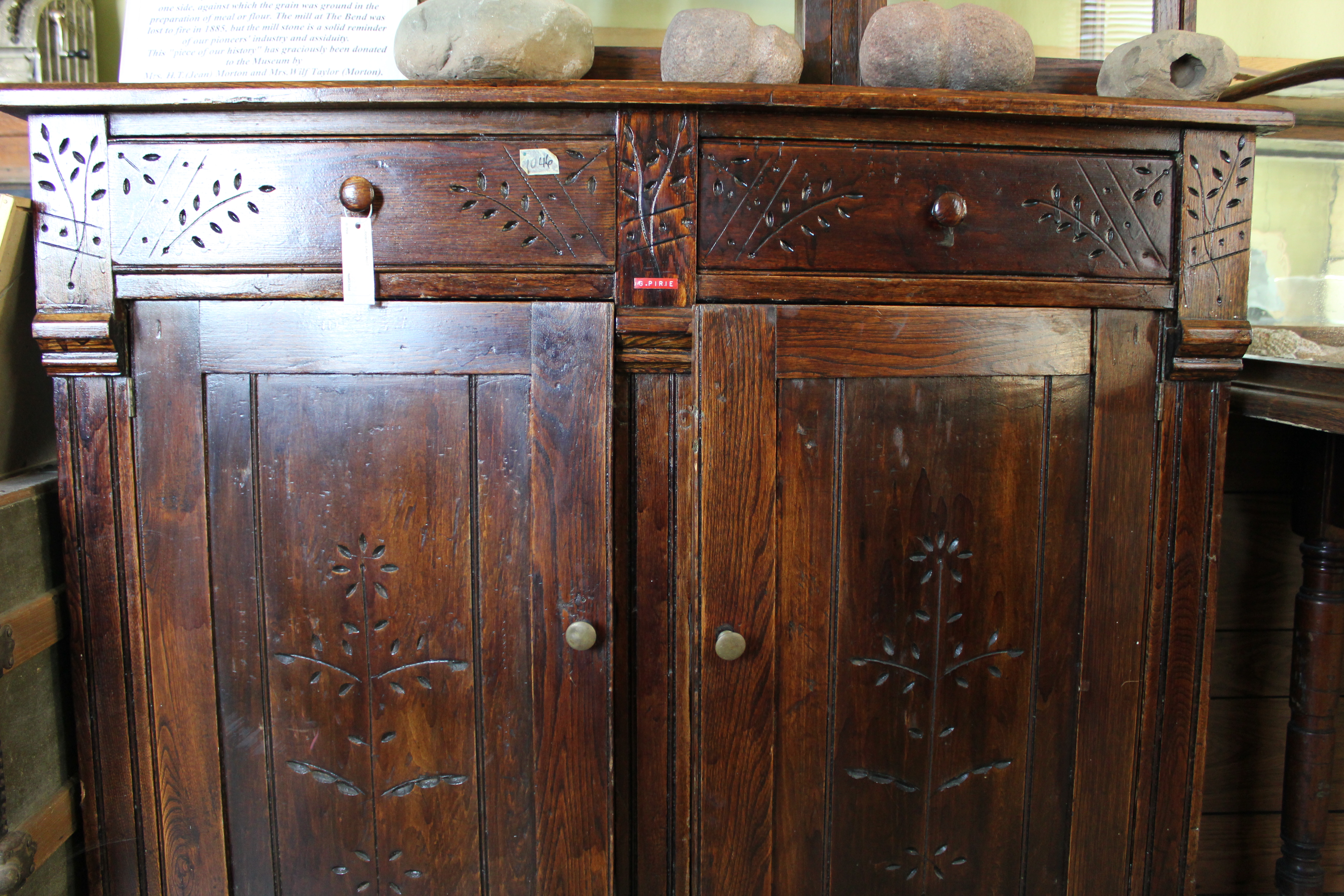 Object Desc A rich wooden cabinet with leaf designs impressed upon the wood.