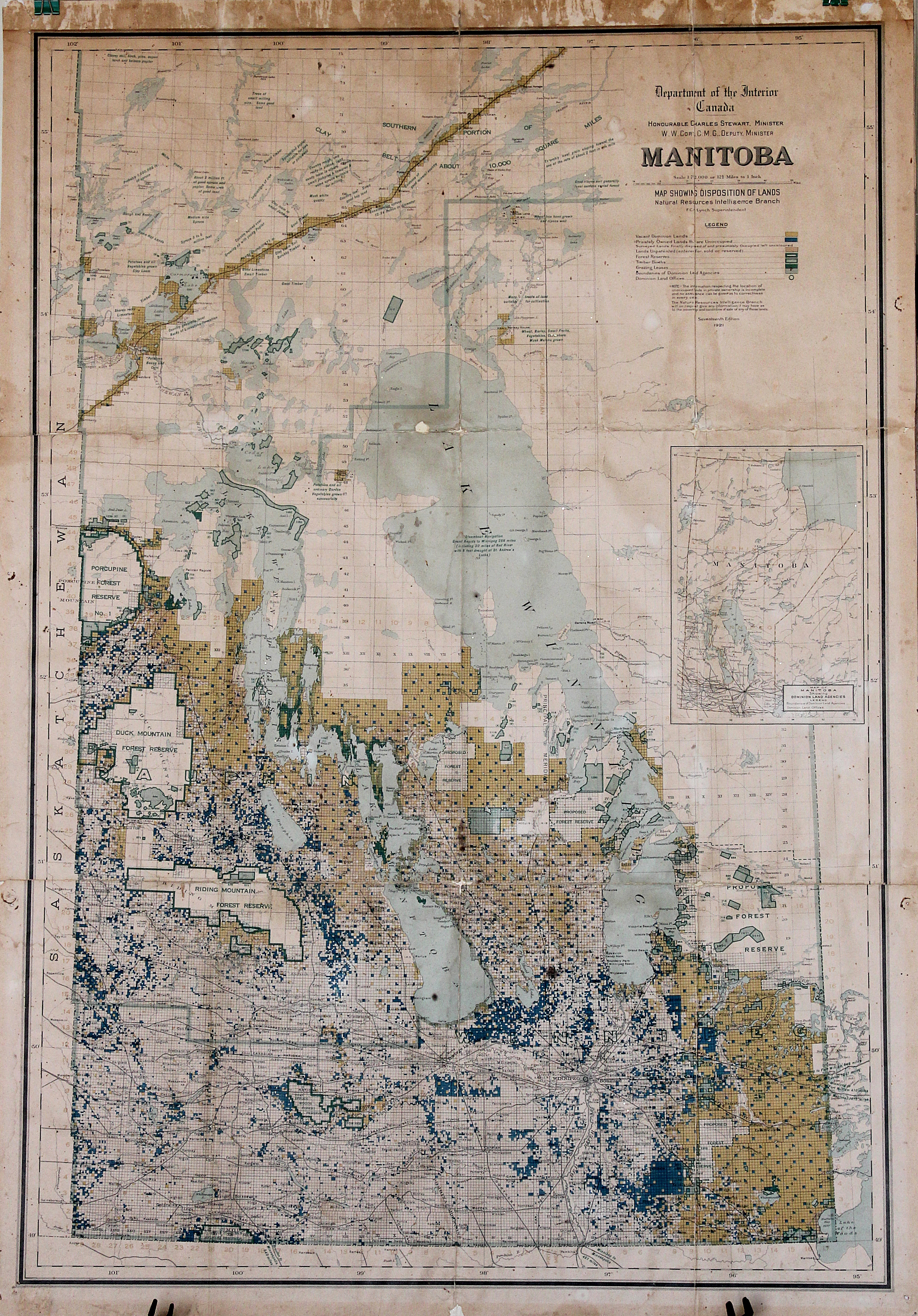 Object Desc Department of the Interior Canada map, showing disposition of lands from 1921- Manitoba.