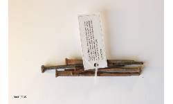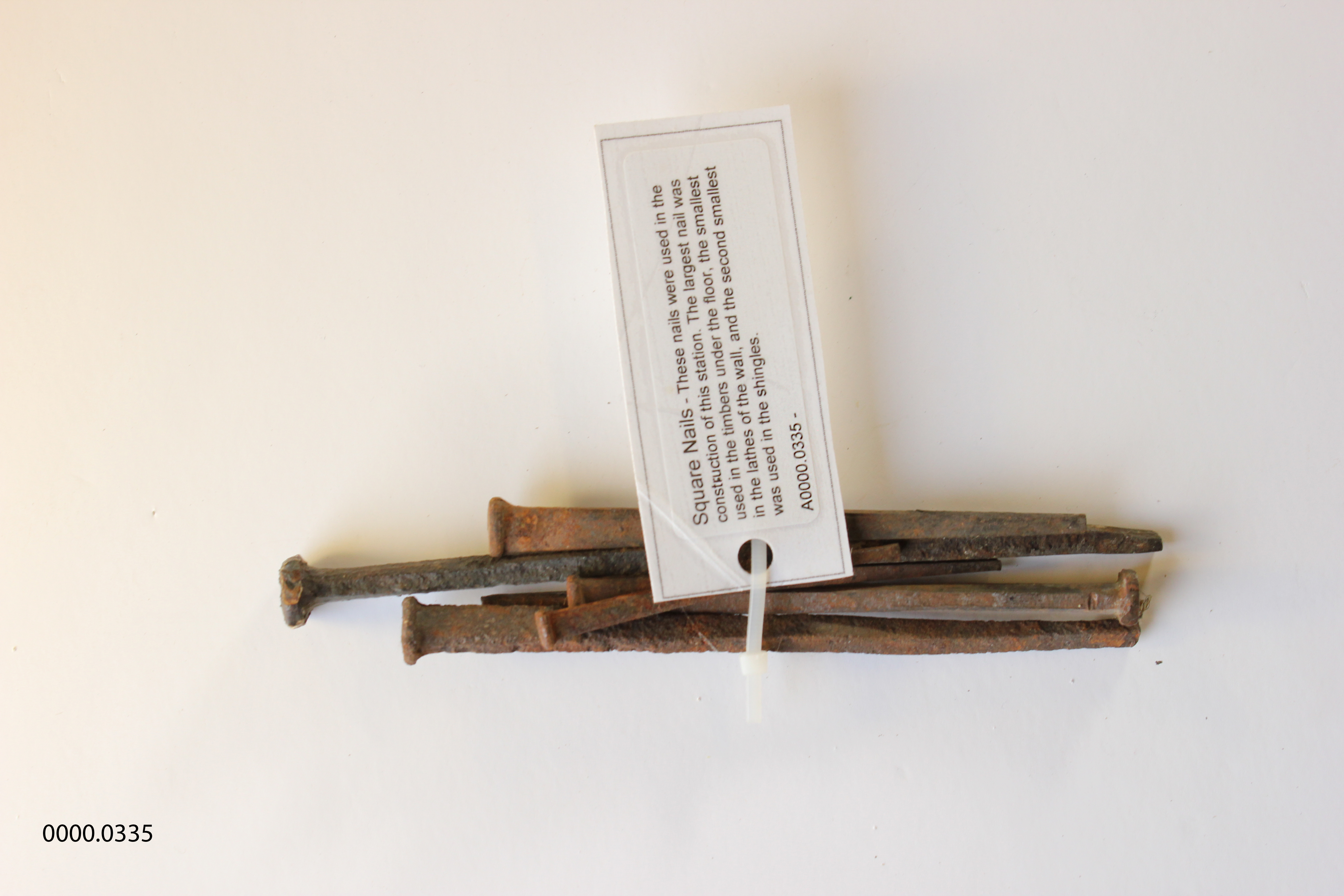 Object Desc These antique square nails were used in the construction of this station, moved to this location in 1972. The largest nail was used in the timbers under the floor, the smallest in the lathes of the wall, and the second smallest was used in the shingles.