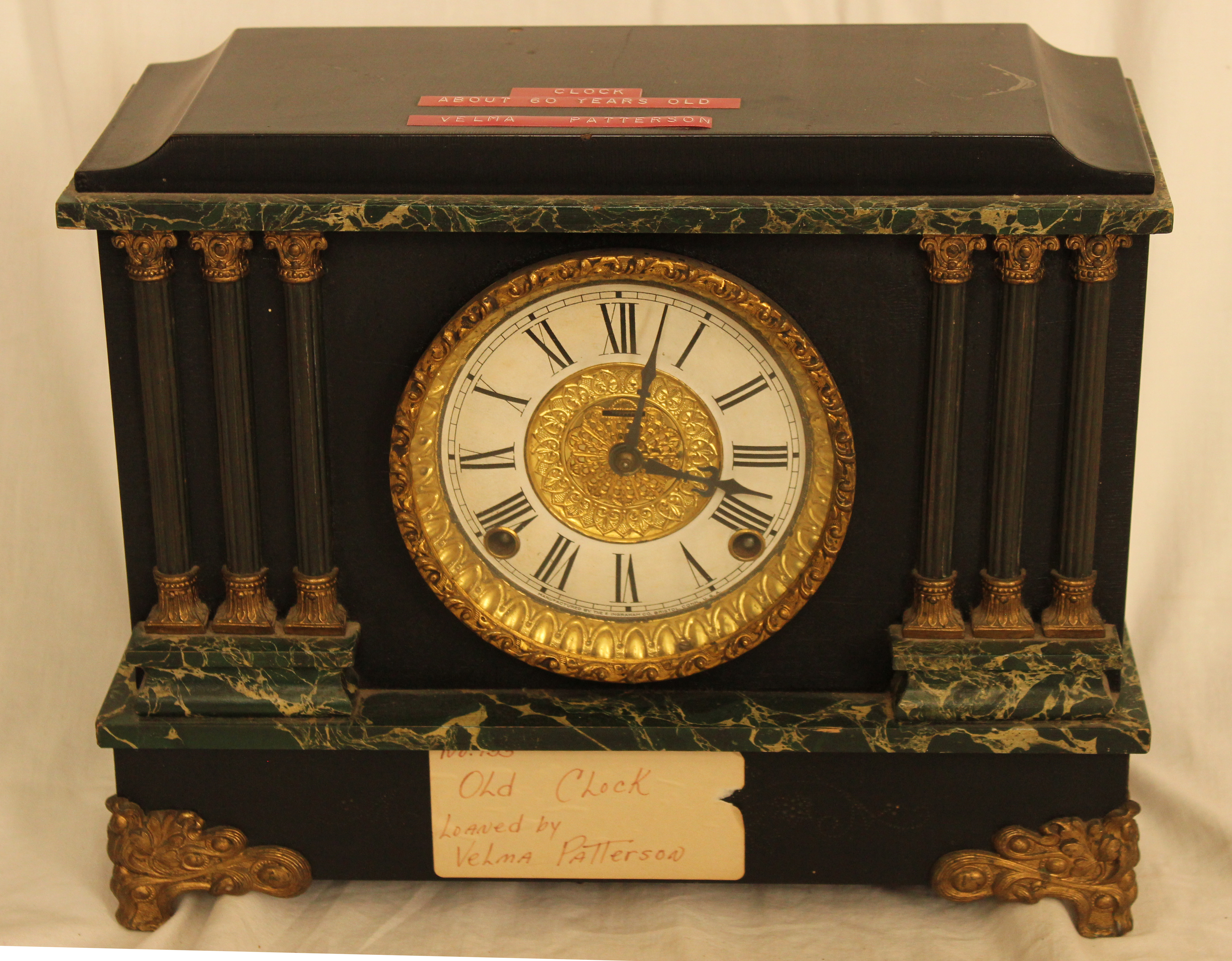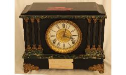 Object Desc Mantel Clock. Very ornate with dark green marnle trim and metal feet.