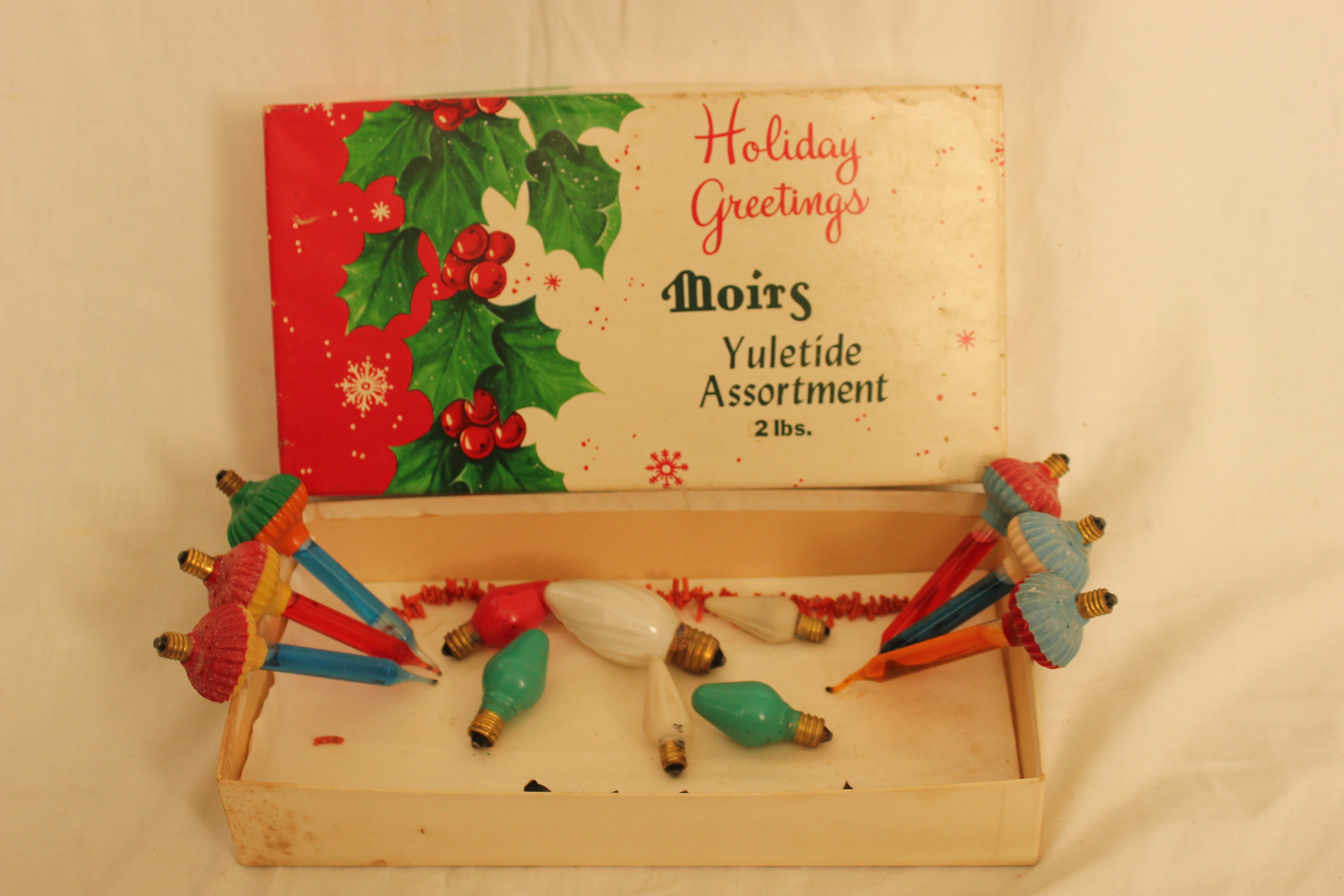 Object Desc Christmas lights and beading kit in Moirs Yuletide asortment chocolate box. Circa 1950's