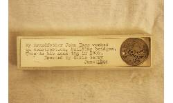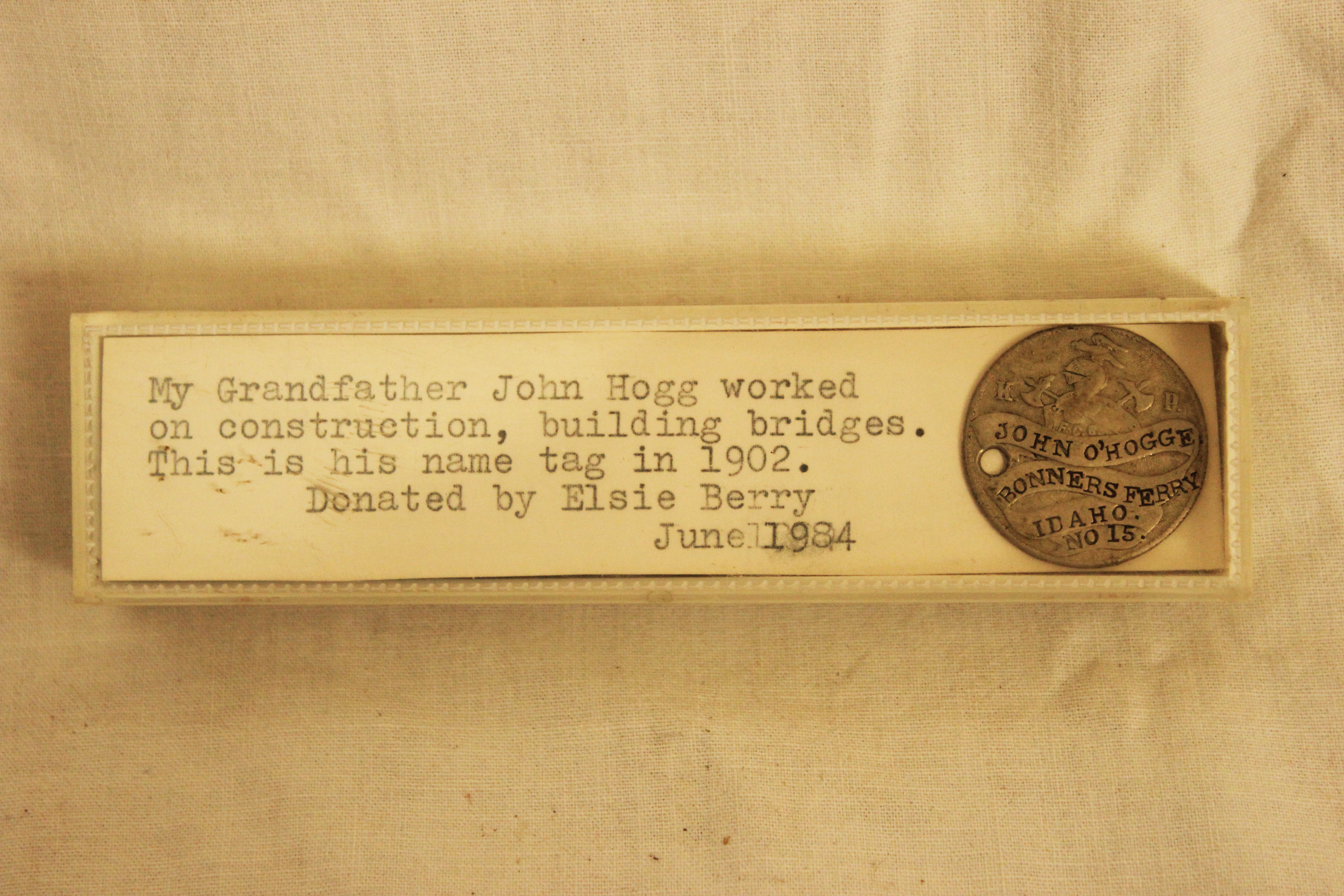Object Desc Elsie Berry's grandfather, John Hogg, worked on construction, building bridges(1902). These metal badges could be used to identify victims in case of accident. Also used by miners.