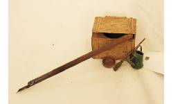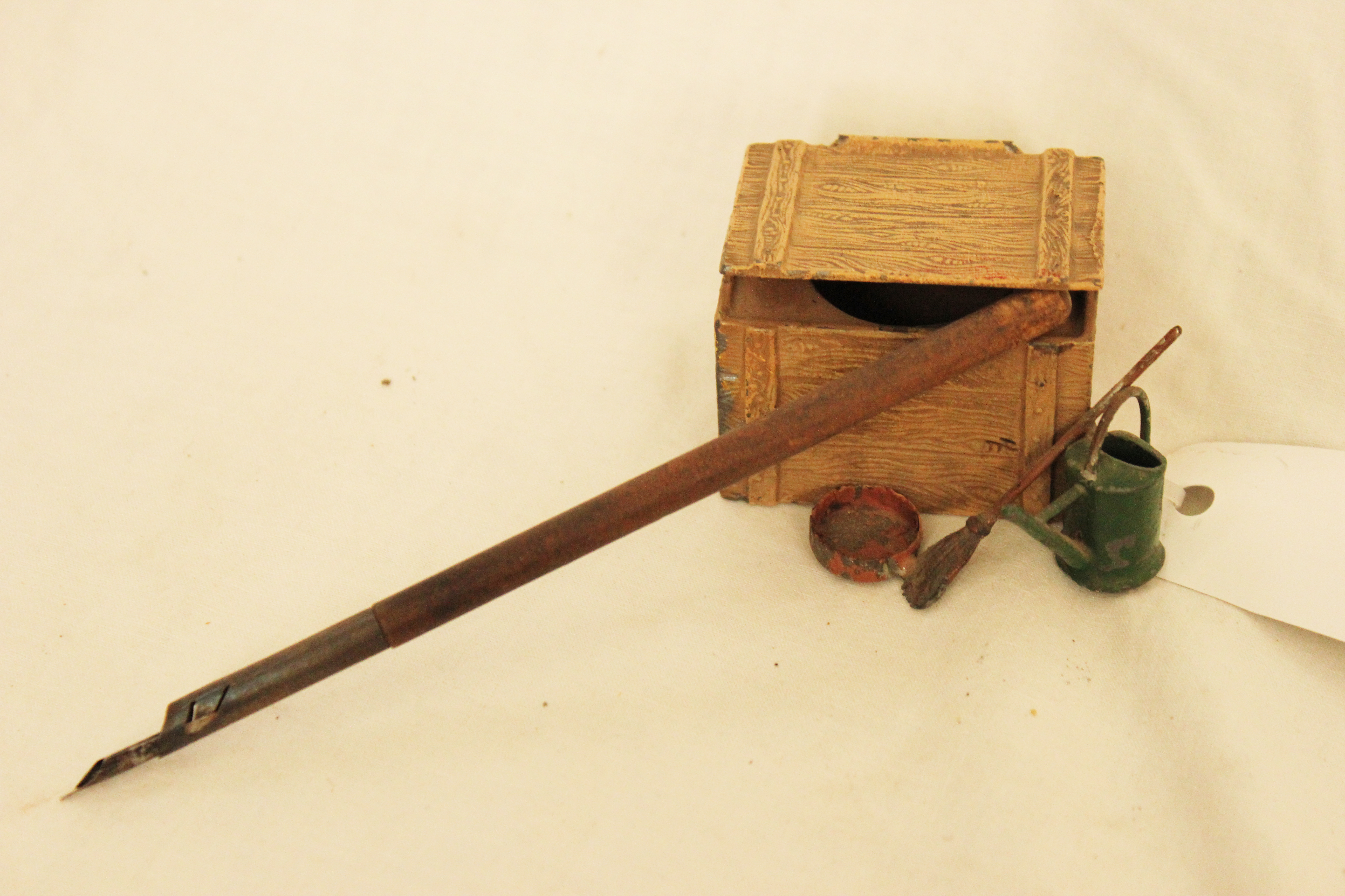 Object Desc An inkwell that looks like a wooden crate with a broom, watering can, and a bowl around it.