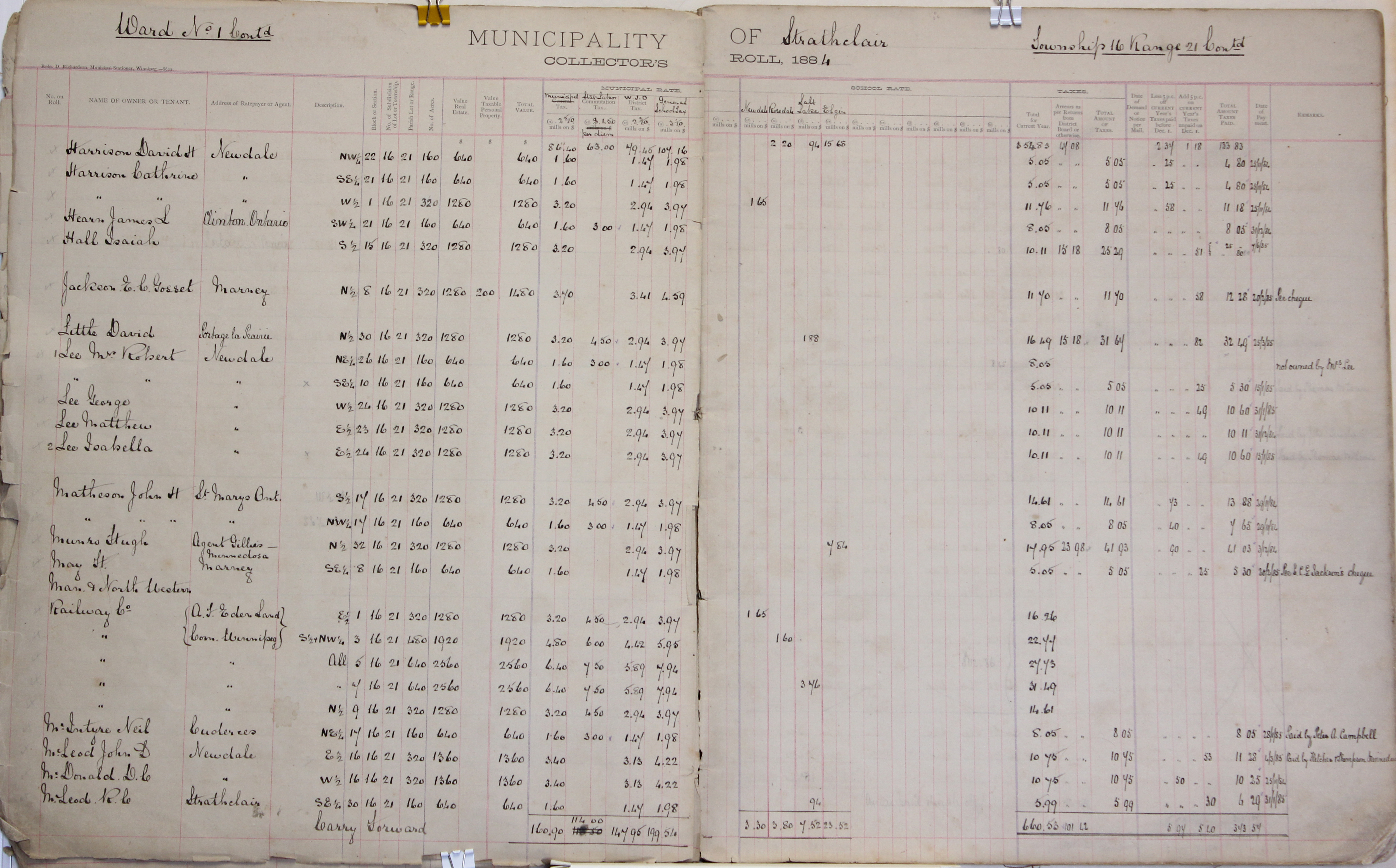 Description Harrison David H NW 22-16-21, Harrison Catherine SE 21-16-21, Harrison Catherine W 1-16-21, Hearn James L SW 21-16-21, Hall Isaiah S 15-16-21, Jackson E. C. Gosset N 8-16-21, Little David N 30-16-21, Lee Mrs. Robert NE 26-16-21, Lee Mrs. Robert SE 10-16-21, Lee George W 24-16-21, Lee Matthew E 23-16-21, Lee Isabella E 24-16-21, Matheson John H S 17-16-21, Matheson John H NW 17-16-21, Munro Hugh N 32-16-21, May H SE 8-16-21, Man. & Northwestern Railway Co. E 1-16-21, Man. & Northwestern Railway Co. S 3-16-21, Man. & Northwestern Railway Co. NW 3-16-21, Man. & Northwestern Railway Co. 5-16-21, Man. & Northwestern Railway Co. 7-16-21, Man. & Northwestern Railway Co. N 9-16-21, McIntyre Neil NE 17-16-21, McLeod John D E 16-16-21, McDonald D.C. W 16-16-21, McLeod R.C. SE 30-16-21