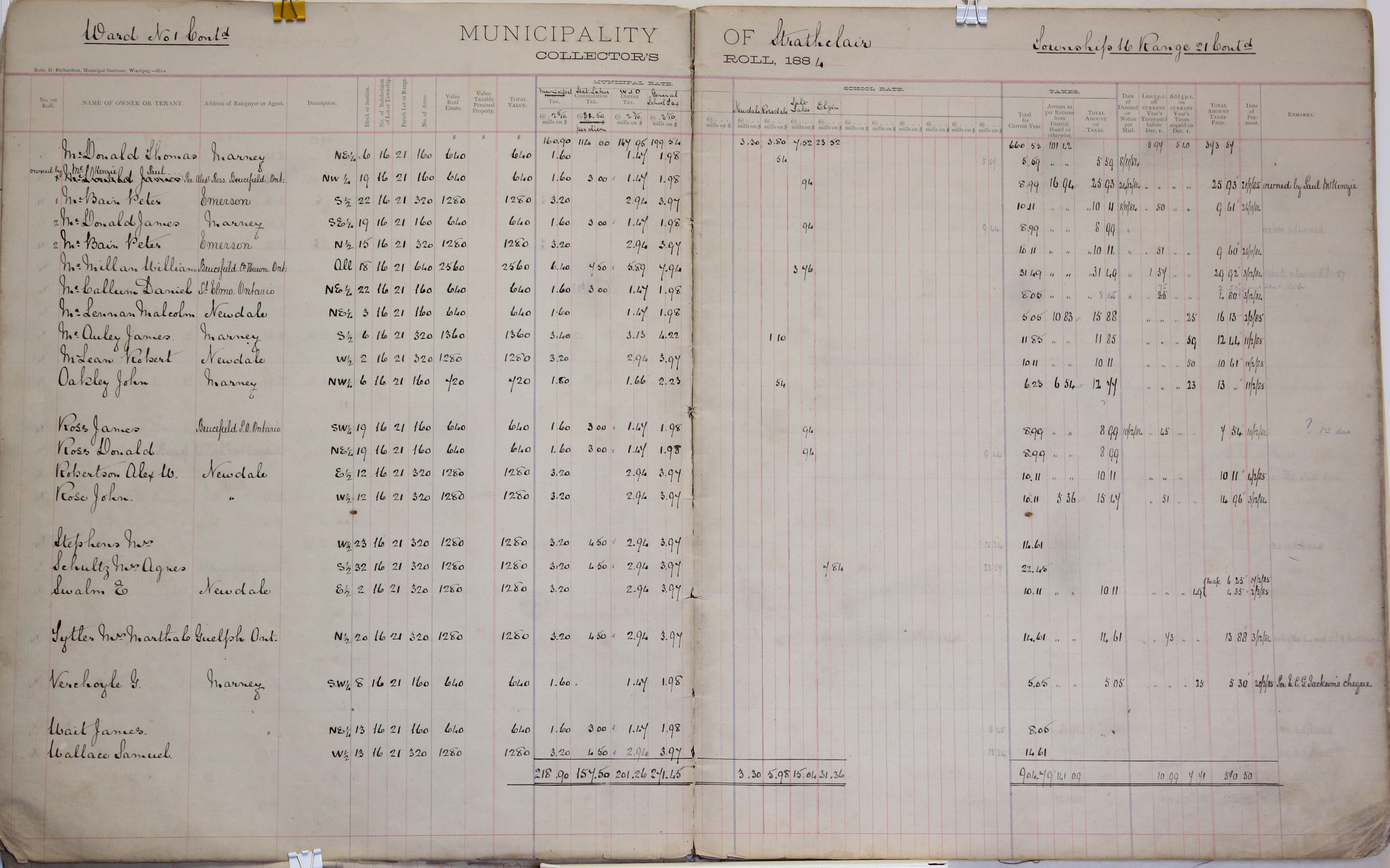 Description McDonald Thomas NE 6-16-21, McKenzie Paul NW 19-16-21, McBain Peter S 22-16-21, McDonald James SE 19-16-21, McBain Peter N 15-16-21, McMillan William 18-16-21, McCallum Daniel NE 22-16-21, McLennan Malcolm NE 3-16-21, McAuley James S 6-16-21, McLean Robert W 2-16-21, Oakley John NW 6-16-21, Ross James SW 19-16-21, Ross Donald NE 19-16-21, Robertson Alex W E 12-16-21, Rose John W 12-16-21, Stephens Mrs. W 23-16-21, Schultz Mrs. Agnes S 32-16-21, Swalm E E 2-16-21, Lytler Mrs. Martha C N 20-16-21, Verchoyle G SW 8-16-21, Wait James NE 13-16-21, Wallace Samuel W 13-16-21