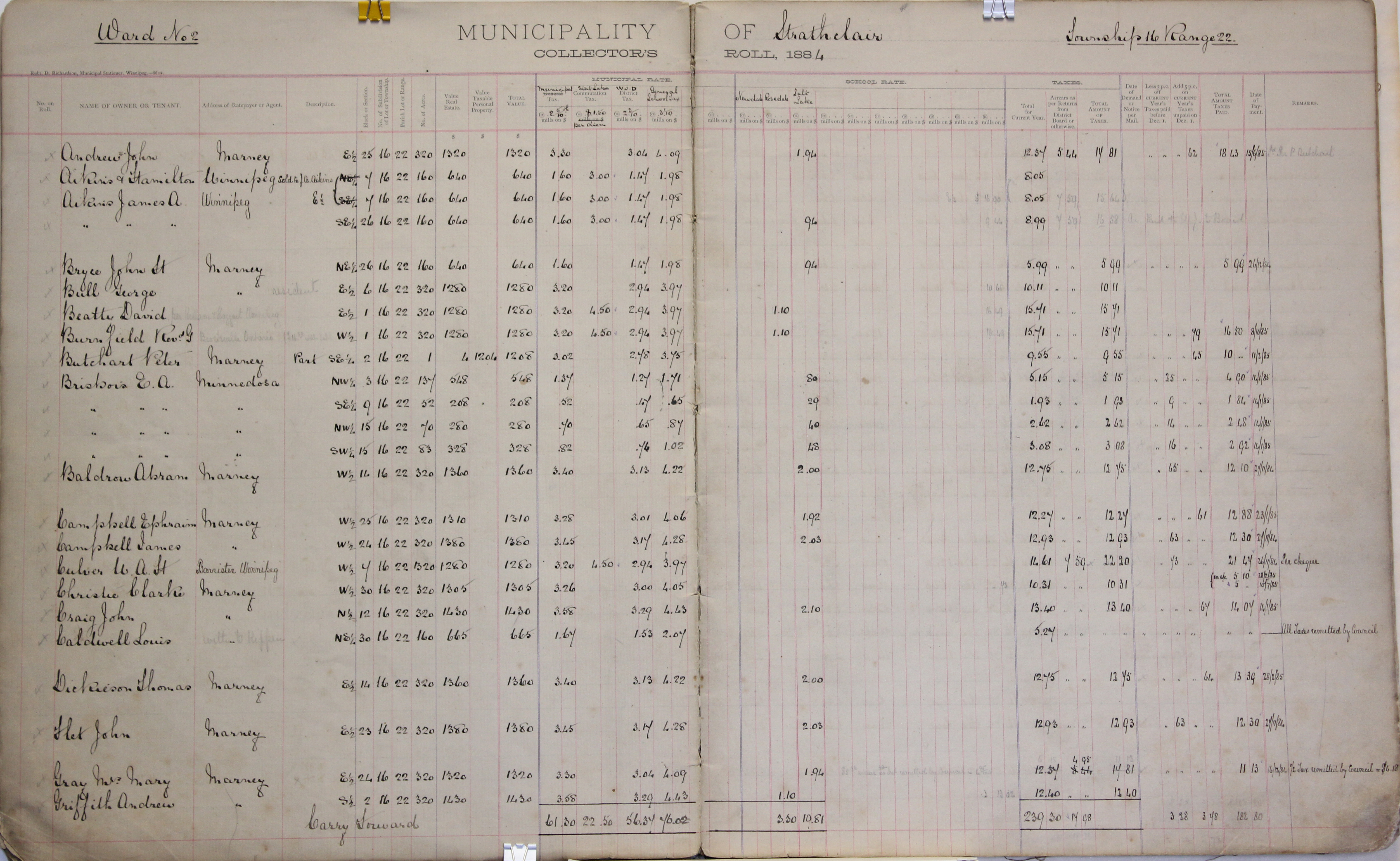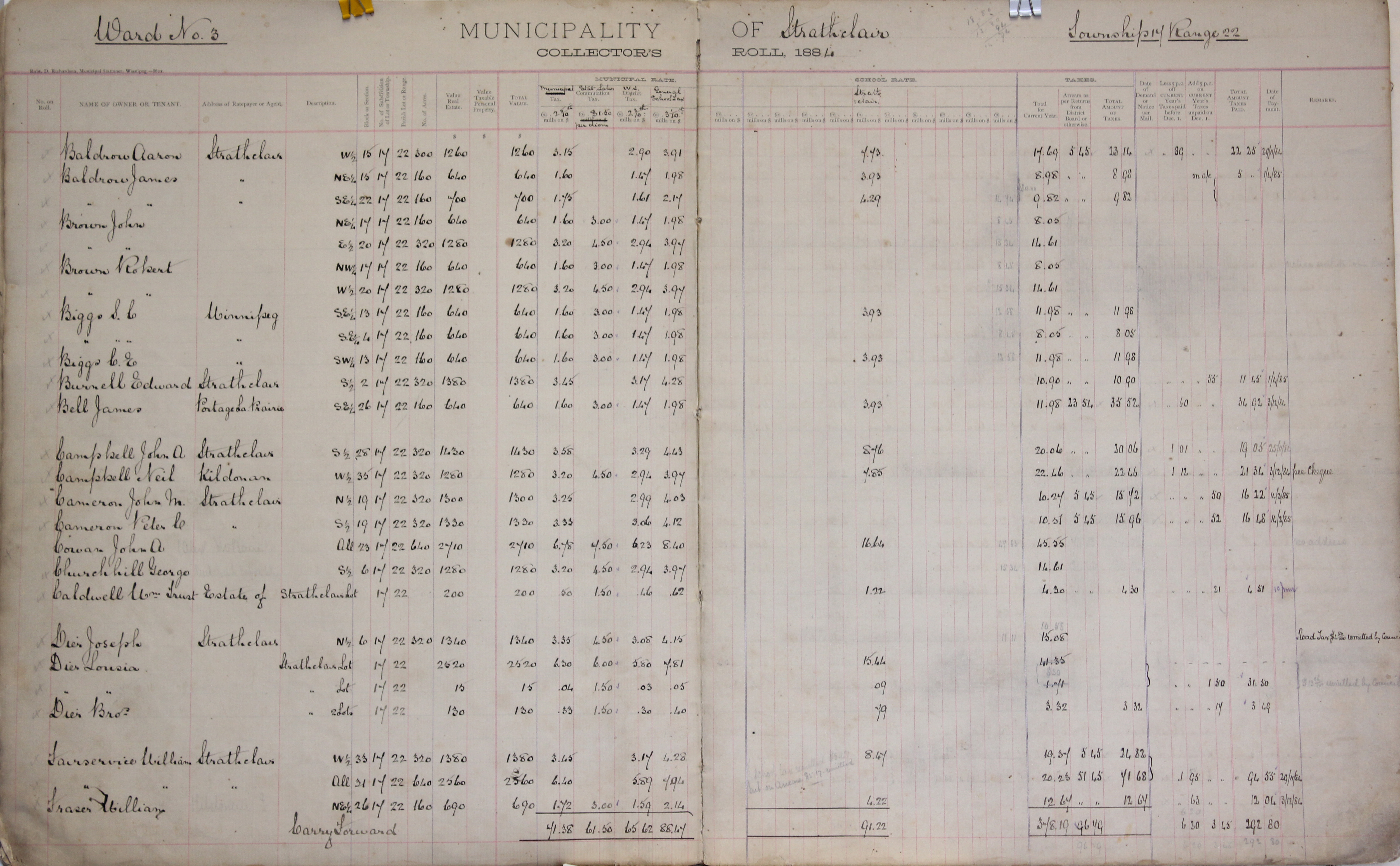 Description Baldrow Aaron W 15-17-22, Baldrow James NE 15-17-22, Baldrow James SE 22-17-22, Brown John NE 17-17-22, Brown John E 20-17-22, Brown Robert NW 17-17-22, Brown Robert W 20-17-22, Biggs S C SE 13-17-22, Biggs S C SE 4-17-22, Biggs C E SW 13-17-22, Burnell Edward S 2-17-22, Bell James SE 26-17-22, Campbell John A S 28-17-22, Campbell Neil W 35-17-22, Cameron John M N 19-17-22, Cameron Peter C S 19-17-22, Cowan John A 23-17-22, Churchill George S 16-17-22, Caldwell Wm. Trust Estate of Lot 17-22, Dire Joseph N 6-17-22, Dire Lousia Lot 17-22, Dire Bros. Lot 17-22, Fairservice William W 33-17-22, Fairservice William - 31-17-22, Fraser William NE 26-17-22