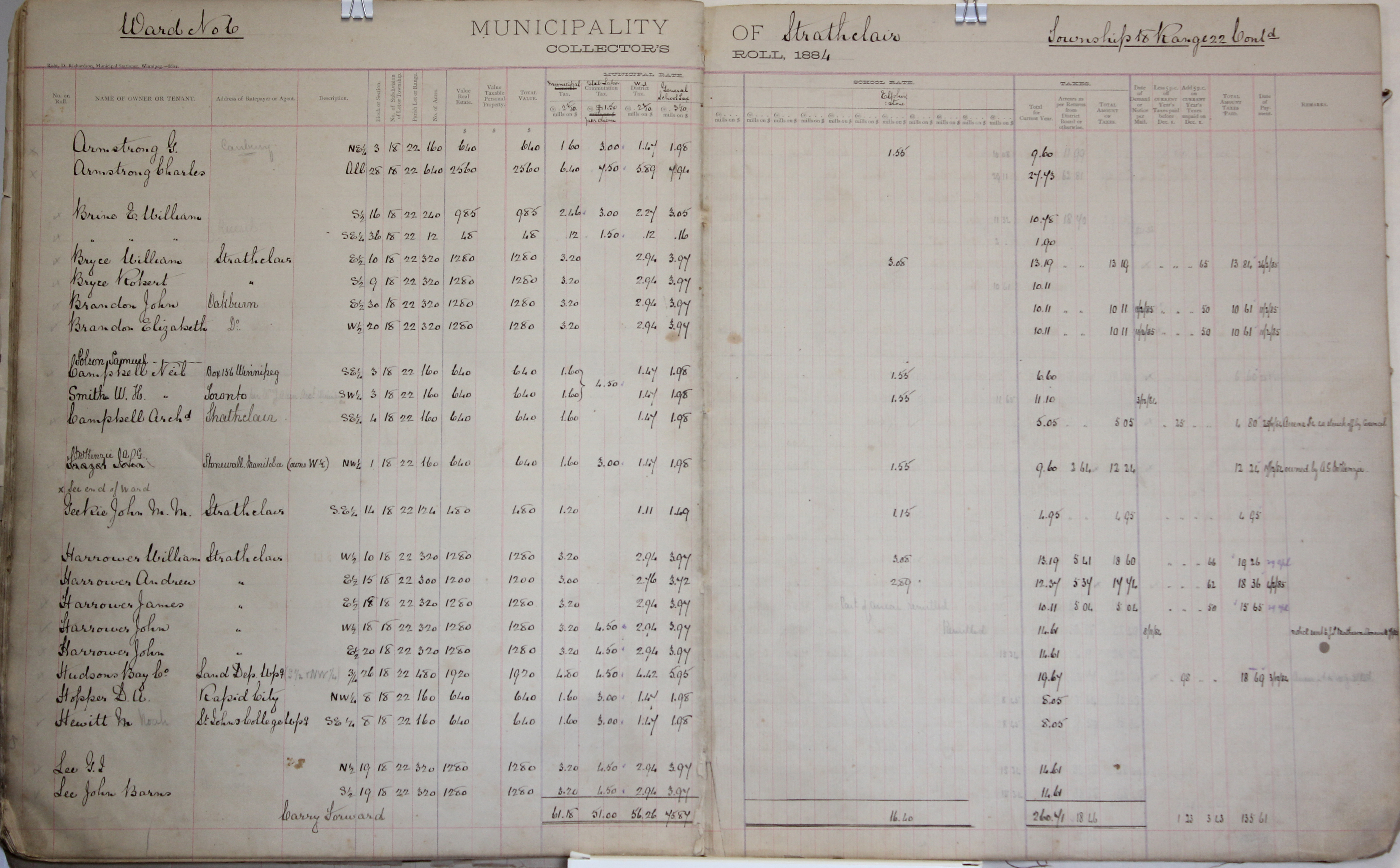 Description Armstrong G NE 3-18-22, Armstrong Charles 28-18-22, Brine E William S 16-18-22, SE 36-18-22, Bryce William E 10-18-22, Bryce Robert S 9-18-22, Brandon John E 30-18-22, Brandon Elizabeth W 20-18-22, Polson Samuel, Campbell Neil SE 3-18-22, Smith W H SW 3-18-22, Campbell Archd SE 4-18-22, McKenzie J A G NW 1-18-22, Geekie John M M SE 14-18-22, Harrower William W 10-18-22, Harrower Andrew E 15-18-22, Harrower James E 18-18-22, Harrower John - W 18-18-22, E 20-18-22, Hudson Bay Co. S 26-18-22, NW 26-18-22, Hopper D A - NW 8-18-22, Hewitt Noah SE 8-18-22, Lee G I N 19-18-22, Lee John Barns S 19-18-22