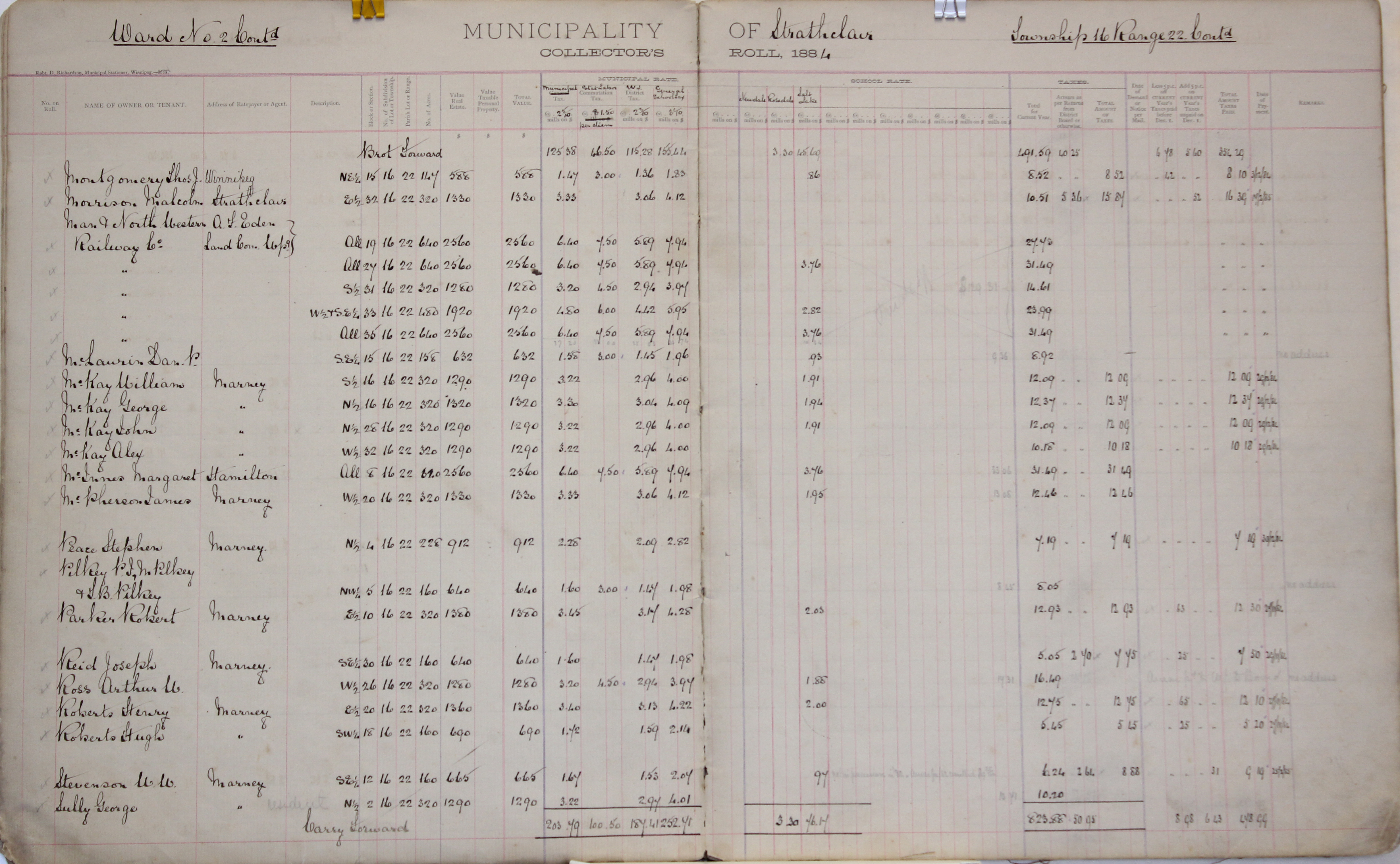 Description Montgomery Thos. J NE 15-16-22, Morrison Malcolm E 32-16-22, Man. Northwestern Railway Co. 19-16-22, Man. Northwestern Railway Co. 27-16-22, Man. Northwestern Railway Co. S 31-16-22, Man. Northwestern Railway Co. W 33-16-22, Man. Northwestern Railway Co. SE 33-16-22, Man. Northwestern Railway Co. 35-16-22, McLaurin Dan. P SE 15-16-22, McKay William S 16-16-22, McKay George N 16-16-22, McKay John N 28-16-22, McKay Alex - W 32-16-22, McInnes Margaret 8-16-22, McPherson James W 20-16-22, Peace Stephen N 4-16-22, Pilkey P I Pilkey M Pilkey G B NW 5-16-22, Parker Robert E 10-16-22, Reid Joseph SE 30-16-22, Ross Arthur W W 26-16-22, Roberts Henry E 20-16-22, Roberts Hugh SW 18-16-22, Stevenson W W SE 12-16-22, Sulley George N 2-16-22
