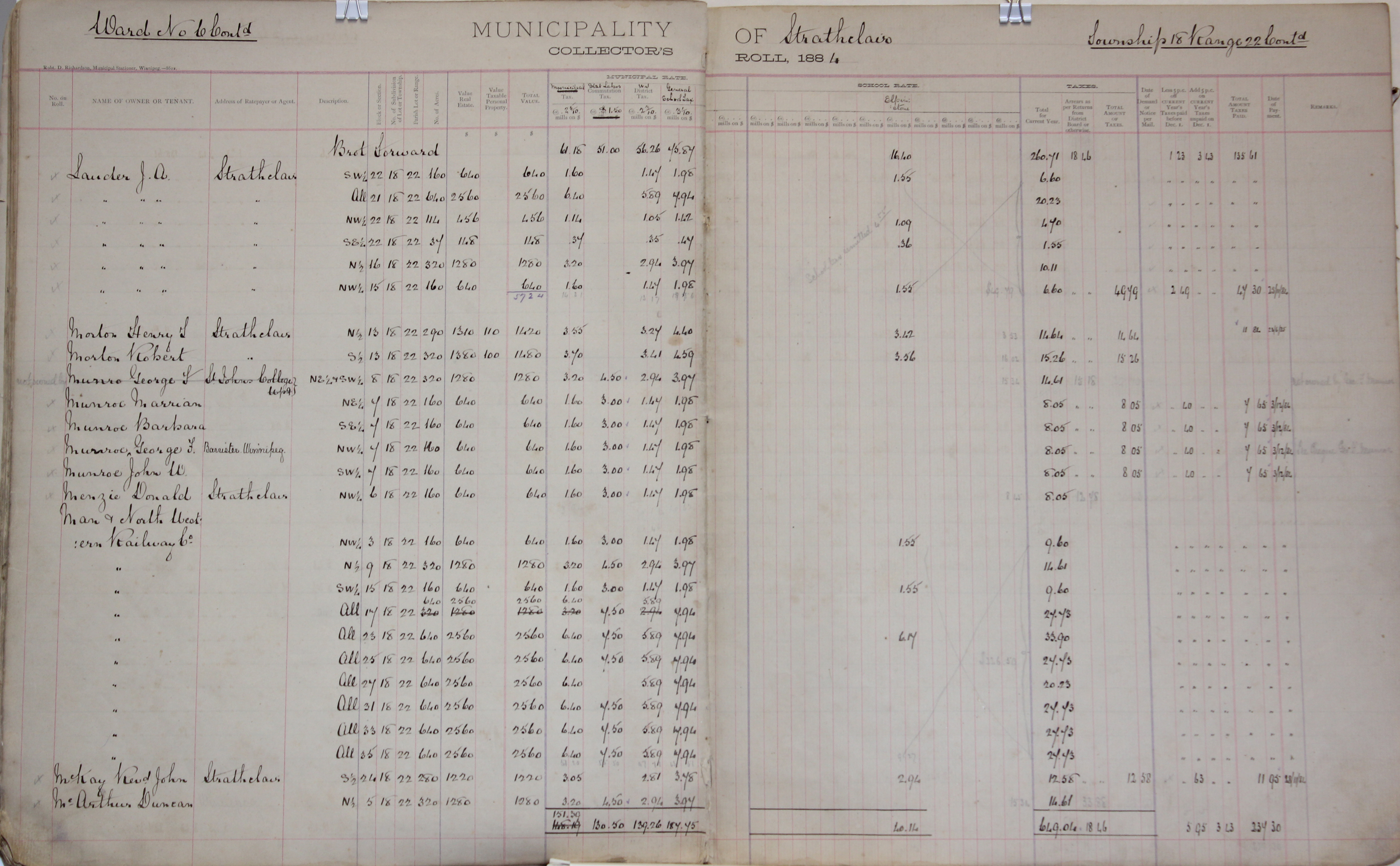Description Lauder J A SW 22-18-22, 21-18-22, NW 22-18-22, SE 22-18-22, N 16-18-22, NW 15-18-22, Morton Henry T N 13-18-22, Morton Robert S 13-18-22, Munro George T NE 8-18-22, SW 8-18-22, Munroe Marrian NE 7-18-22, Munroe Barbara SE 7-18-22, Munroe George F NW 7-18-22, Munroe John W SW 7-18-22, Menzie Donald NW 6-18-22, Man. Northwestern Railway Co. NW 3-18-22, N 9-18-22, SW 15-18-22, 17-18-22, 23-18-22, 25-18-22, 27-18-22, 31-18-22, 33-18-22, 35-18-22, McKay Rev. John S 24-18-22, McArthur Duncan N 5-18-22