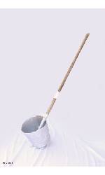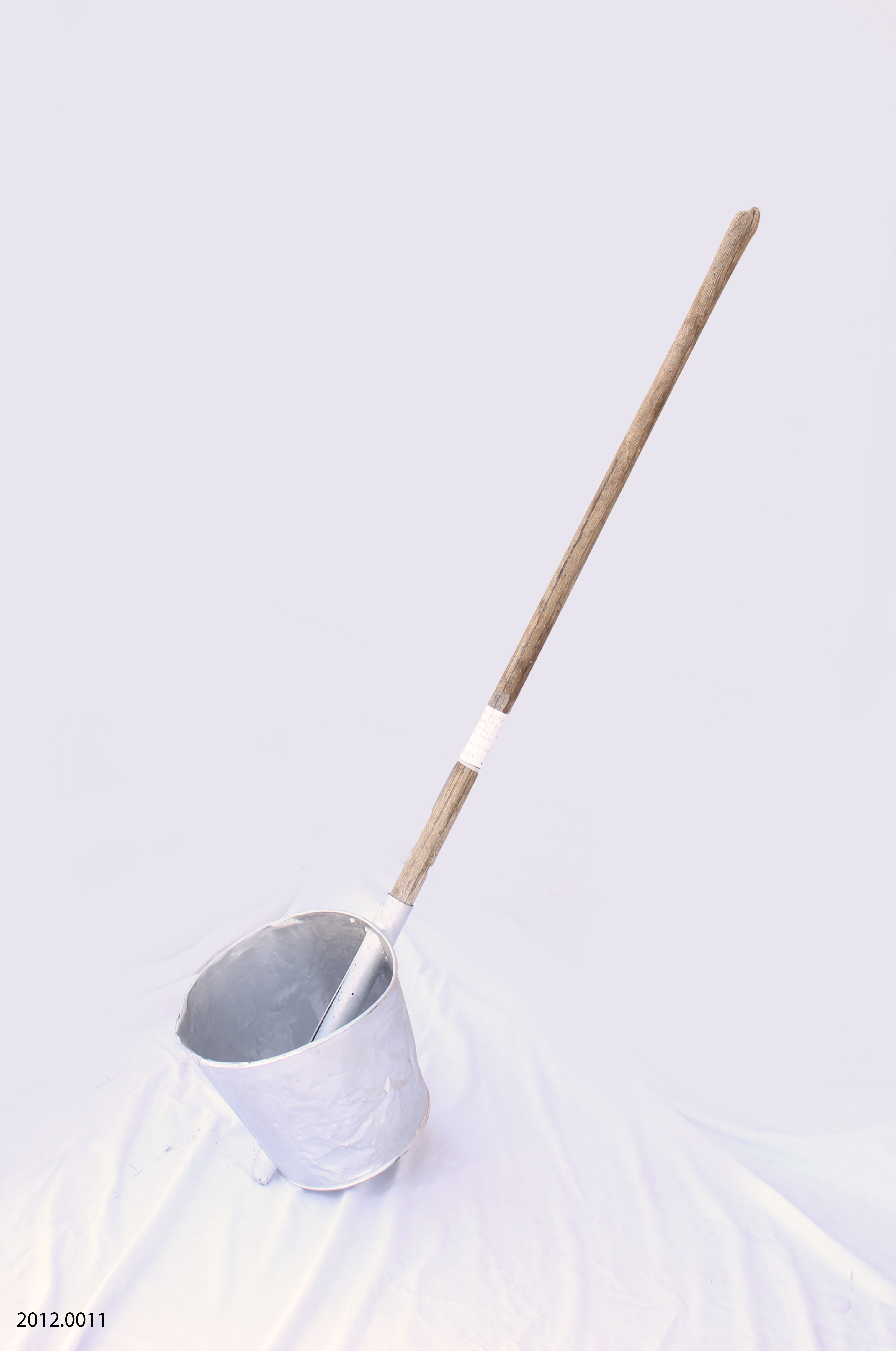 Object Desc Pail attached to a wooden handle, used to scoop water into a barrel on Fraser Moffat's farm.
