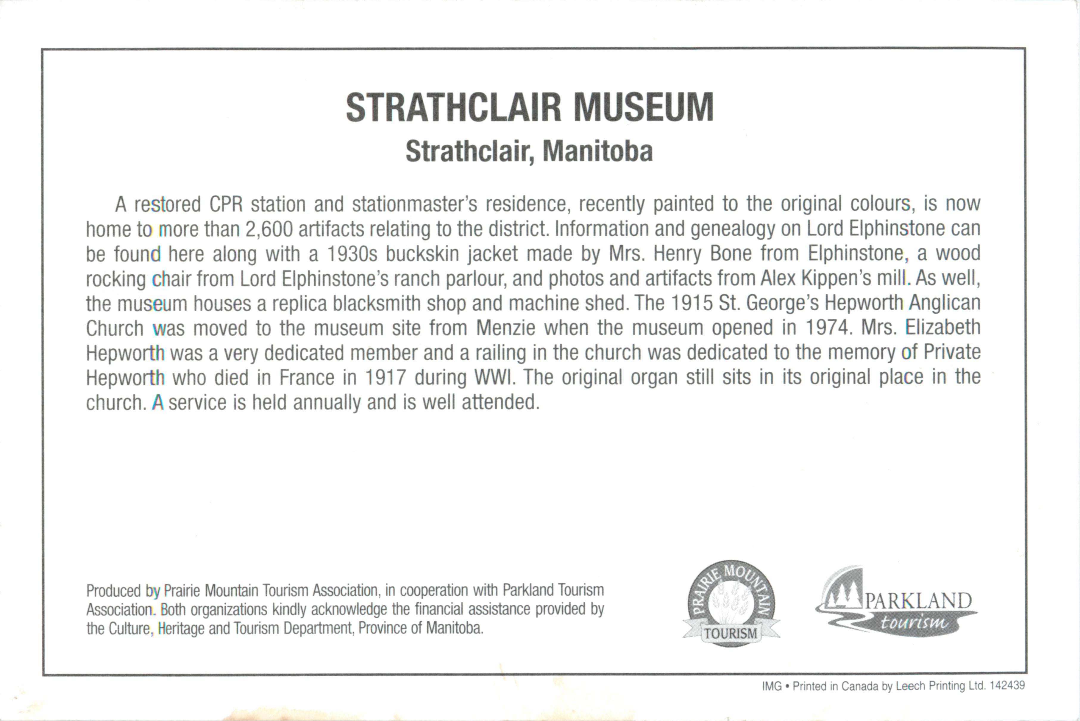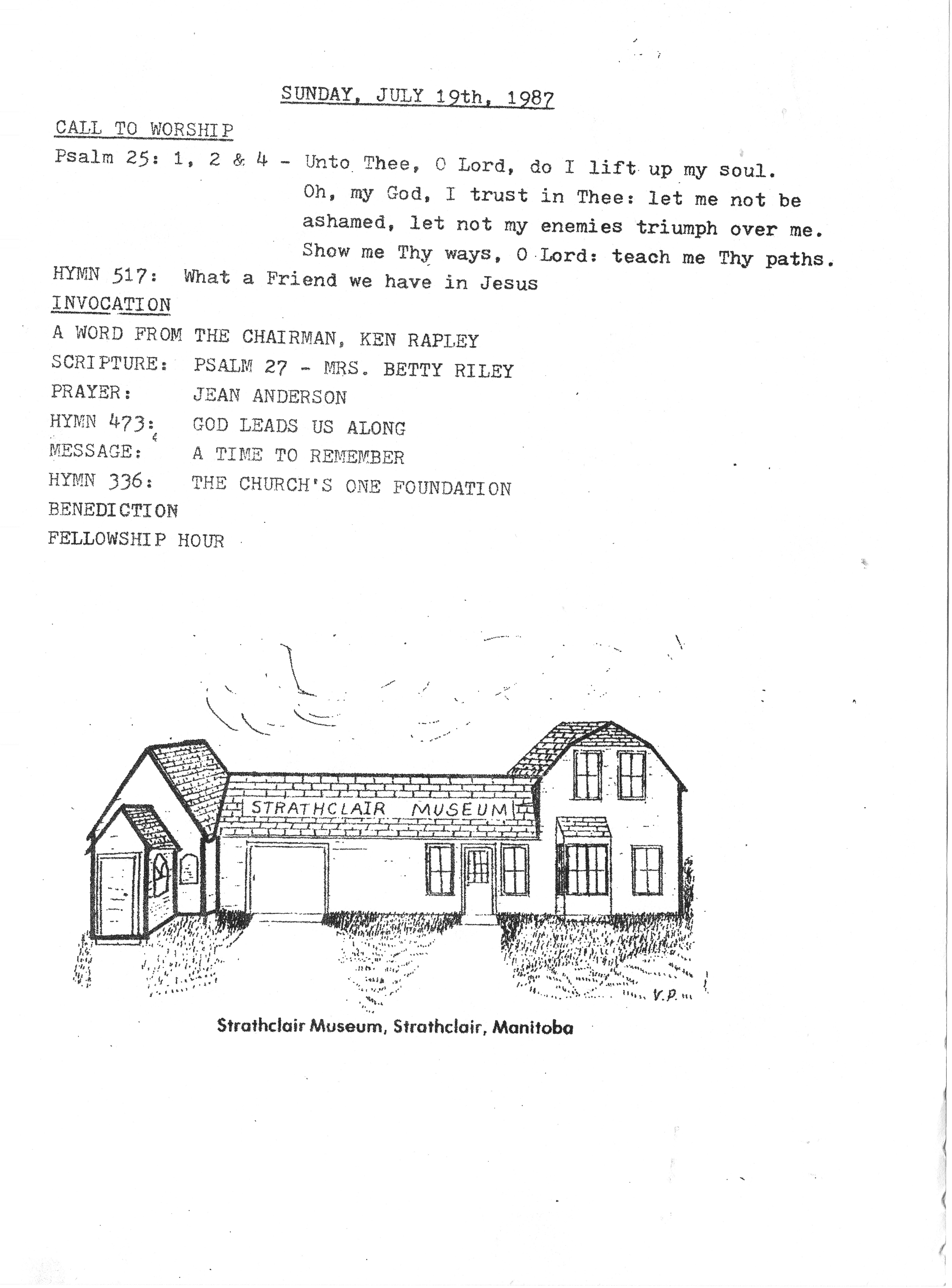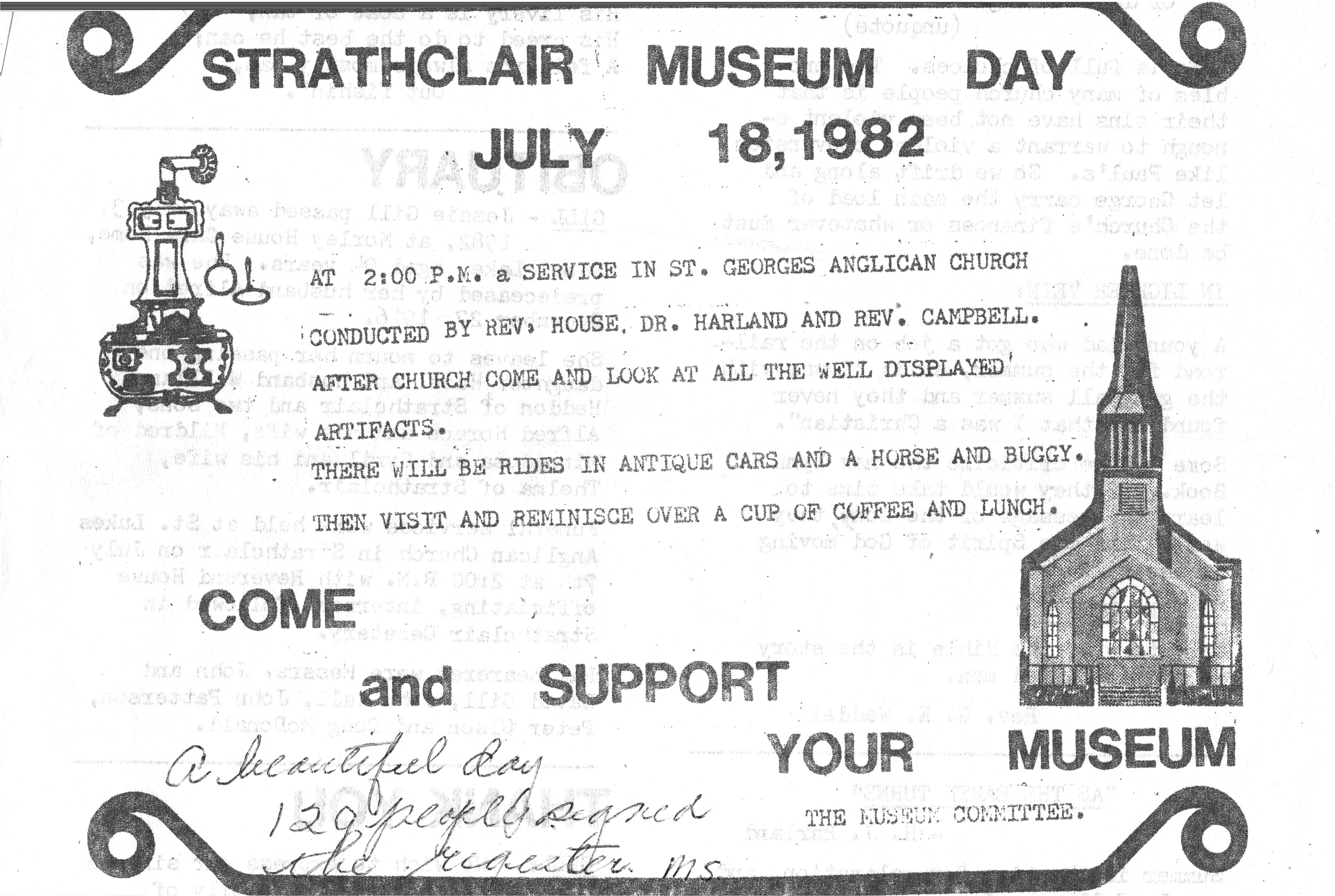Notes Strathclair Museum bulletin. July 17th 1983, July 21st 1985, July 19th 19th 1987, July 17th 1988, July 16th 1989, July 15th 1990, July 14th 1991, July 12th 1992, July 11th 1993, July 17th 1994, July 16th 1995, July 14th 1996, July 13th 1997, July 12th 1998, July 11th 1999,