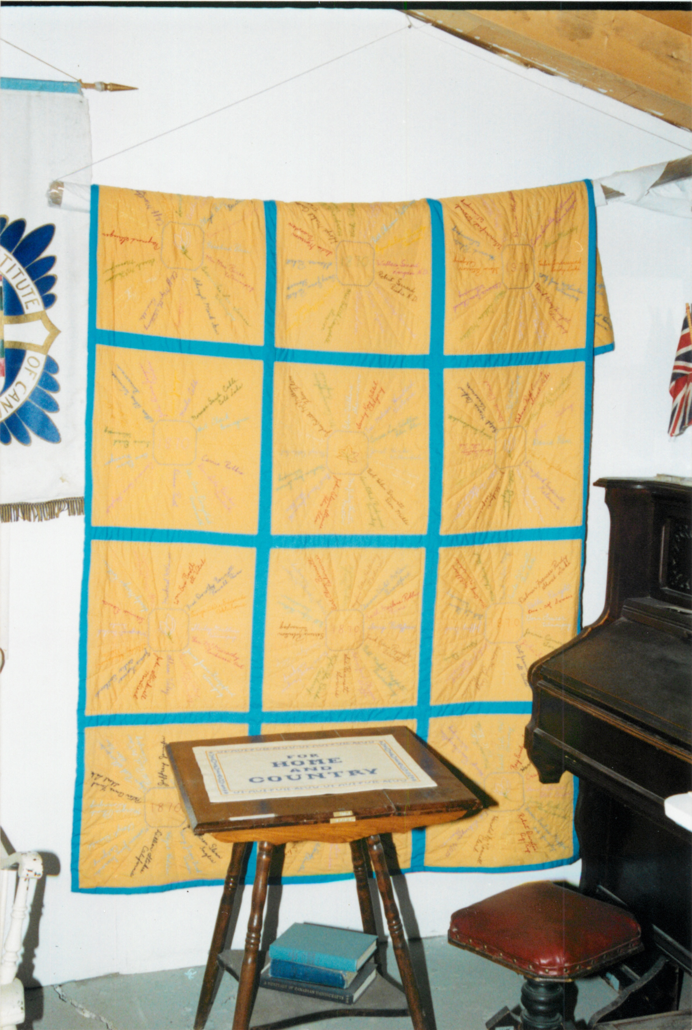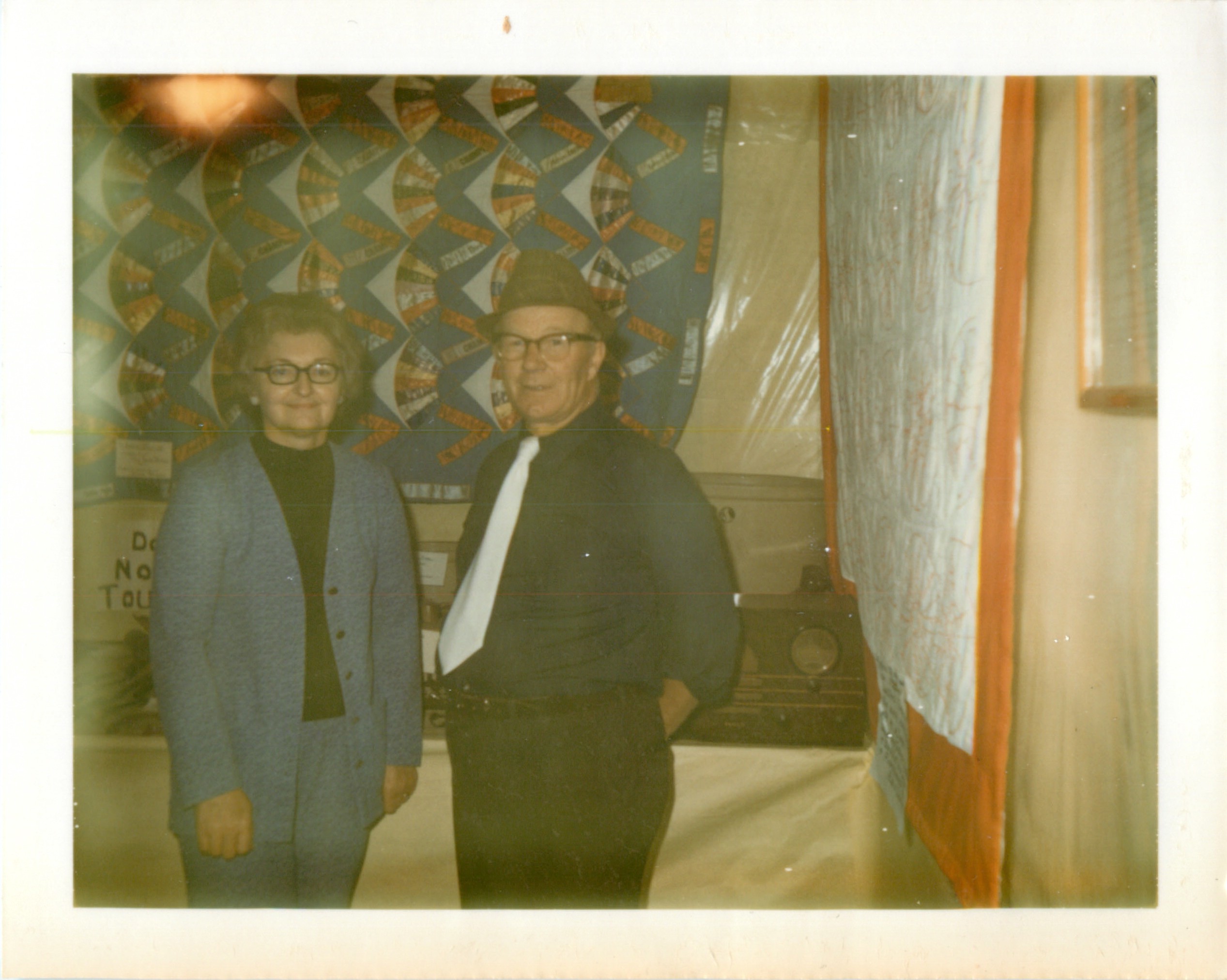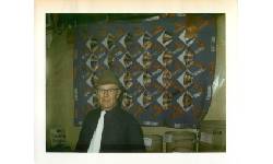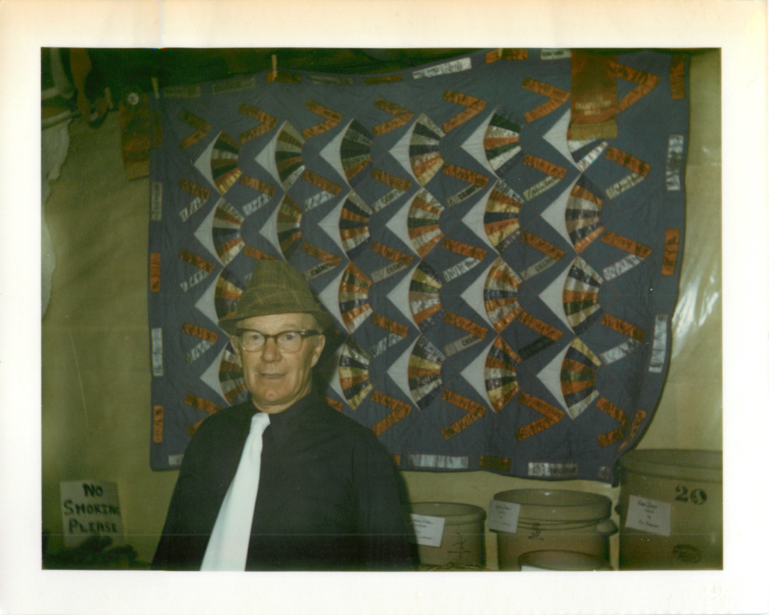 Description Bruce Parker stands in front of a quilt made by his mother using his showing ribbons.