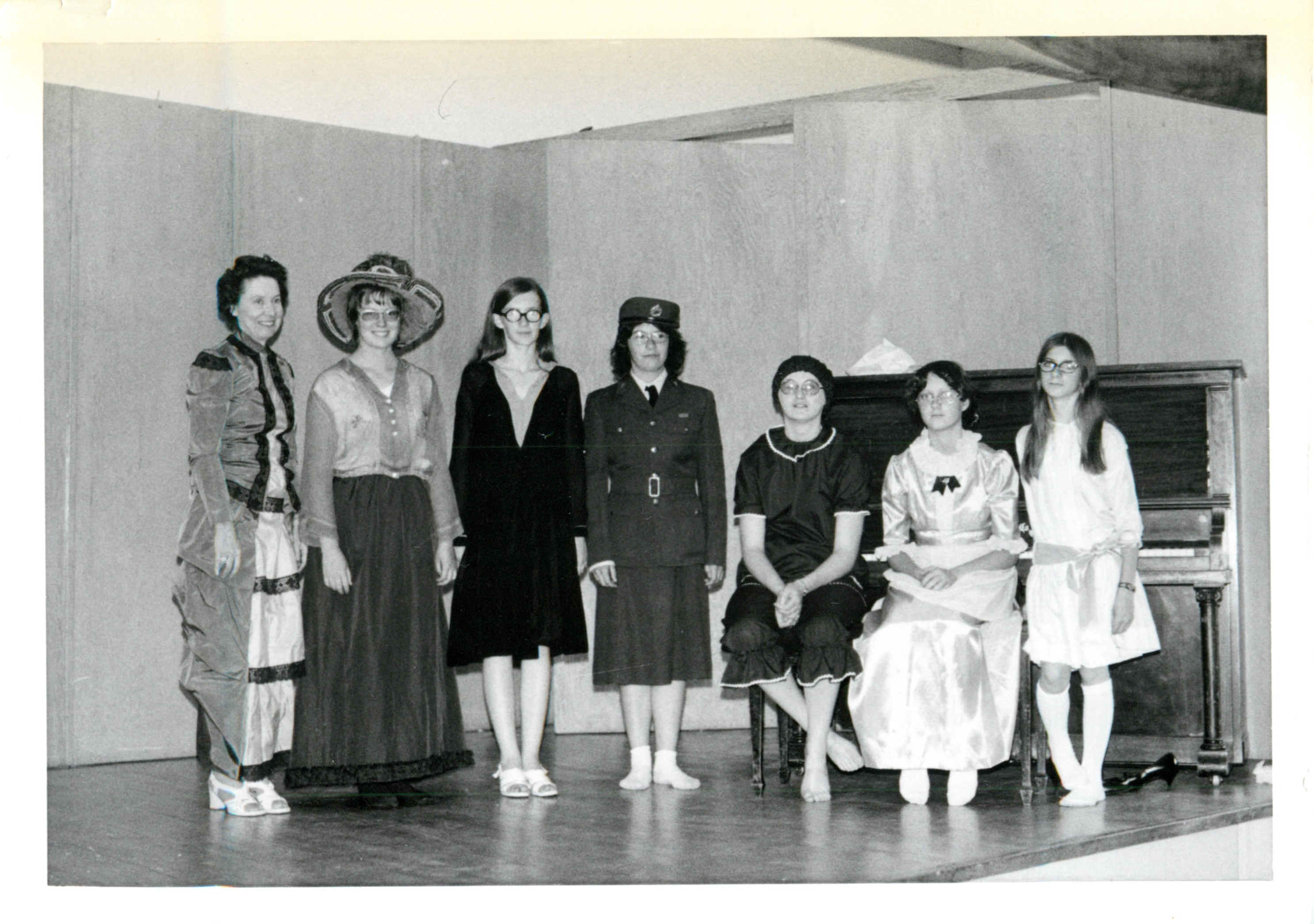Description Women in black skirt white hat is Mary Solomon. Black skirt and black hat Helga Gerrard, Man at the back of the float is George Gerrard.