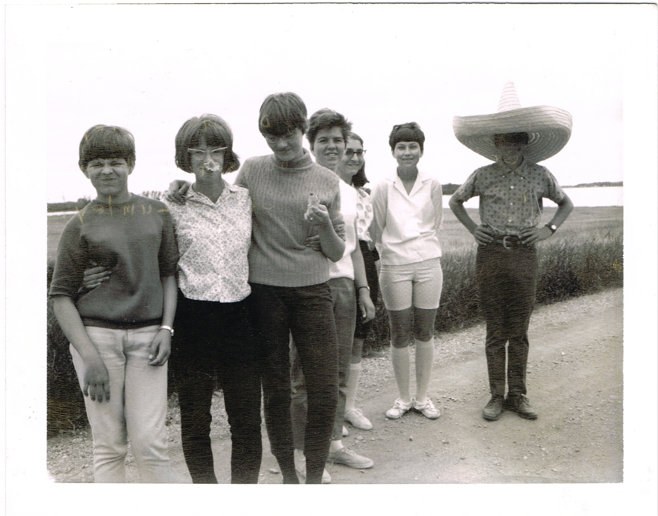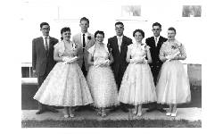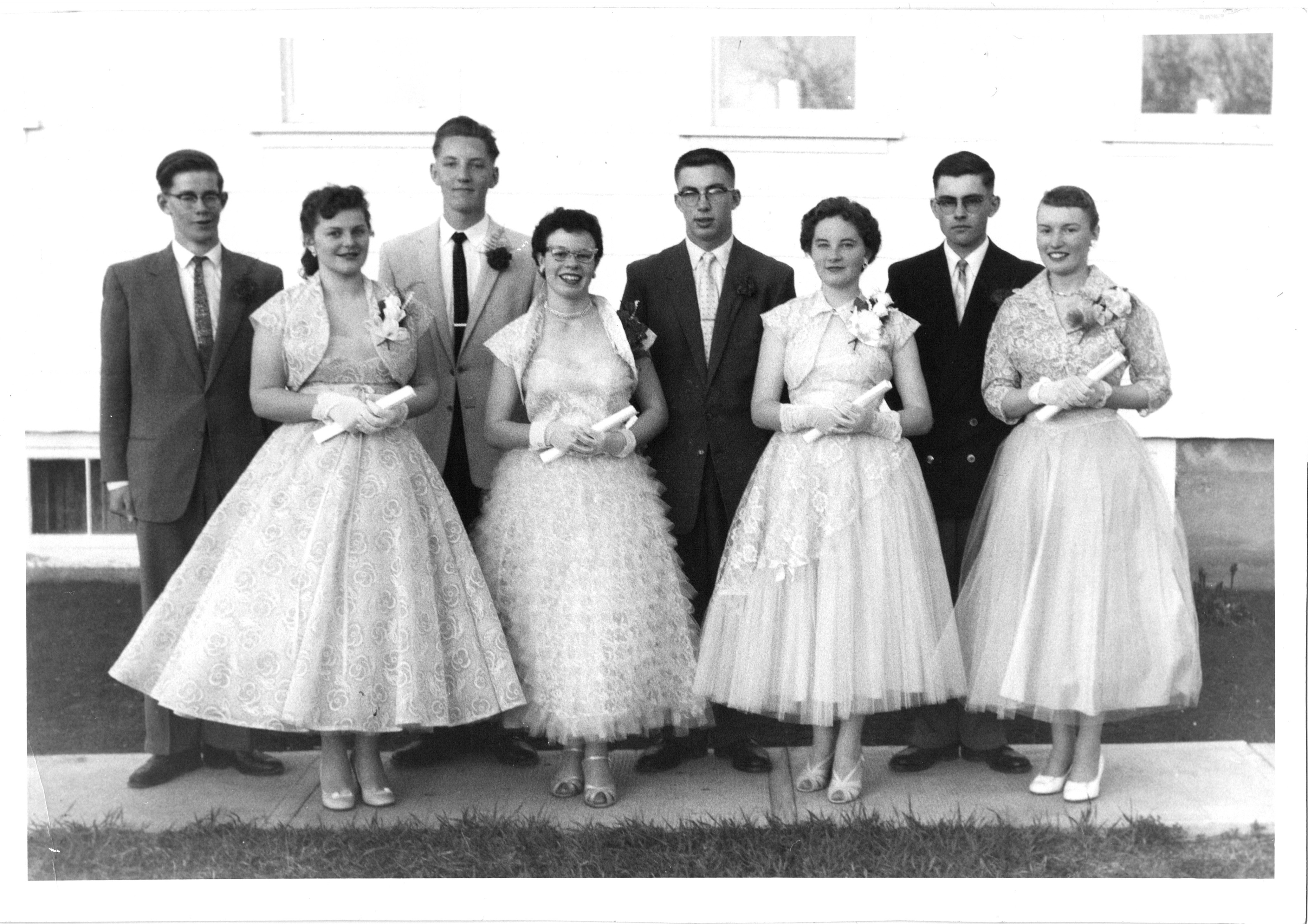 Description 1958 Graduating Class taken outside United Church. Guys-L to R - Jim Sinclair, Gordon Rempel, Harry Morcom, Jim Holmes. Gals - Susy Fiel, Bernice Hogg, Marie Campbell, Hazel Gill.