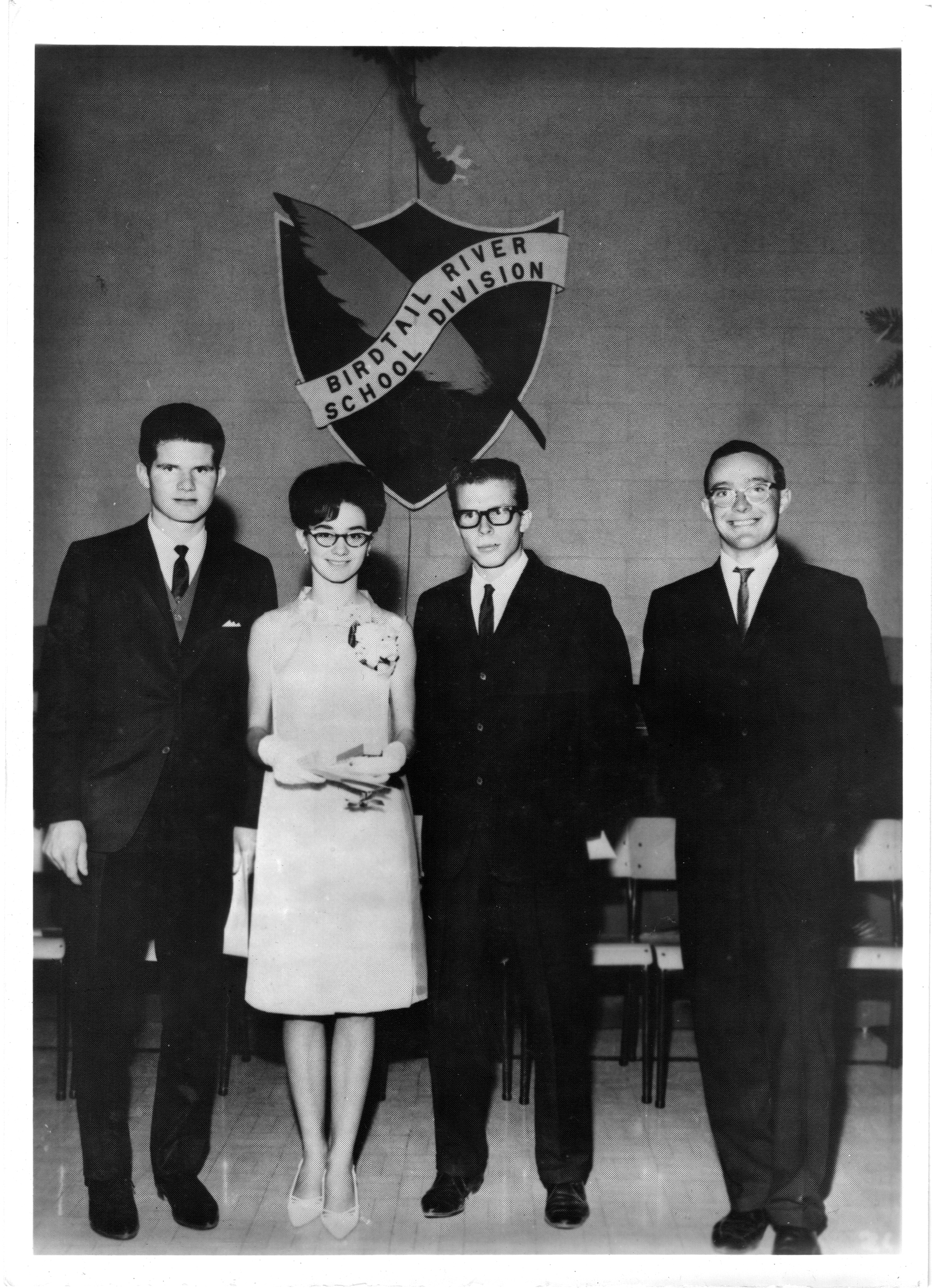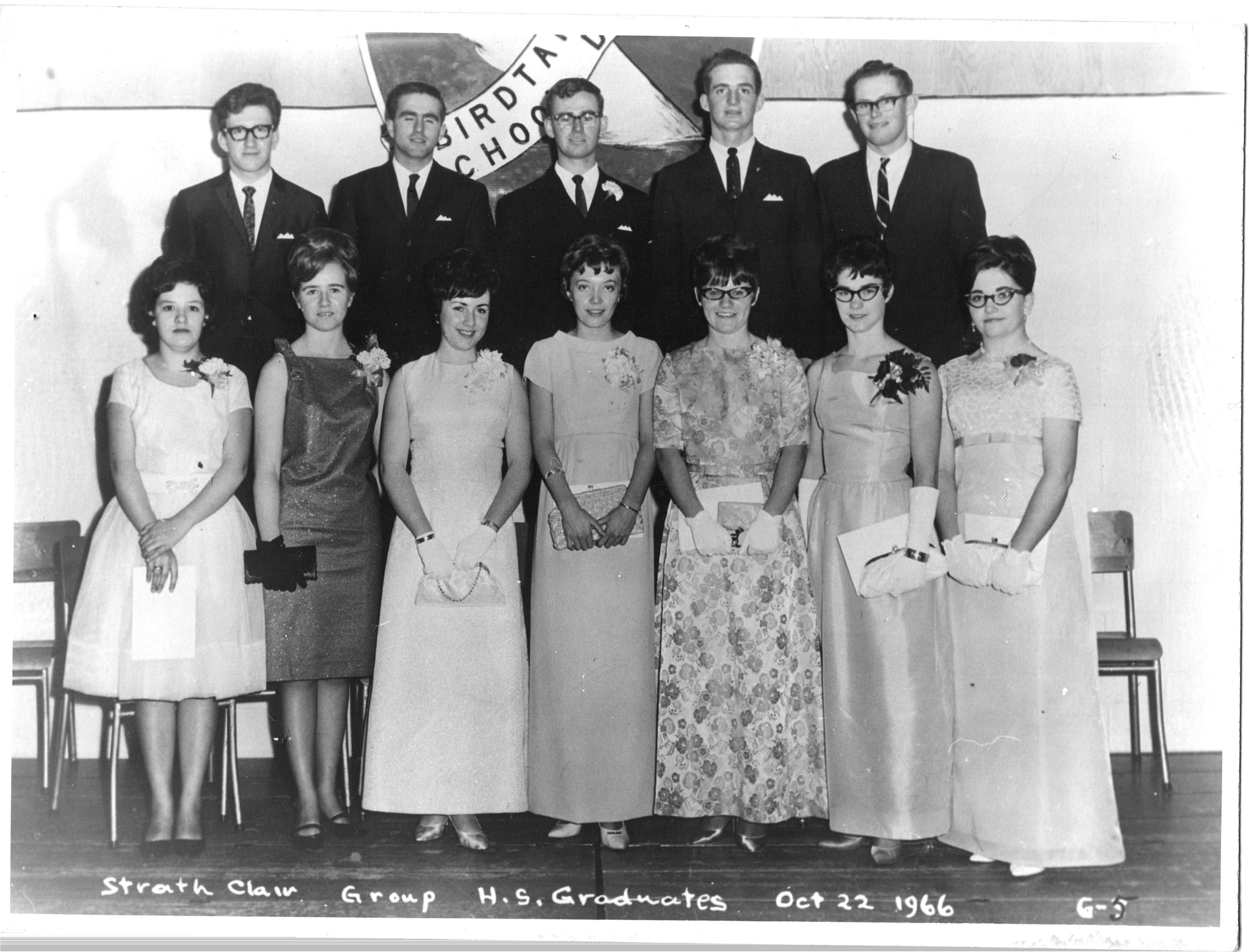Description 1966 Strathclair Graduatesat Division Graduation-Guys-Bryan Fortune, Fred McDonald, Angus Hachkowski, Brain Patterson, Bruce Elliot, Gals- ?? Jean Morton, Marilyn Watt, Danice Elliot, Sheila Blackwood, Donna Everitt.