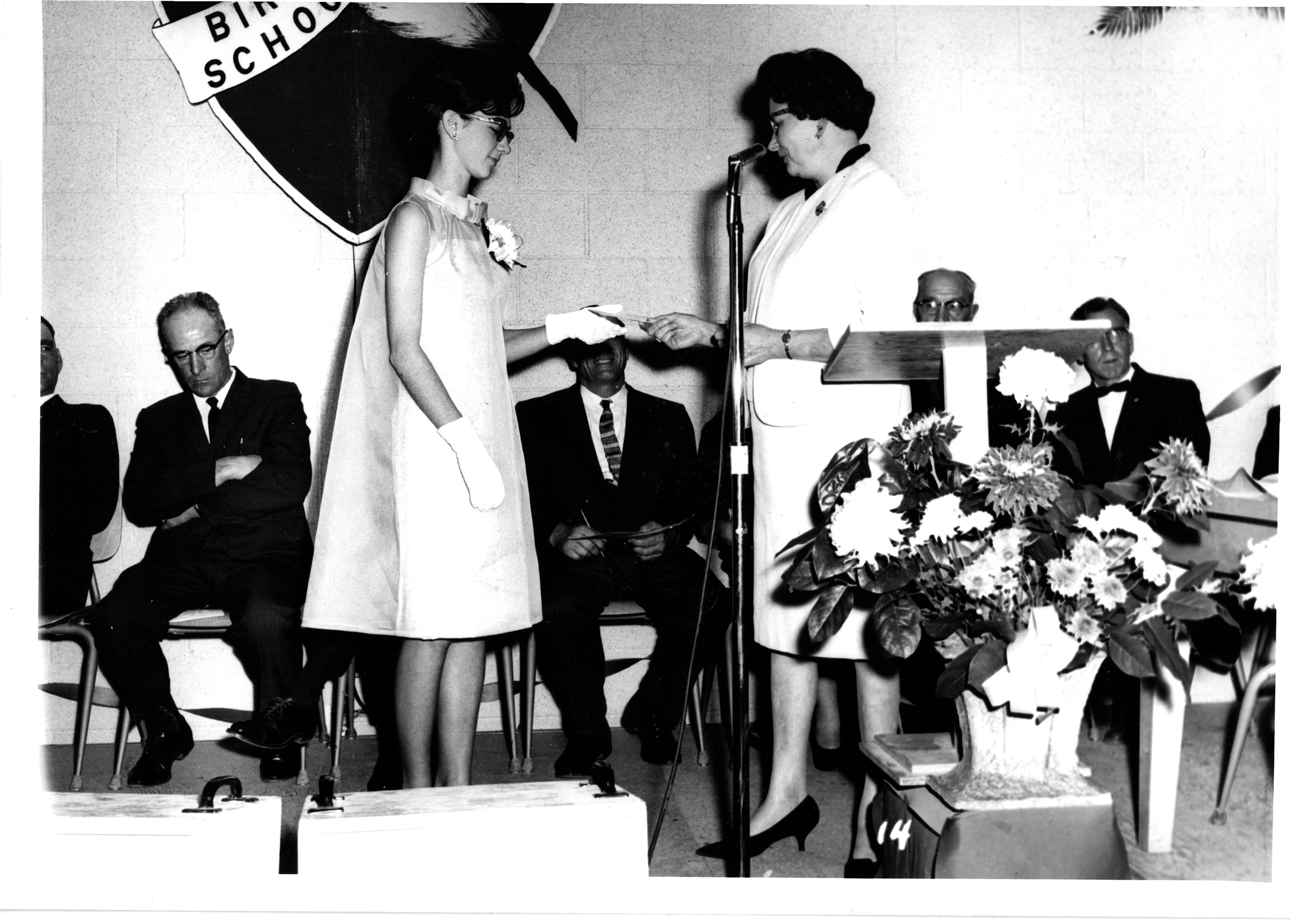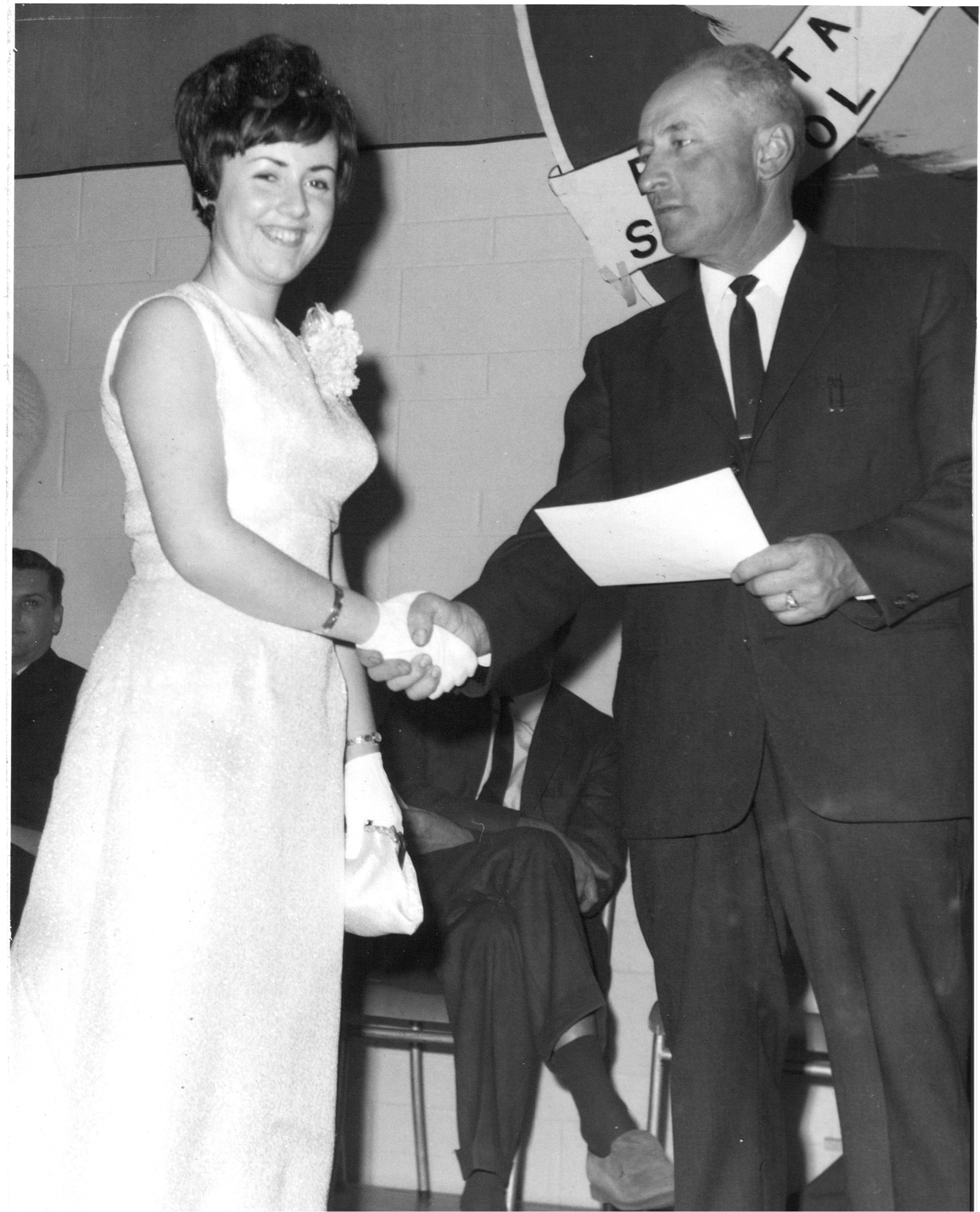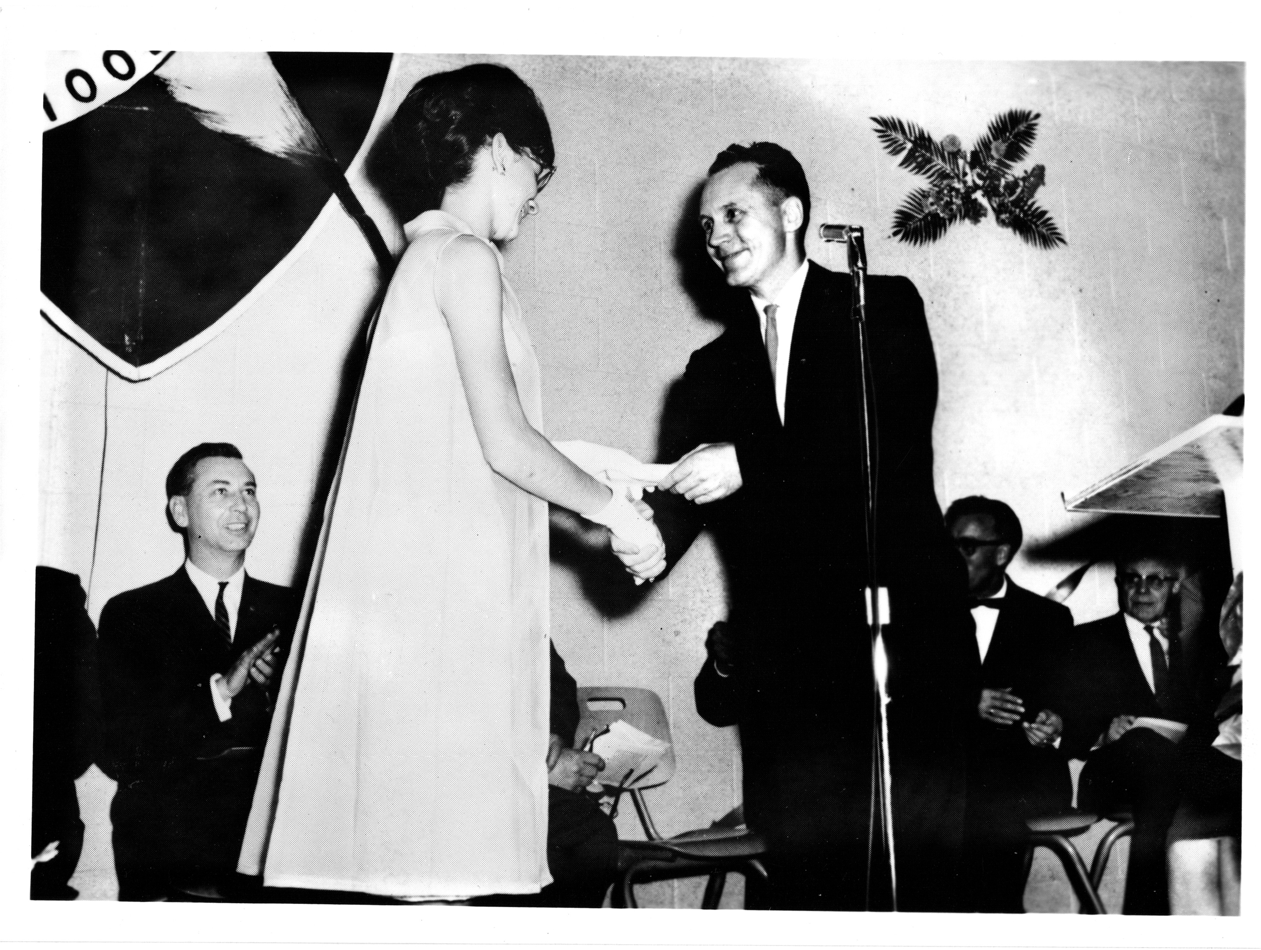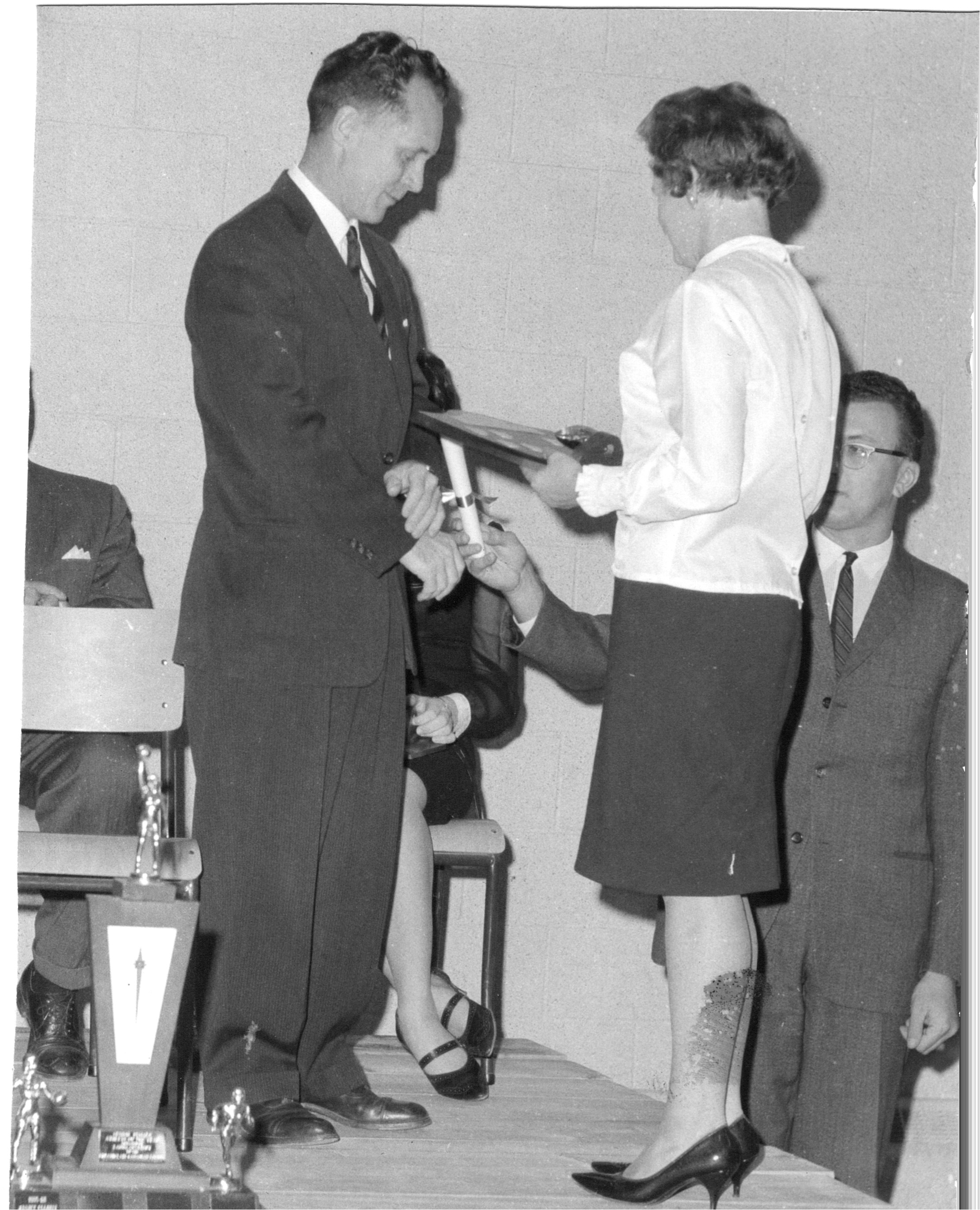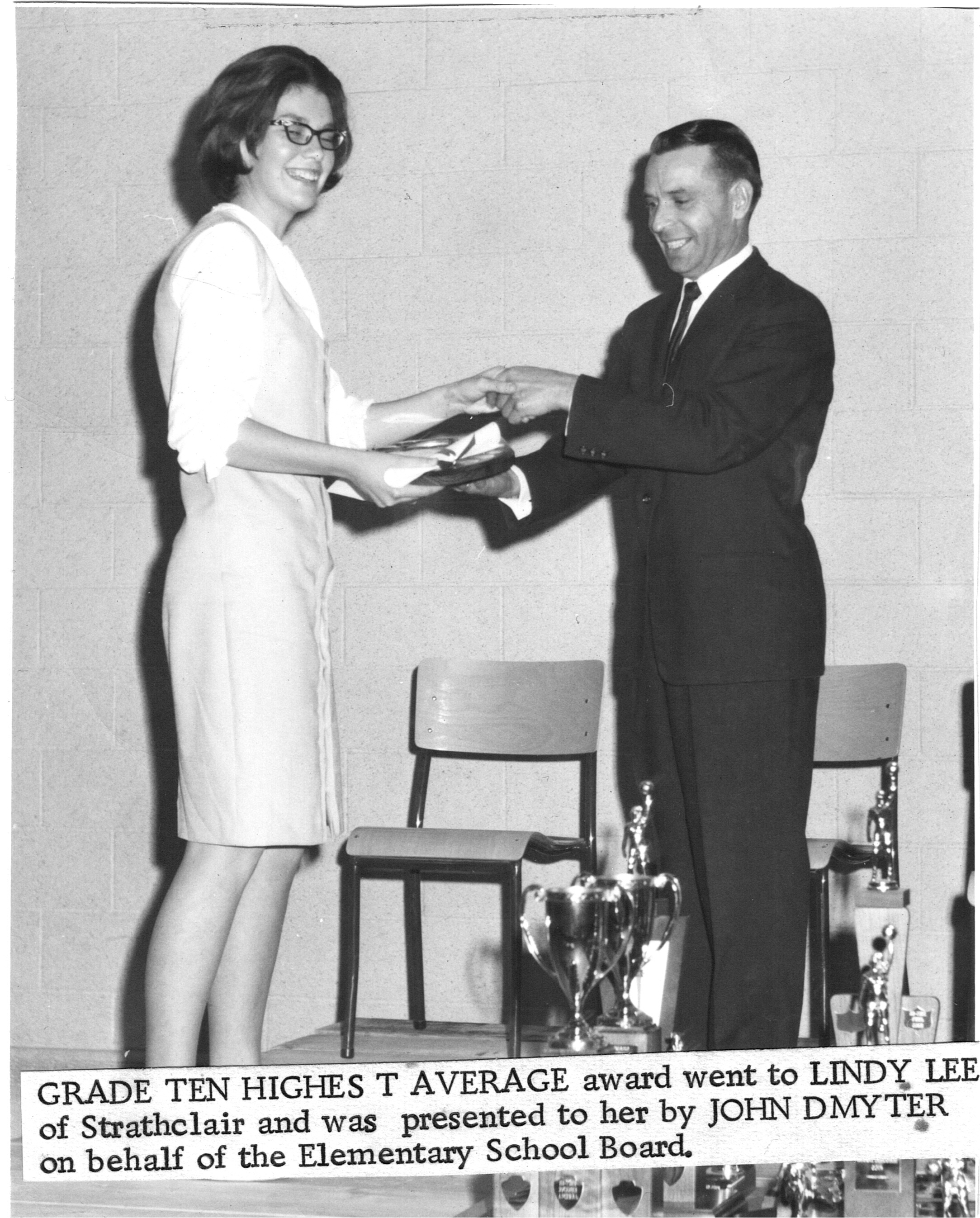 Description June 1966, Lindy Lee recieving the Grade Ten Highest Average Award presented by John Dmytar.