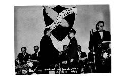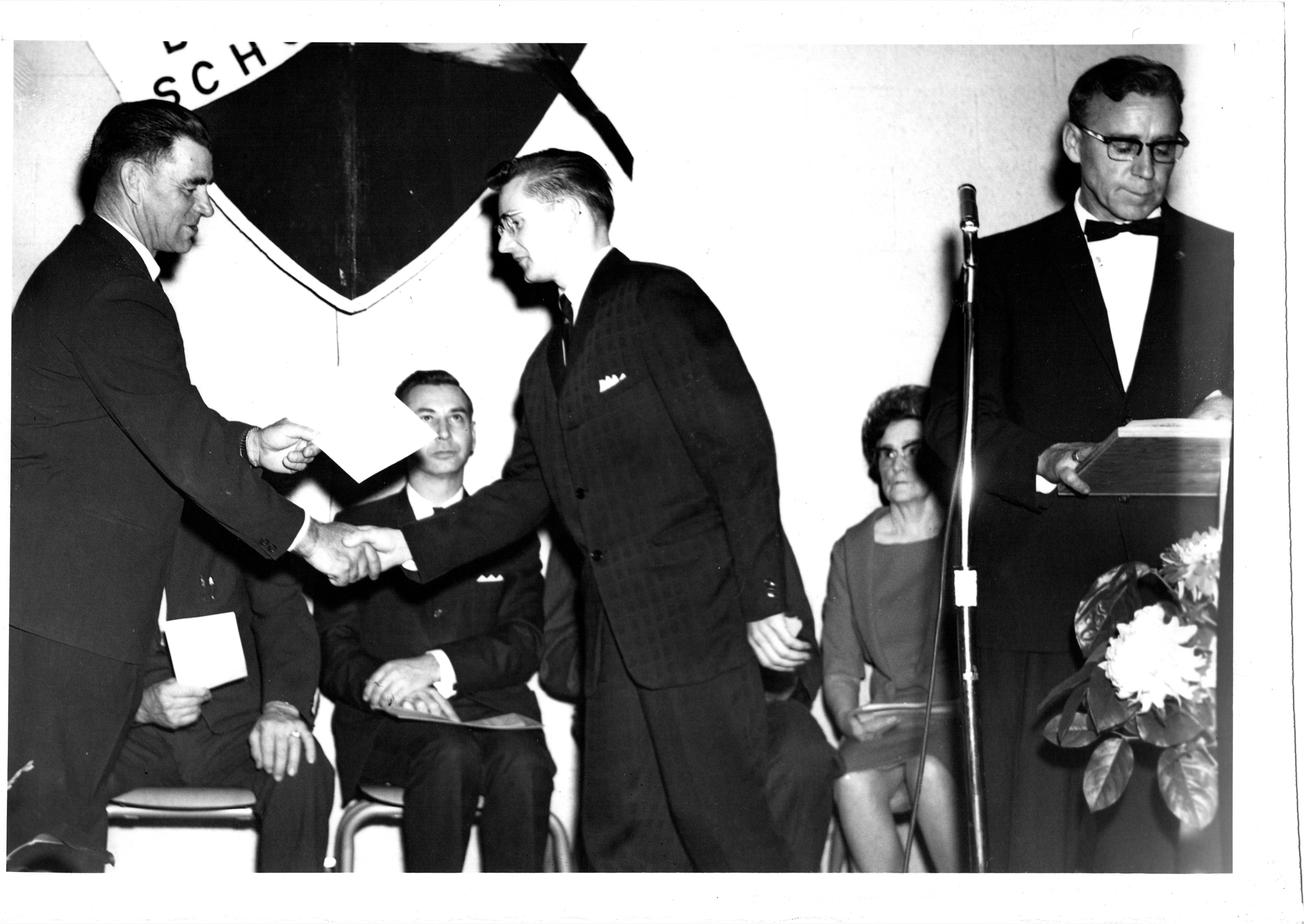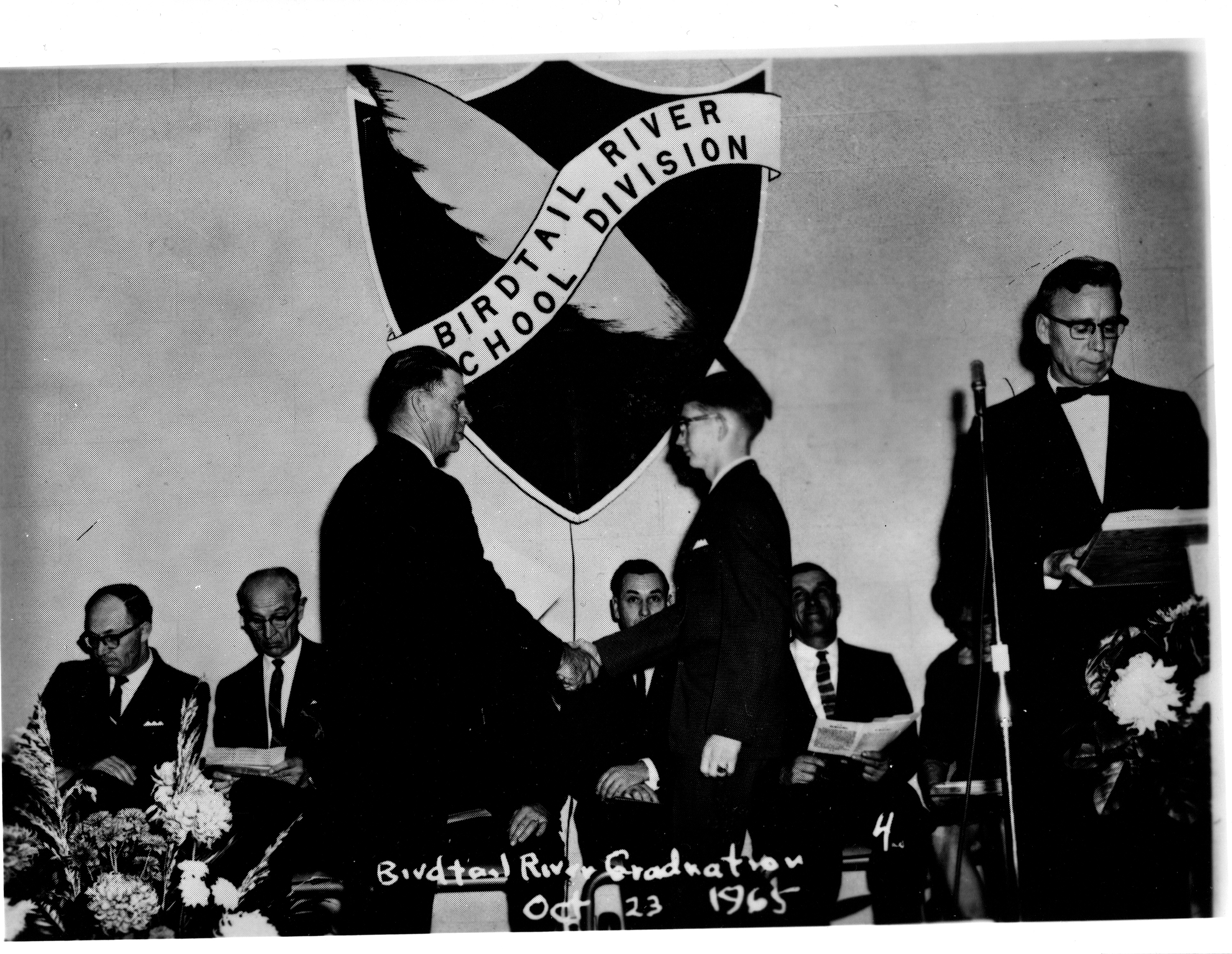 Description Birdtail River Back Row Trustees - Selby Inspector - P.H.Funk; ?; K. Rapley; Chairman Les Stimpson at the Podium. Francis Winstone presenting Garry Watson with certificate.