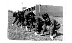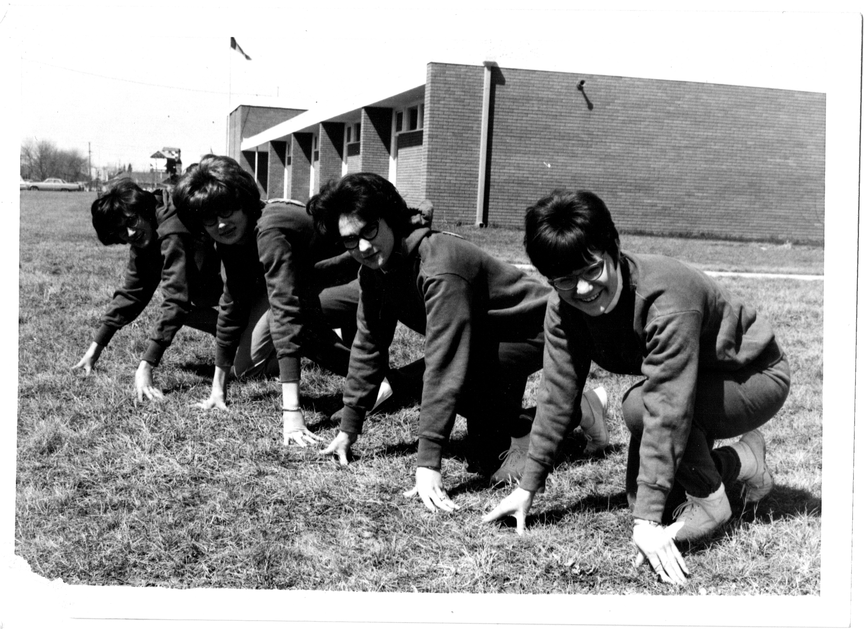Description 1962 Collegiate Girls Track Team L-R_ Linda Donogh, Gwen Braoley, Sheila Blackwood, Janice Elliott.