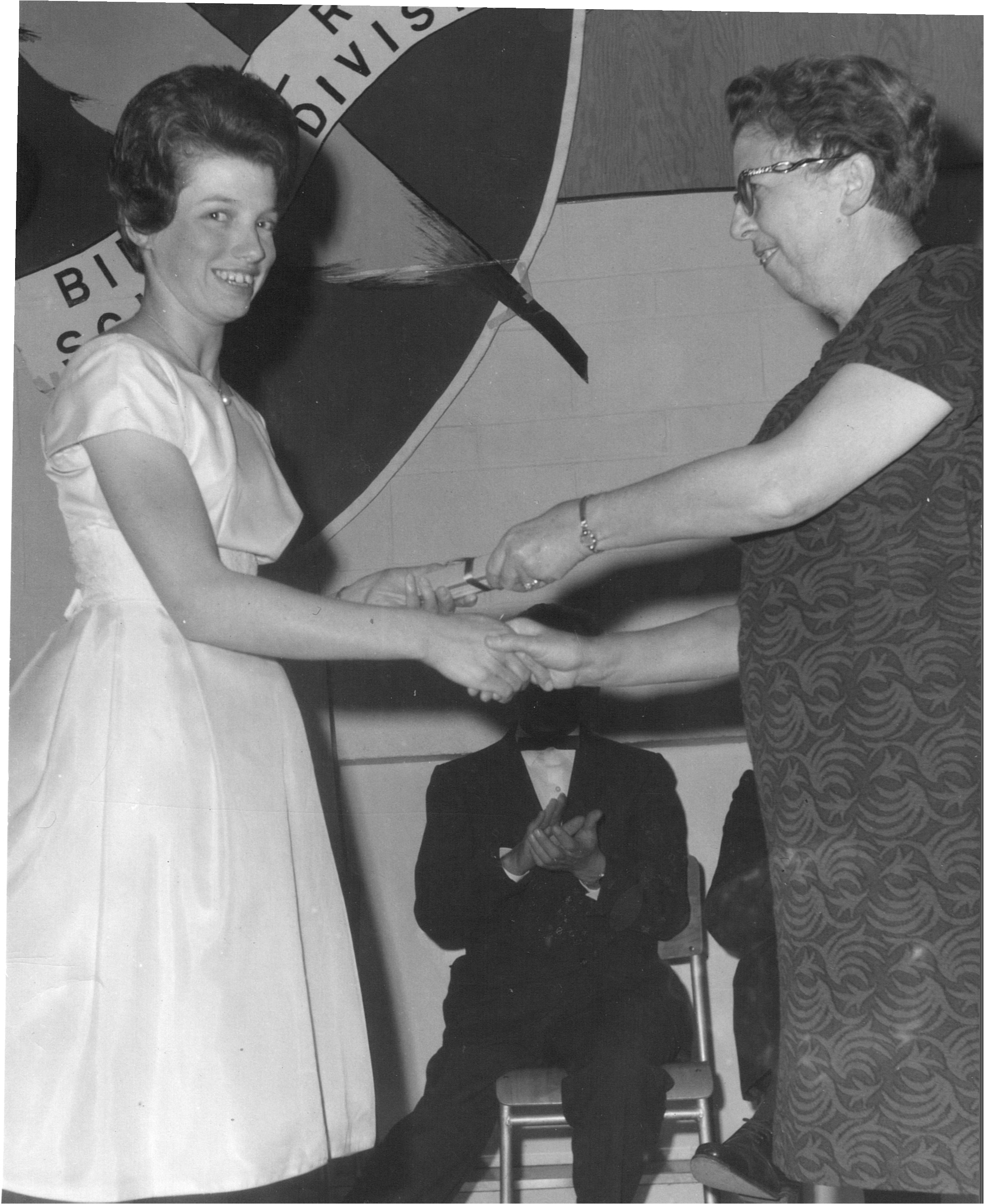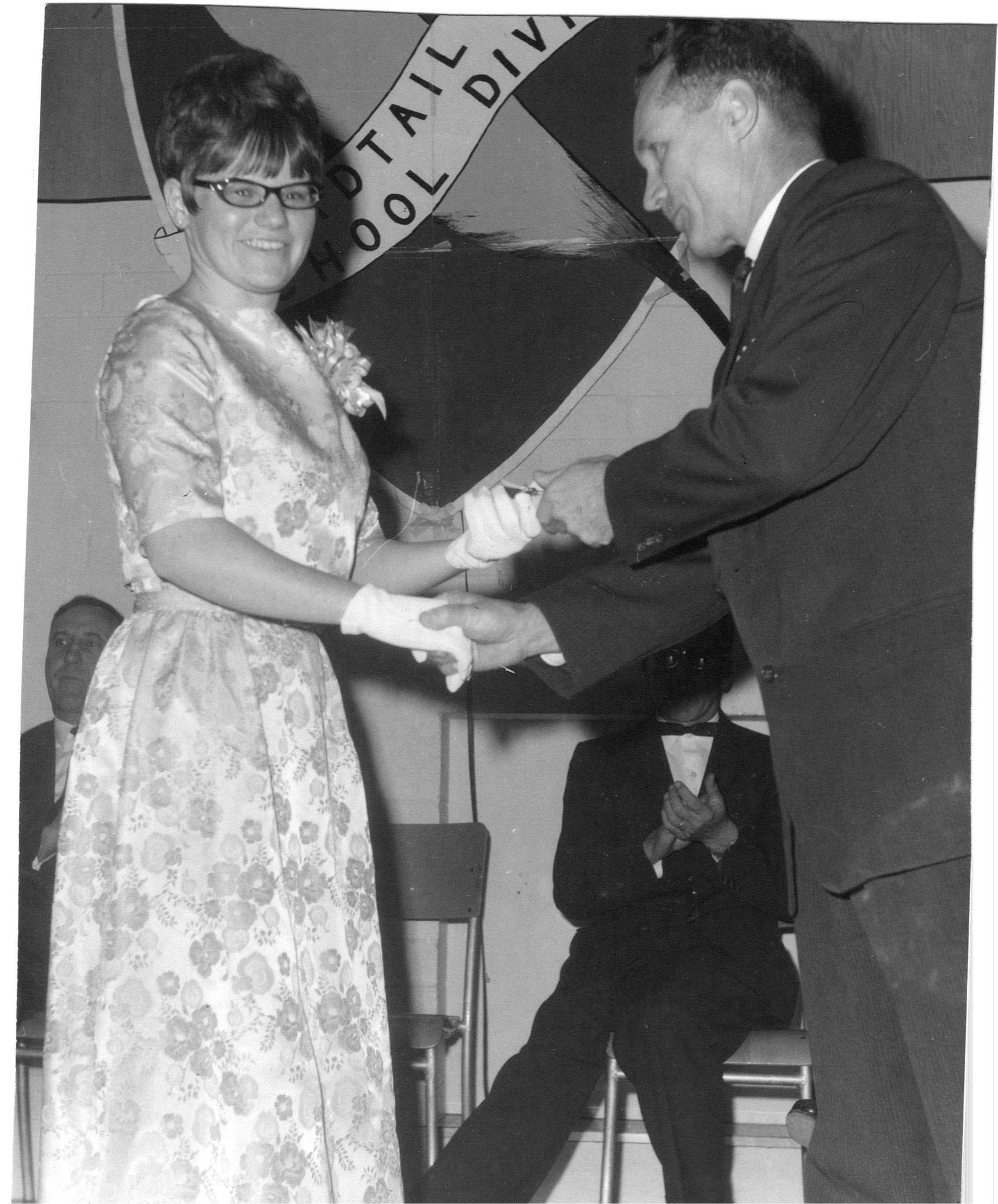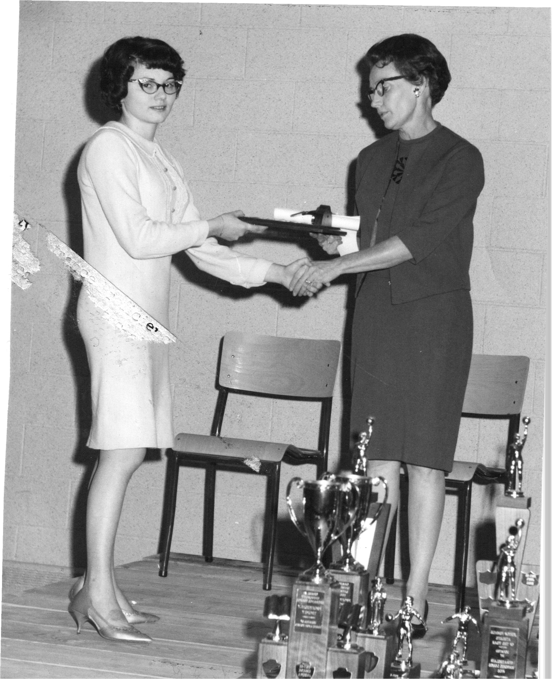 Description Dorris Waddell receiving plaque and certificate from Lorraine McTavish (?). Grade Ten.
