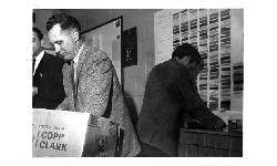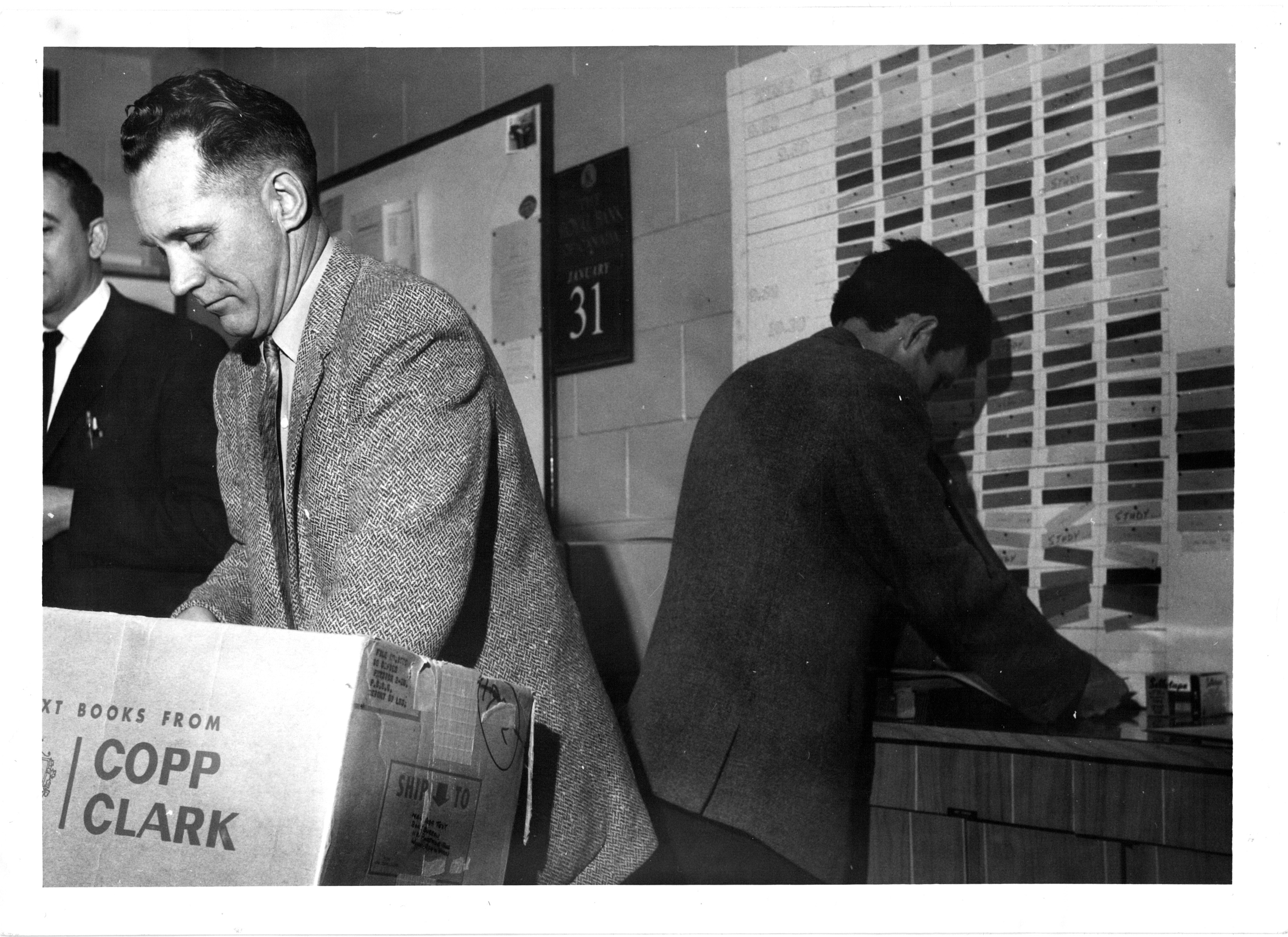 Description E.G. Morris & Jake Horky performing office duties, 1972.