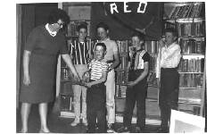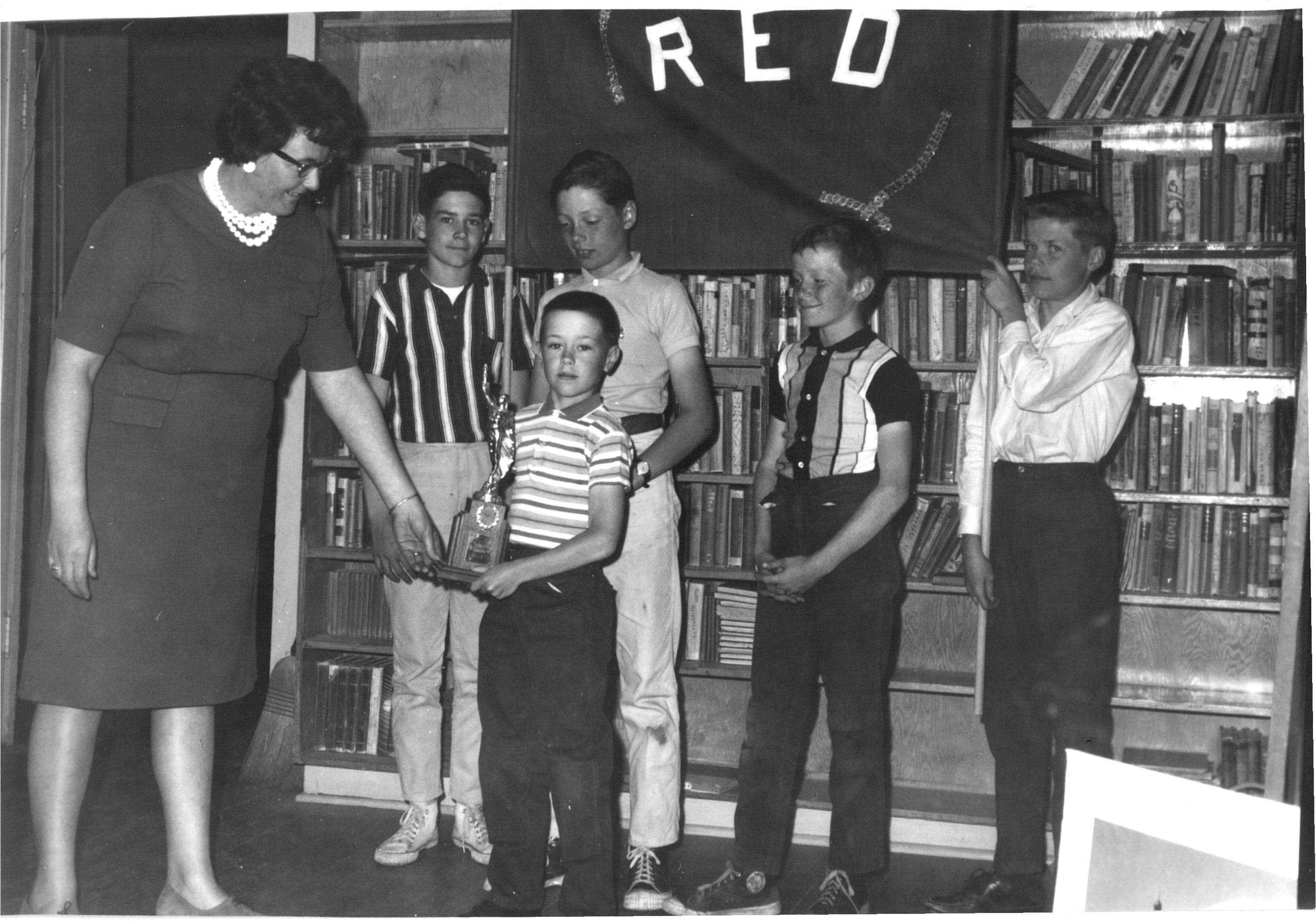 Description G. Stimpson presenting Field Day trophy to members of the "Red" team. Darrel Wyton, Randy McIntyre, Arnold Hogg, Alan Martin, Laurie Radford.