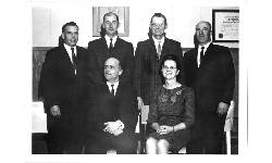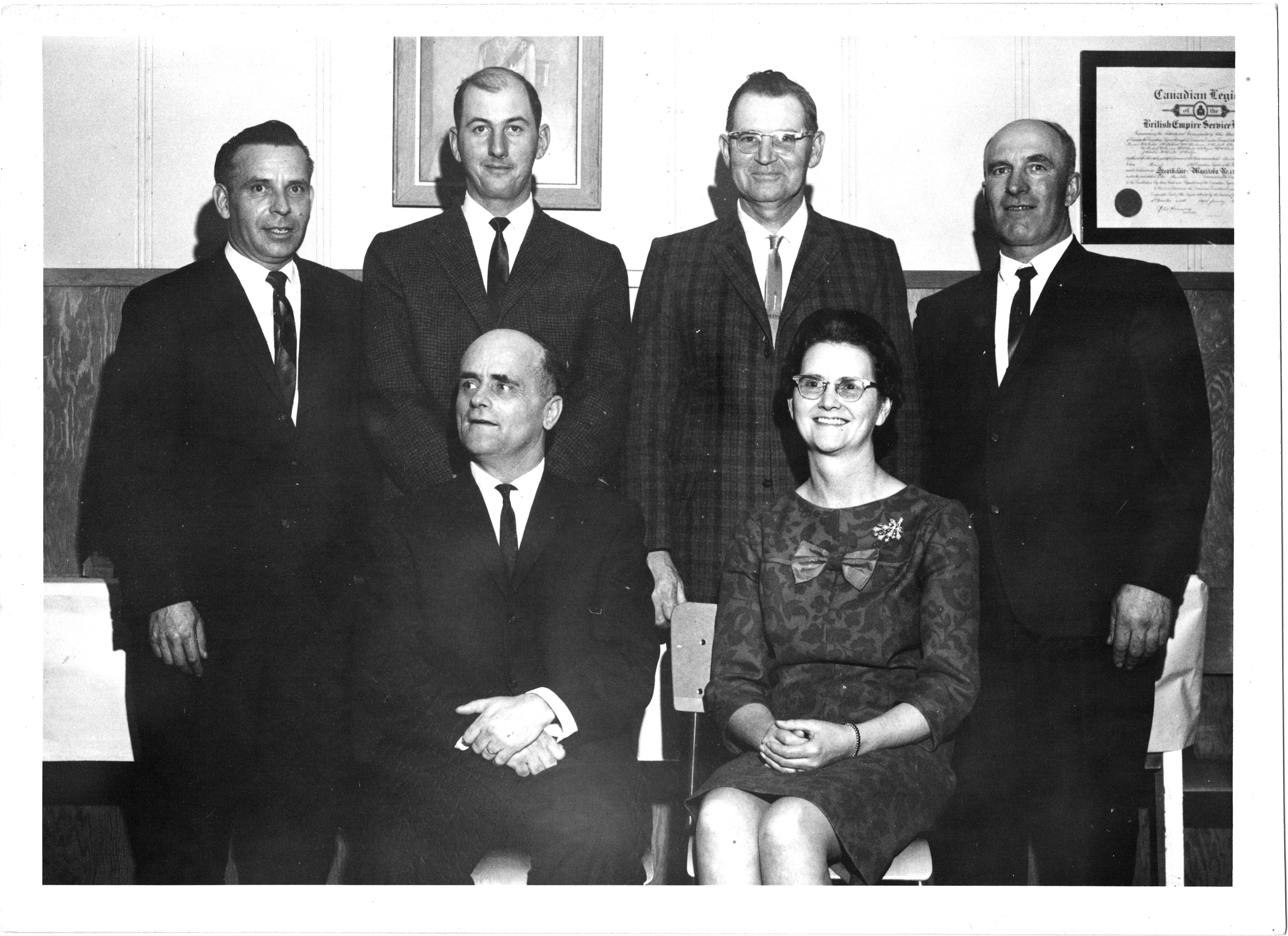 Description Local School Board - Final 1959. Back Row - John Dmytar, Gordon Harvey, Allister Elliot, Frank Dereniwski. Front - Jim McLennan, Shirley Hendry.