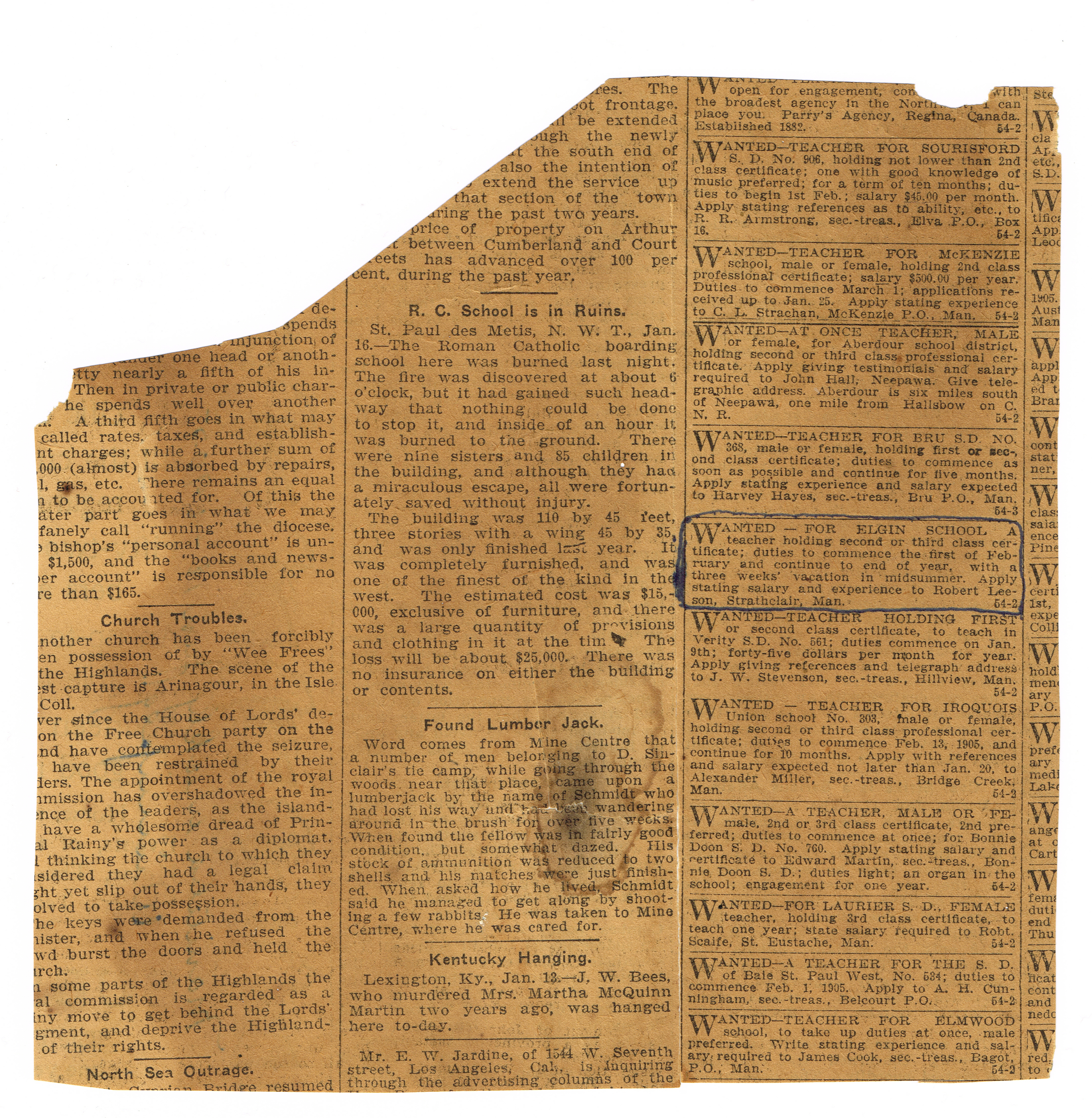 Description January 18 1905 Newspaper Advert for a teacher at Elgin School. Advert placed by Robert Leeson. Probably contributed by Earl Leeson.