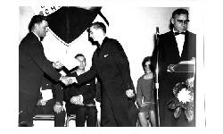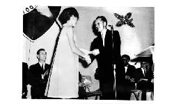Description Marie Elliot receiving award from E.G. Morris - Alex Domytrak in the background