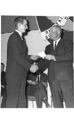 Description Francis Winstone presenting Maurice Sydor. Board Chairman Les Stimpson at the podium. Background - Norman Ray (Souris guest speaker), and Winnifred Stratton.
