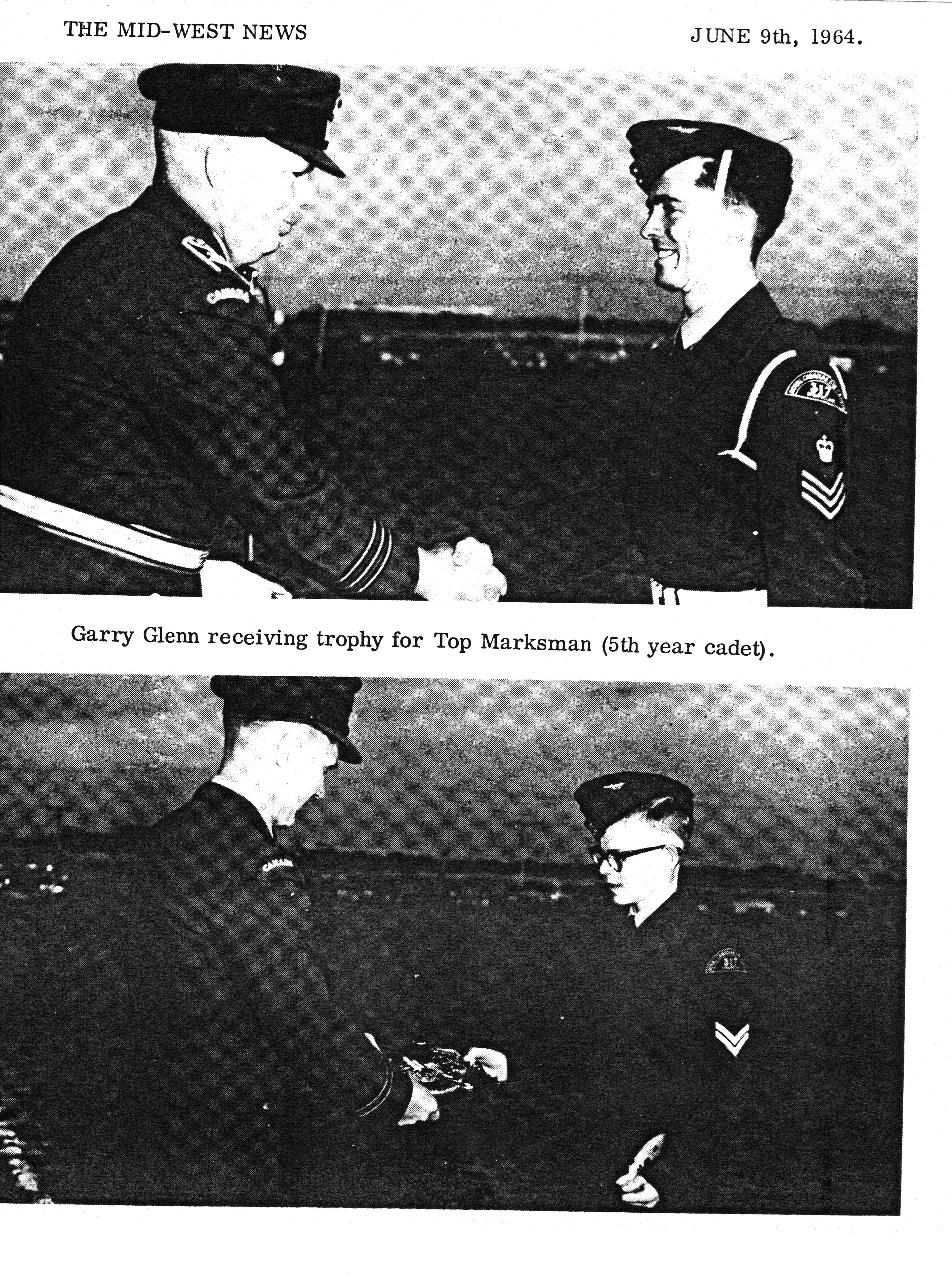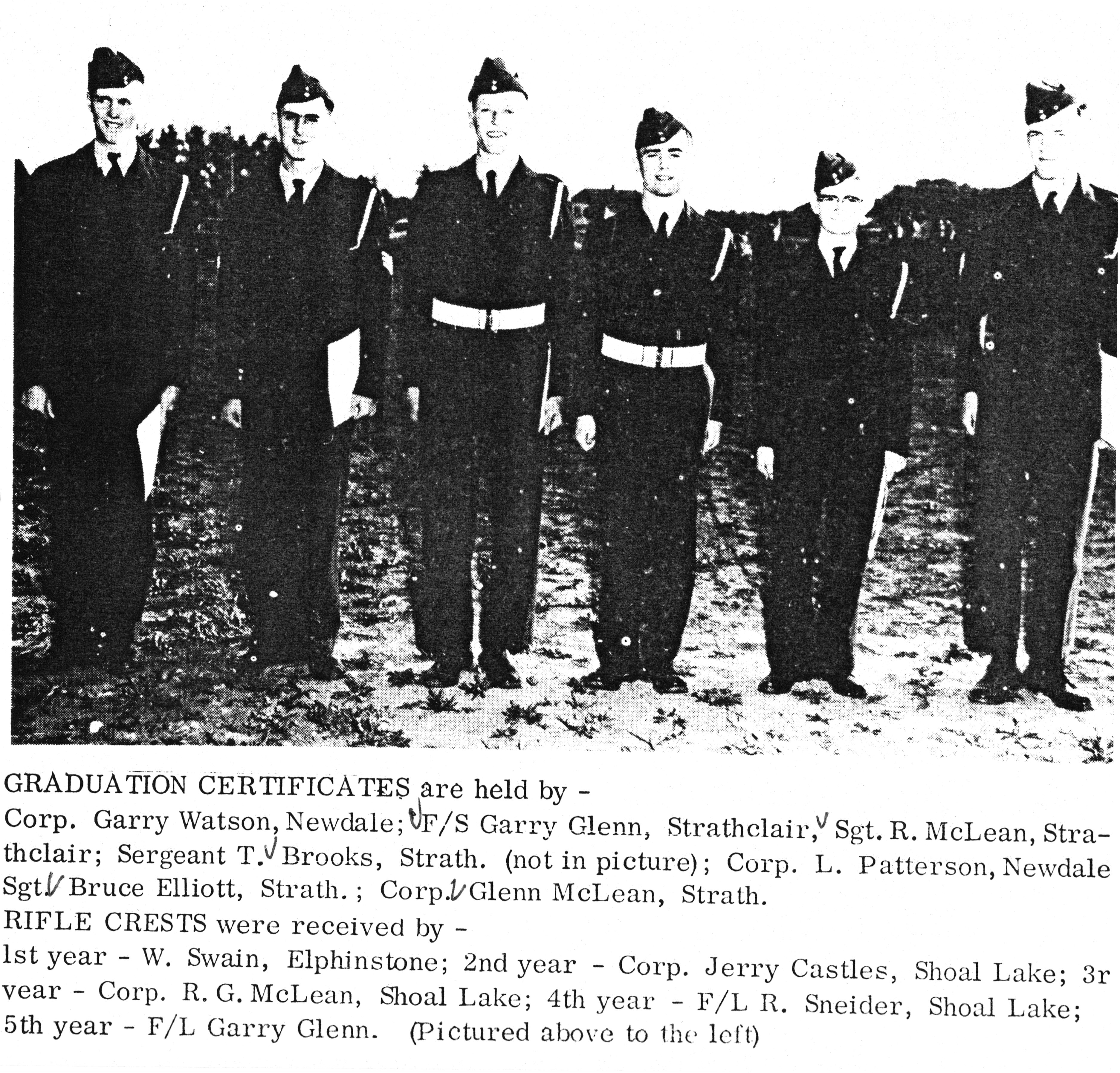 Description Graduation certificates are held by- Corp. Garry Watson, Newdale; F/S Garry Glenn, Strathclair, Sgt..R.Mclean, Strathclair; Sergeant T. Brooks, Strath. (not in picture); Corp. L. Patterson, Newdale; Sgt./ Bruce Elliott, Strath.; Corp. Glenn Mclean, Strath. Rifle Crests were received by- 1st year-W. Swain, Elphinstone; 2nd year- Corp. Jerry Castles, Shoal Lake; 3rd year- Corp. R.G. Mclean, Shoal Lake; 4th year- F/L R. Sneider, Shoal Lake; 5th year- F/L Garry Glenn. (Pictured above to the left)