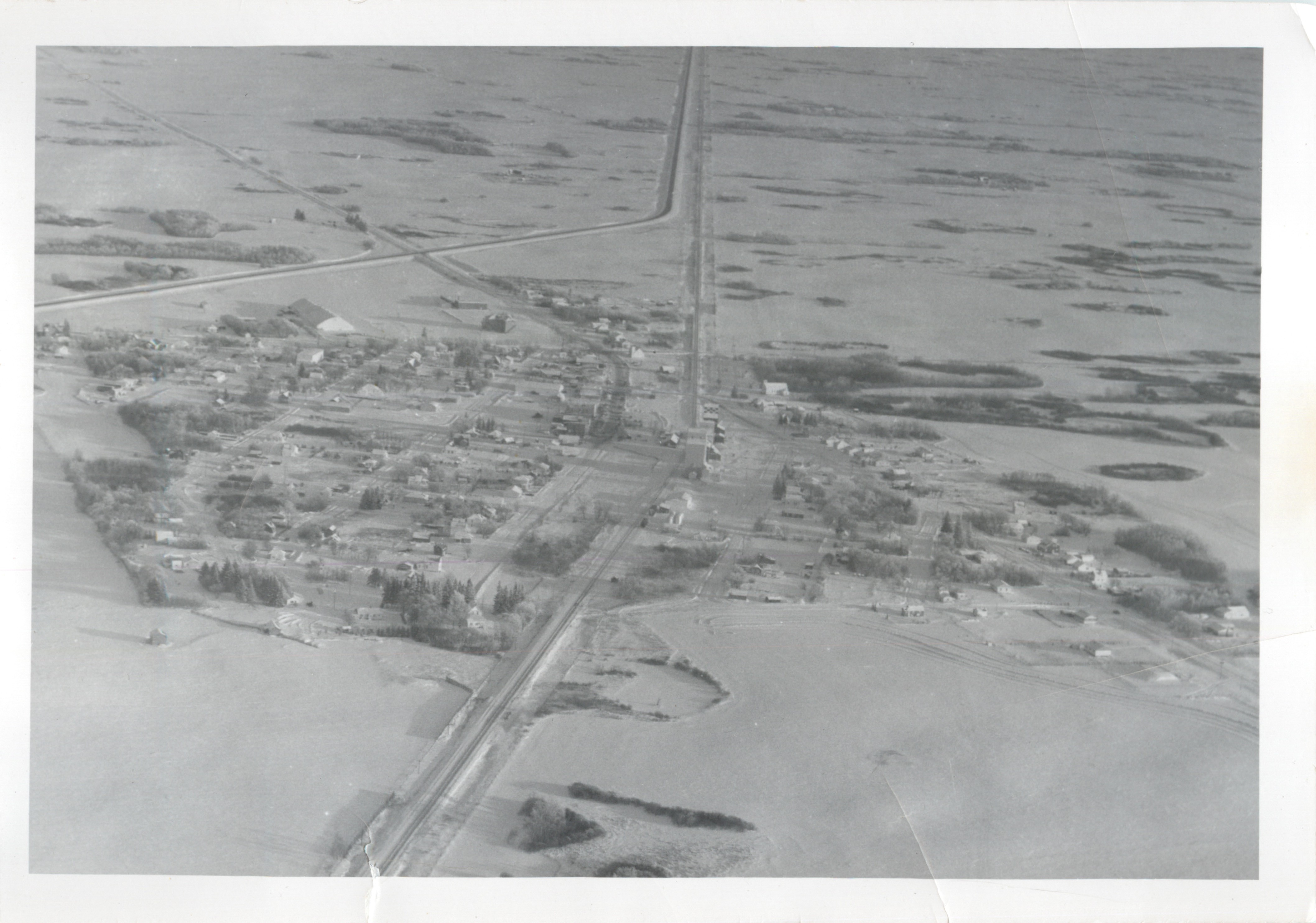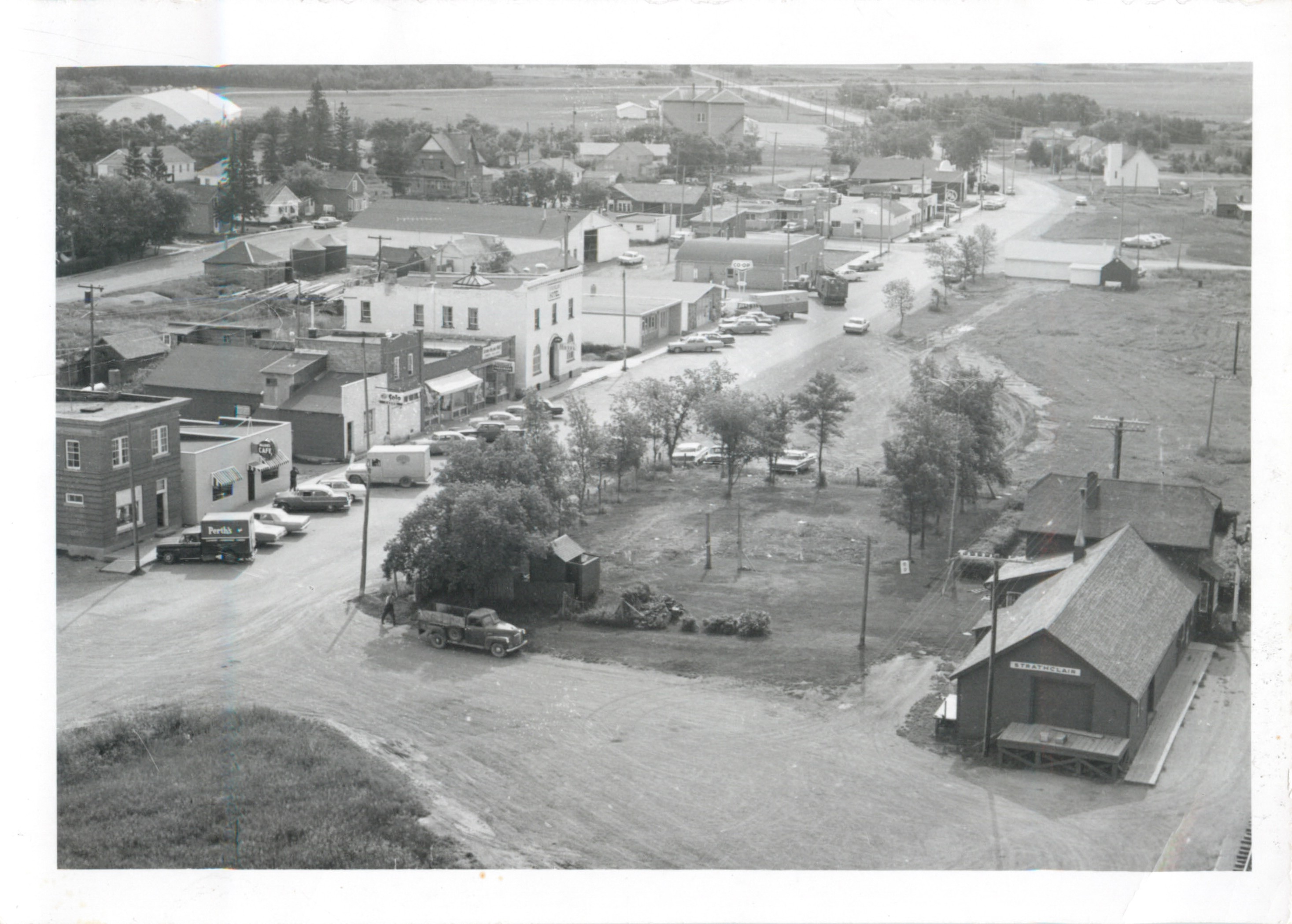 Description Town of Strathclair, station still at original location, Zagaloski's make shift drugstore, Gordon Pirie's house before top half removed. Sometime after 1961