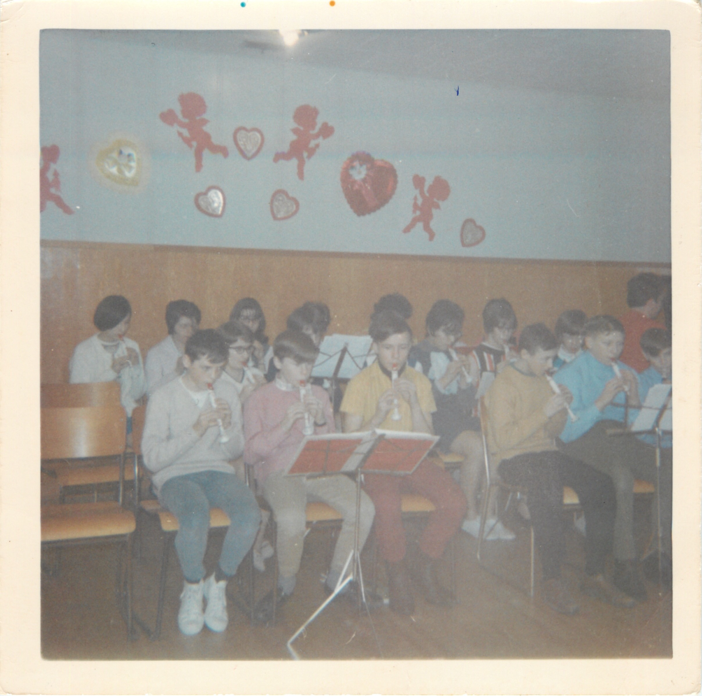 Description Grade 7 flutophone class entertaining at the Valentine Tea. Front Row left to right - Kevin Pahl, Keith Martin, Jim Lumley, Colin Bryce, Bob Ross, Murray Knott, Back Row left to right - Brenda Prus, Shirley Kotyk, Ruth Lennox, Janet Zegalski, ?? Janice Elliott, Jackie Prus, Carolyn Menzies & Gayleen Stimpson on piano.