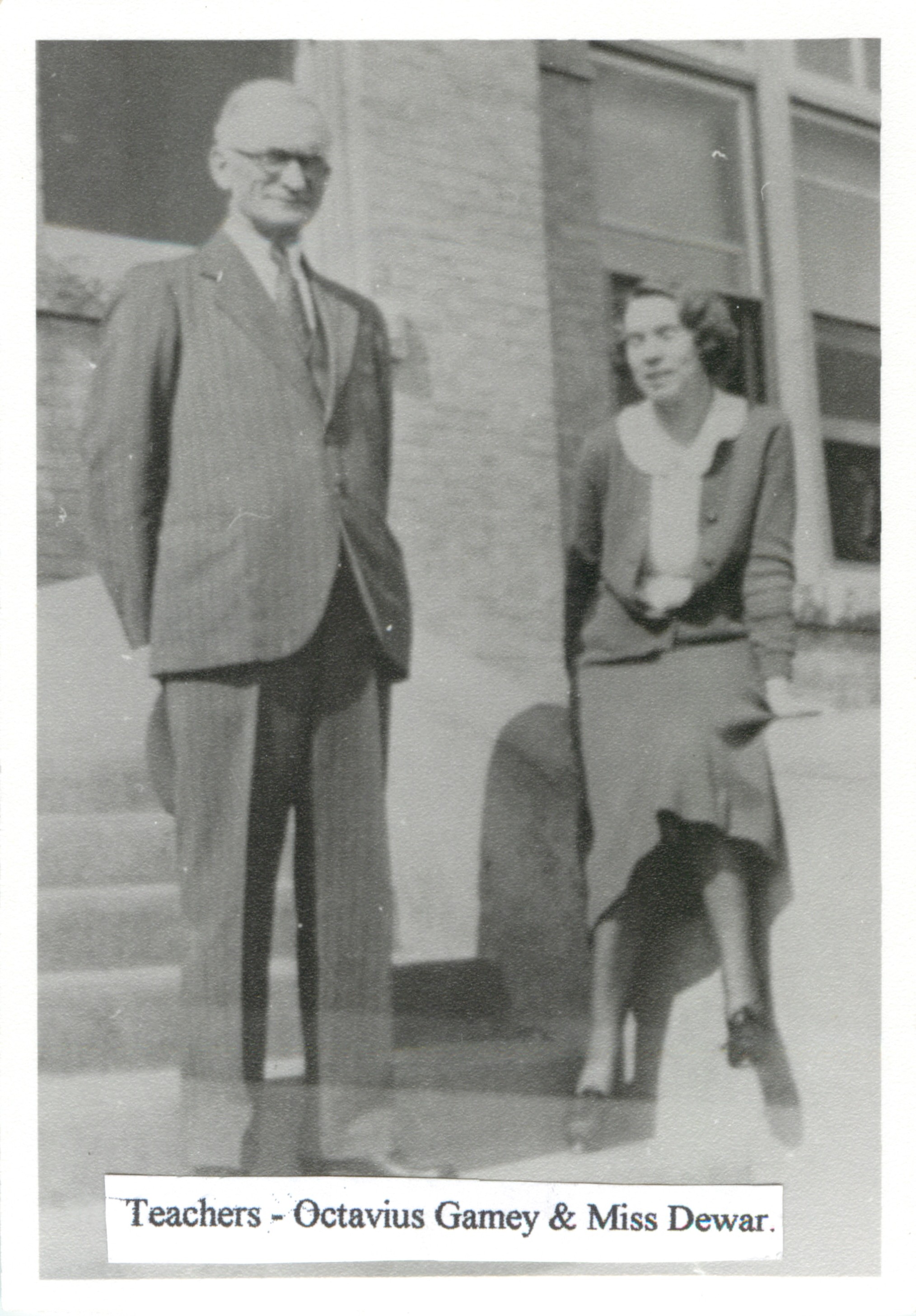 Description Octavius Gamey & Miss Dewar infront of the Strathclair school