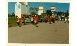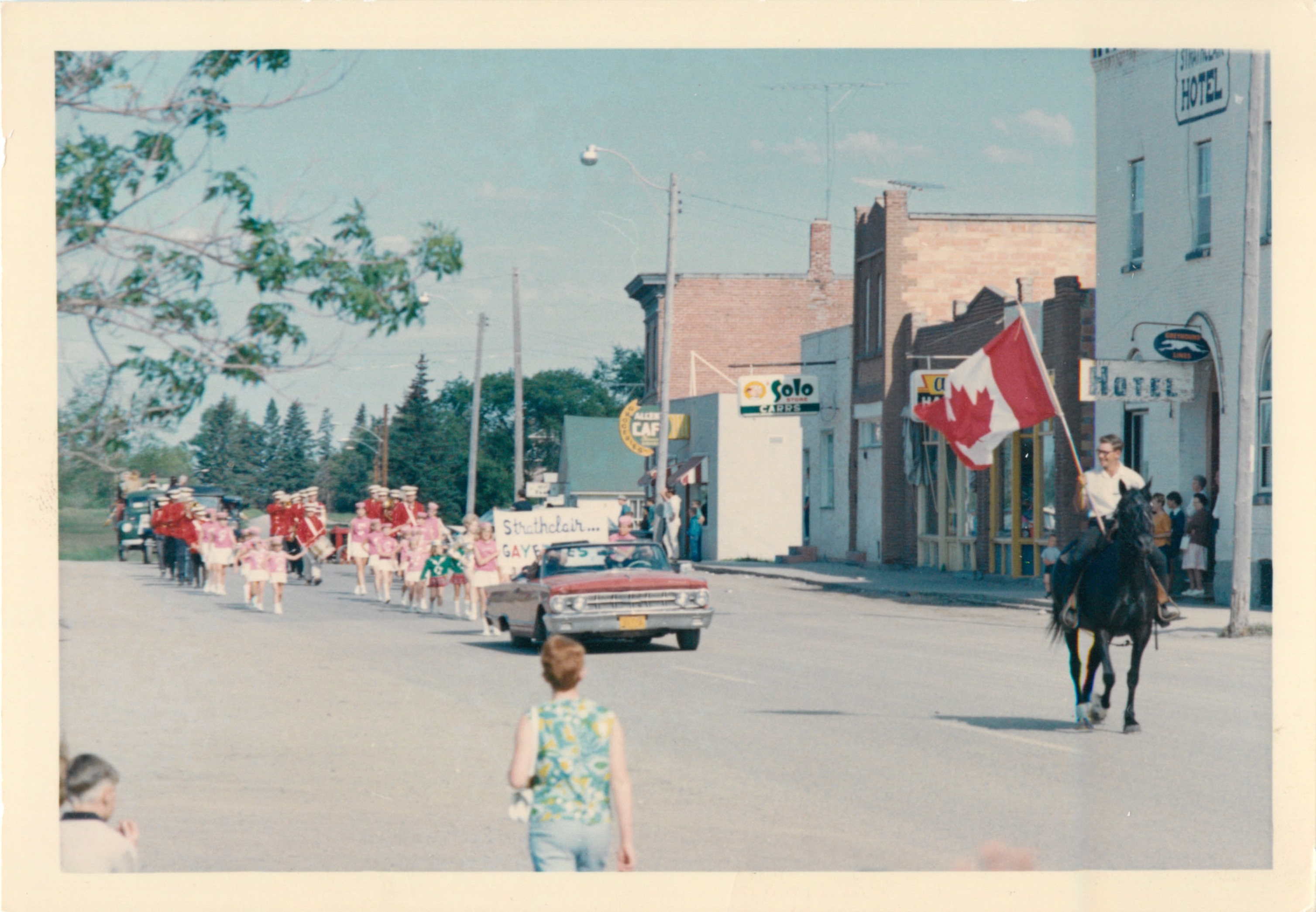 Description Strathclair Fair Parade in the 1960's. View of main street. Businesses R-L Hotel, (Lumley's) Hardware, Carrs Solo Store, Allen's Cafe, Rest Room (the old Salt Lake School with a green roof)
