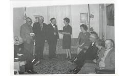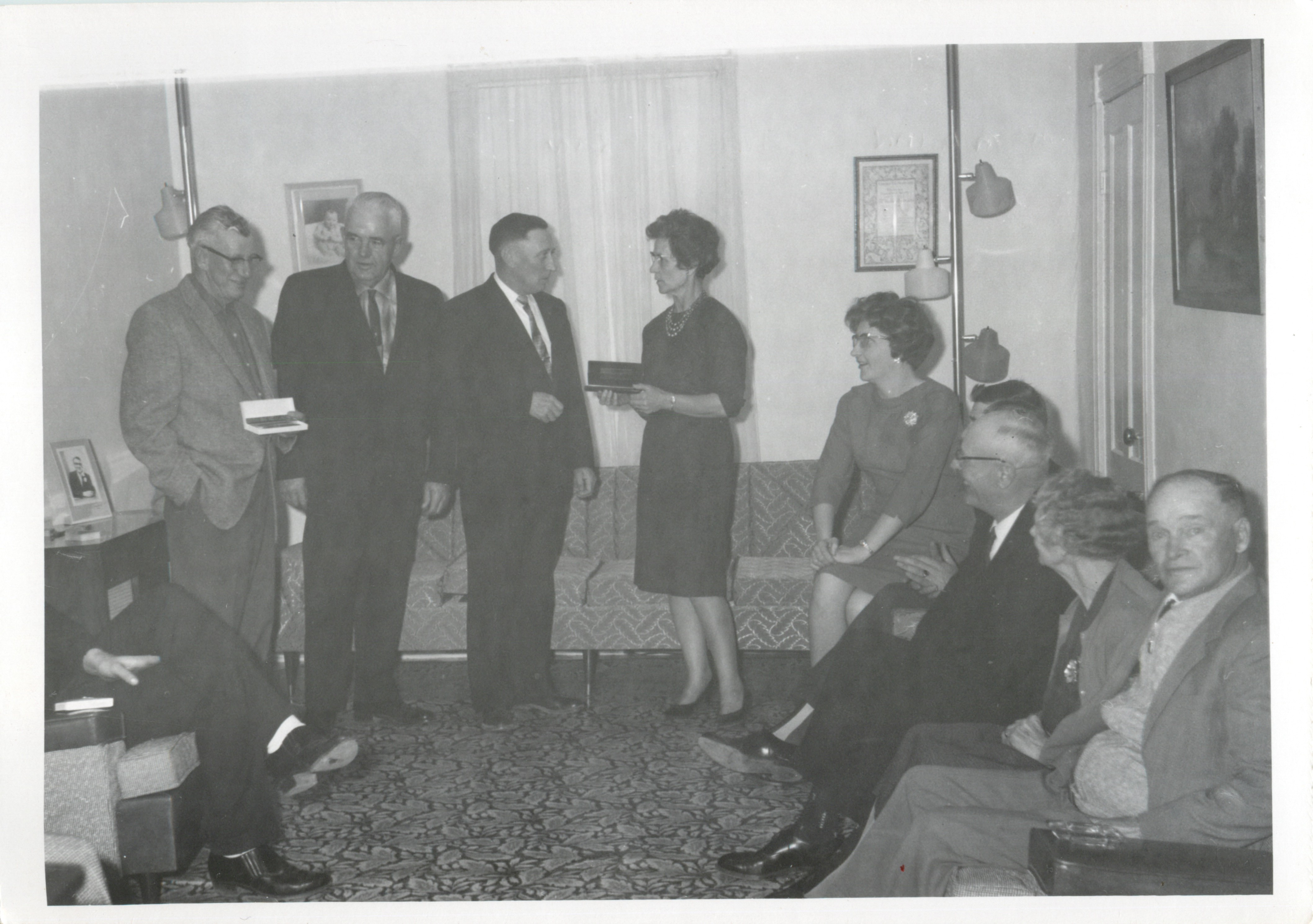 Description Bruce McMahan, Howard Mervin, Earl Leeson, Agnes McMahan, Lex Pederson, Mervyn Pedersen, Walter Moffat, Hilda Bradley & Austin Bradley. Best guess is this was a presentation of of some sort in the early 1960's.