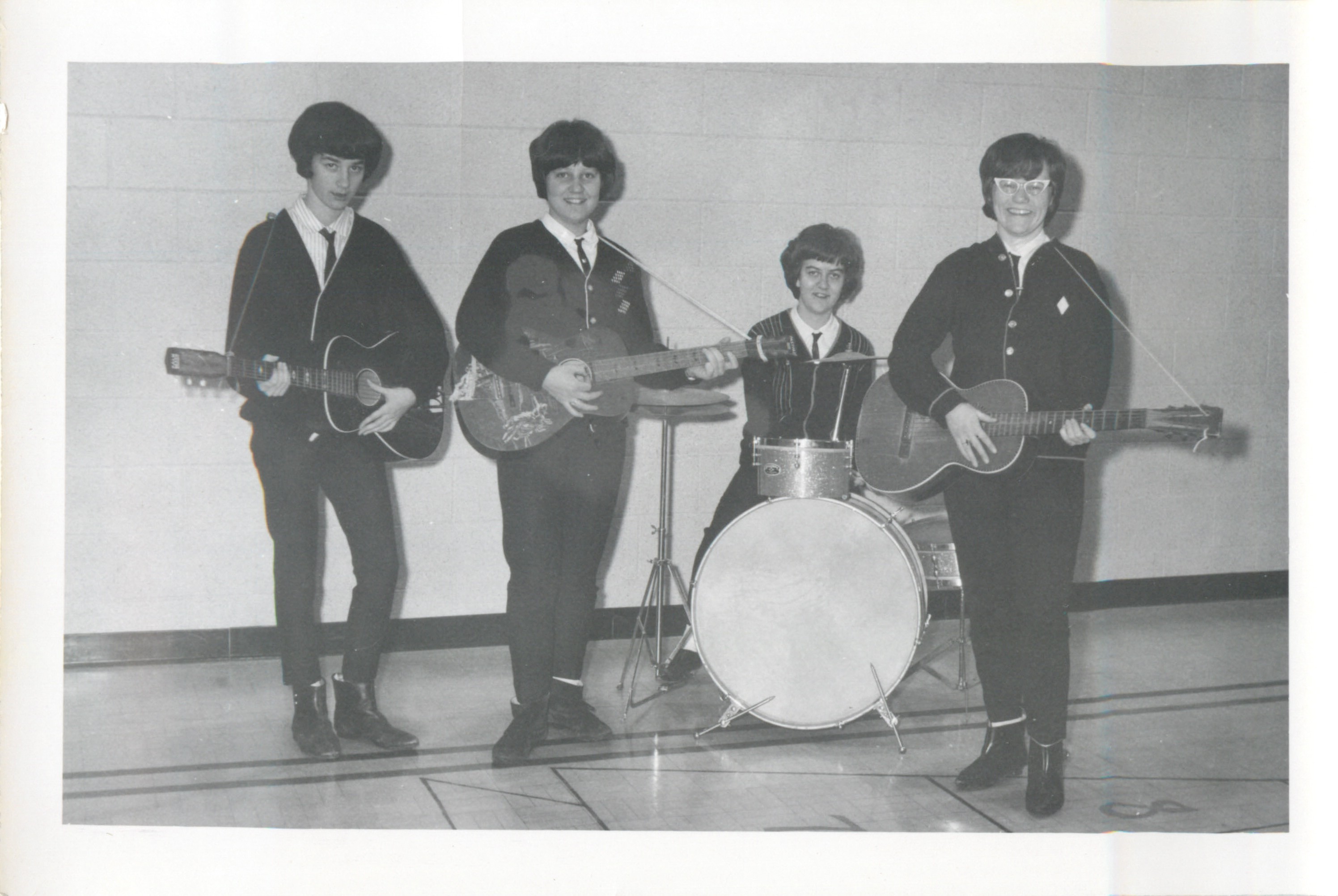 Description Sheryl Wyton, Linda Morcom, Judy Lee Morris, Janice Elliot preforming at the school around 1966