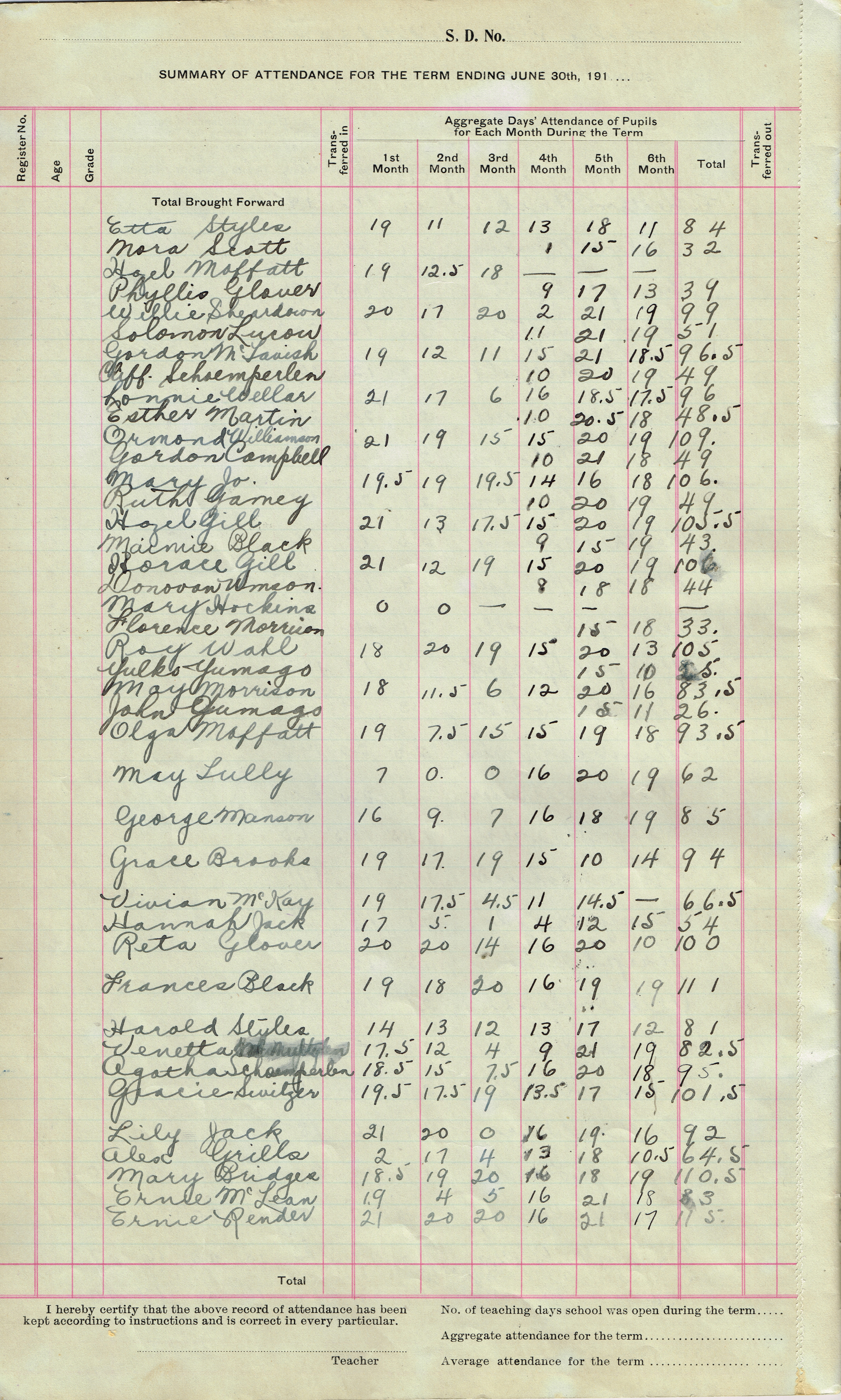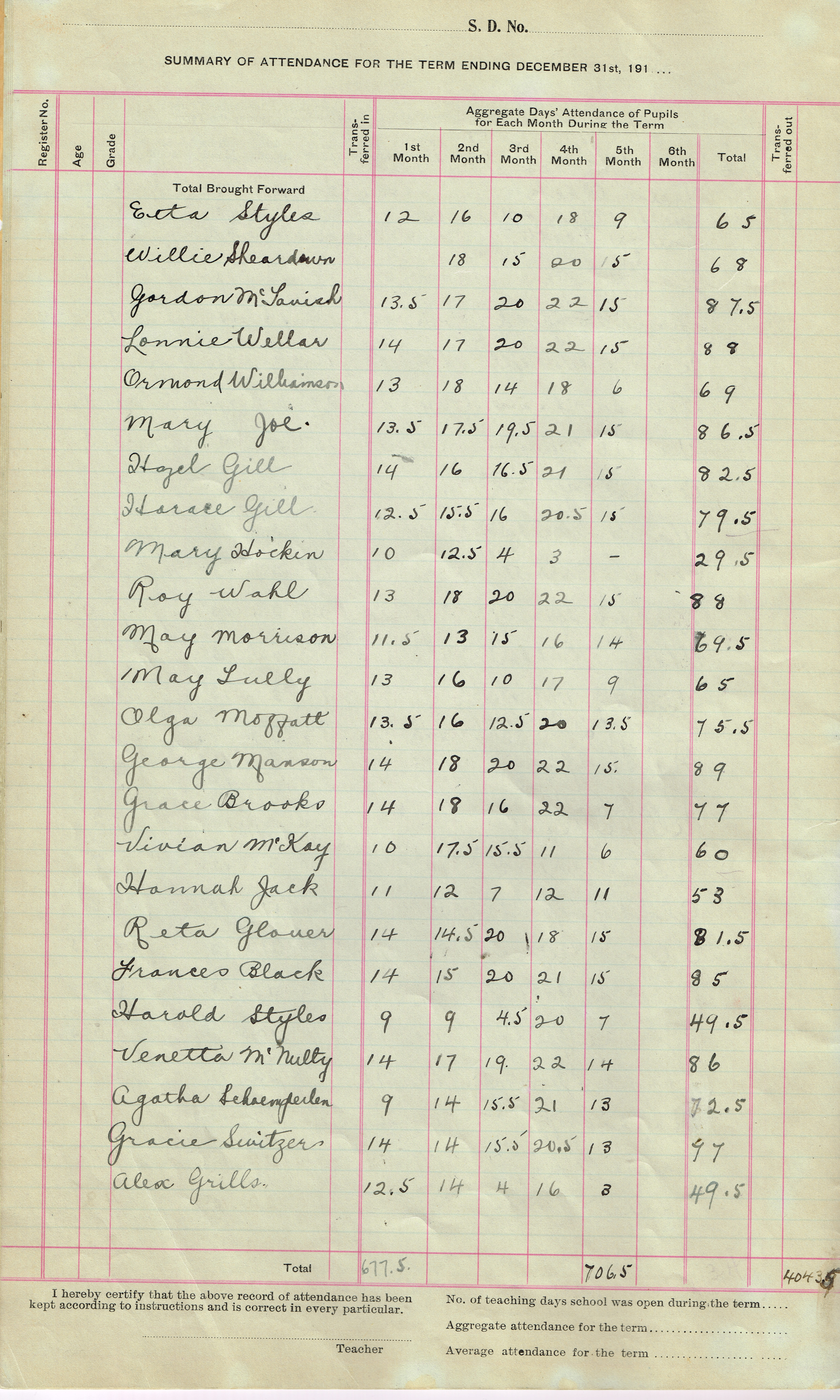 Description B.M. McBean (Teacher), Etta Styles (G.1), Willie Sheardown (G.1), Gordon McTavish(G.1), Lonnie Wellar (G.1), Ormond Williamson (G.1), Mary Joe (G.1), Hazel Gill (G.1), Horace Gill (G.1), Mary Hockin (G.1), Roy Wahl (G.1), May Morrison (G.1), May Tully (G.1), Olga Moffatt (G.1), George Manson (G.1), Grace Brooks (G.1), Vivan McKay (G.1), Hannah Jack (G.1), Reta Glover, Frances Black (G.1), Harold Styles (G.1), Venetta McNutty (G.1), Agatha Schoemperlen (G.1), Graciew Switzer (G.1), Alex Grills (G.1)