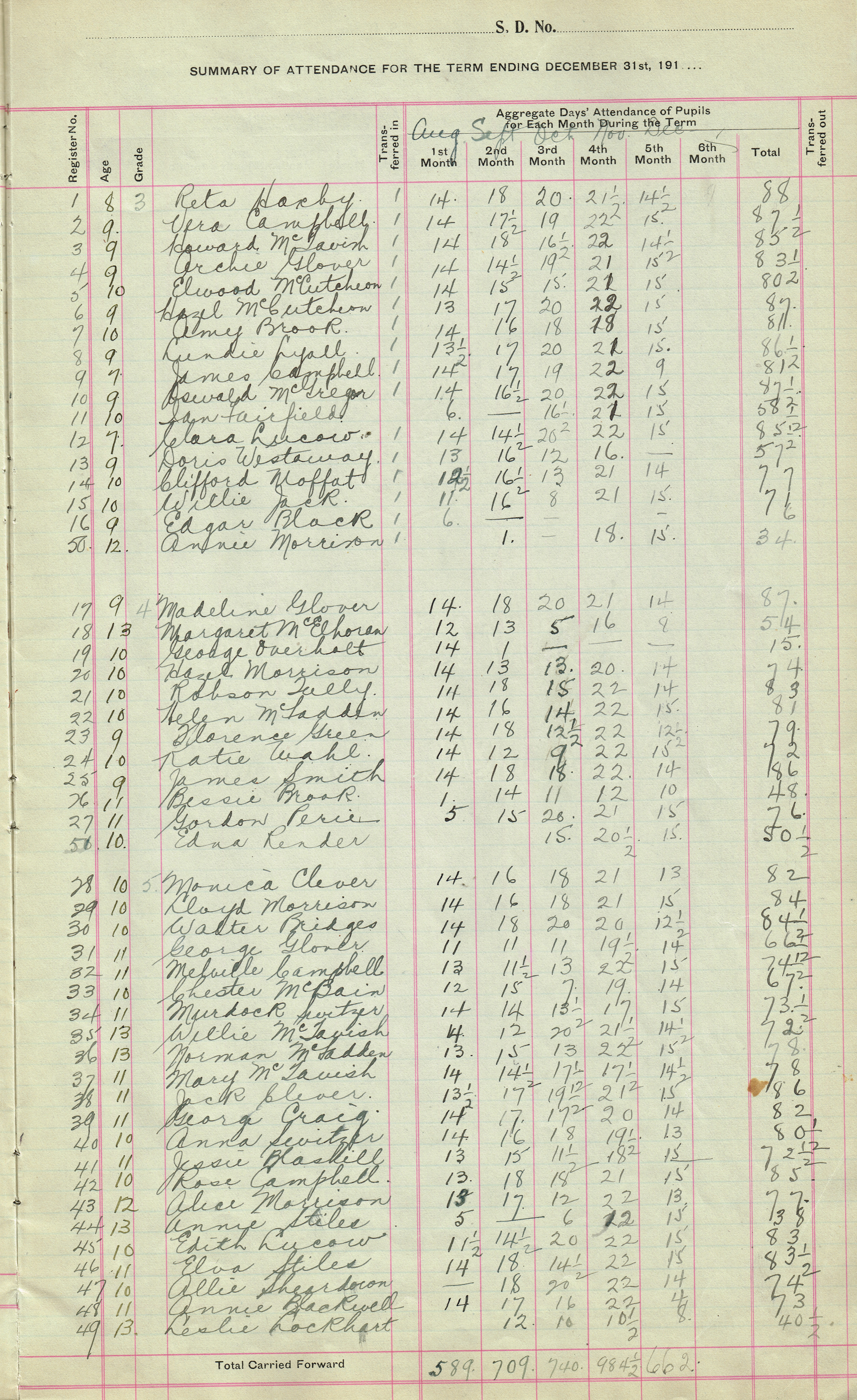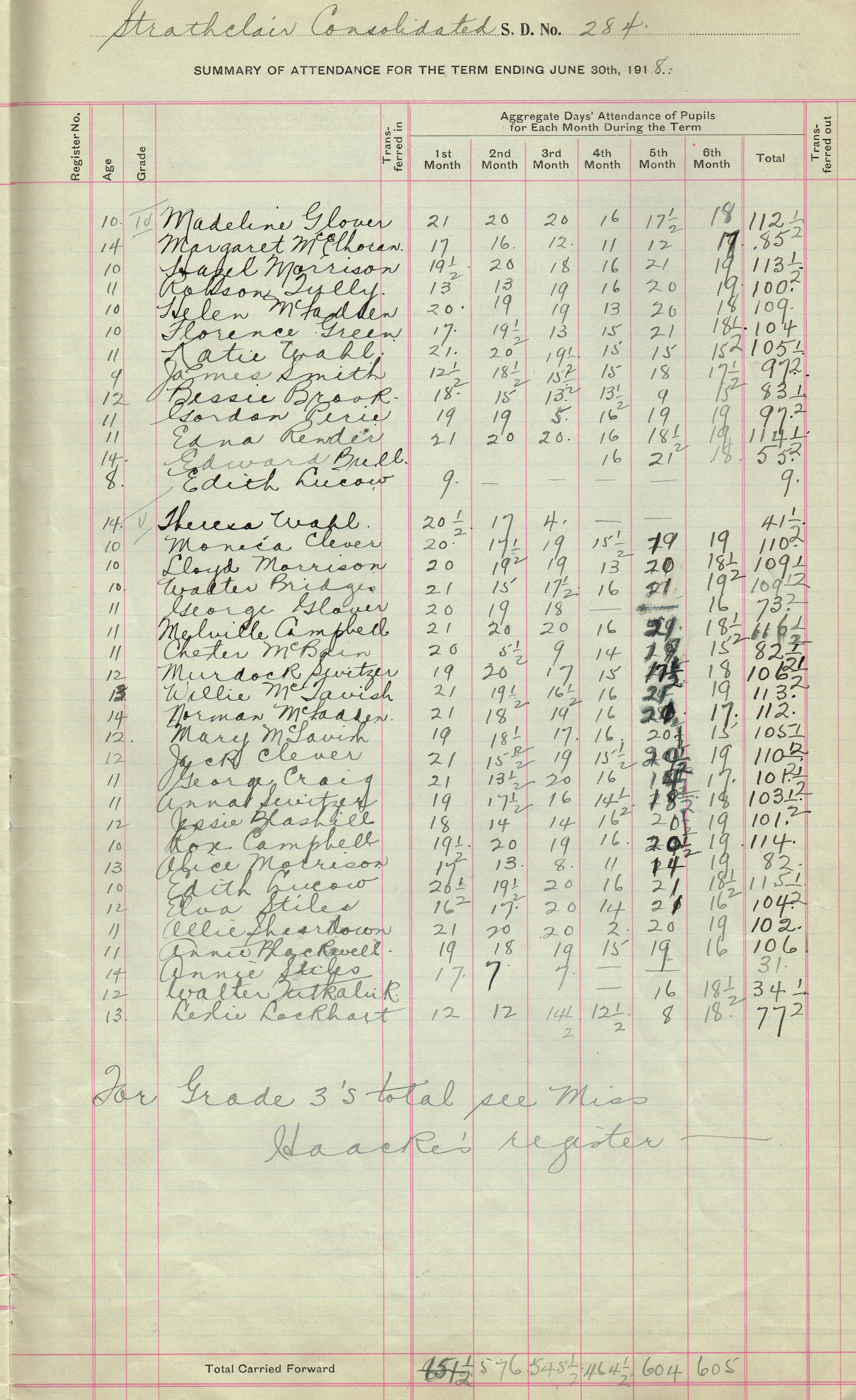 Description Shirley E Herg, Teacher, Madeline Glover (G.4), Margaret McMElhoran (G.4), Hazel Morrison (G.4), Robson Tully (G.4), Helen McFadden (G.4), Florence Green (G.4), Katie Wahl (G.4), James Smith (G.4), Bessie Brook (G.4), Gordon Pirie (G.4), Edna Render (G.4), Edward Bull (G.4), Edith Lucow (G.4), Theresa Wahl (G.5), Monica Clever (G.5), Lloyd Morrison (G.5), Walter Bridges (G.5), George Clover (G.5), Melville Campbell (G.5), Chester McBain (G.5), Murdock Switzer (G.5), Willie McTavish (G.5), Norman McFadden (G.5), Mary McTavish (G.5), Jack Clever (G.5), George Craig (G.5), Anna Switzer (G.5), Jessie Blashill (G.5), Rose Campbell (G.5), Alice Morrison (G.5), Edith Lucow (G.5), Elva Stiles (G.5), Allie Sheardown (G.5), Annie Blackwell (G.5), Annie Stiles (G.5), Walter ? (G.5), Leslie Lockhart (G.5), (For Grade 3's total, see Miss Haacke's register).