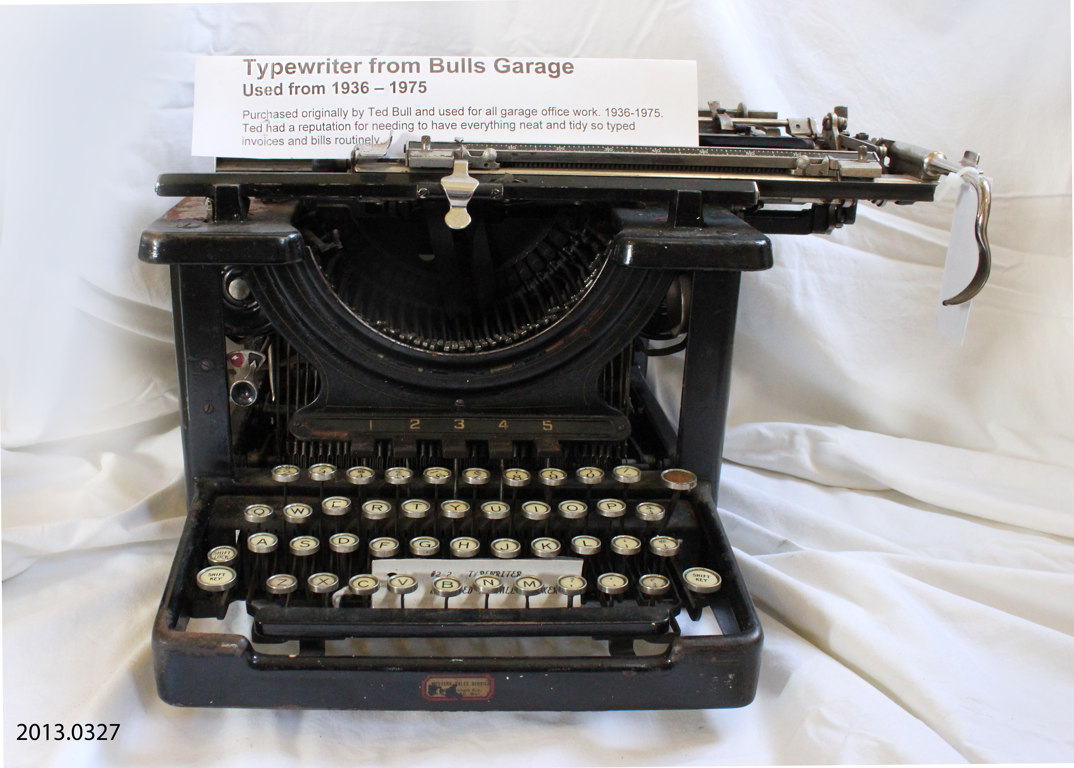 Object Desc Purchased originally by Ted Bull and used for all garage office work. 1936-1975. Ted had a reputation for needing to have everything neat and tidy so he typed invoices and bills routinely.