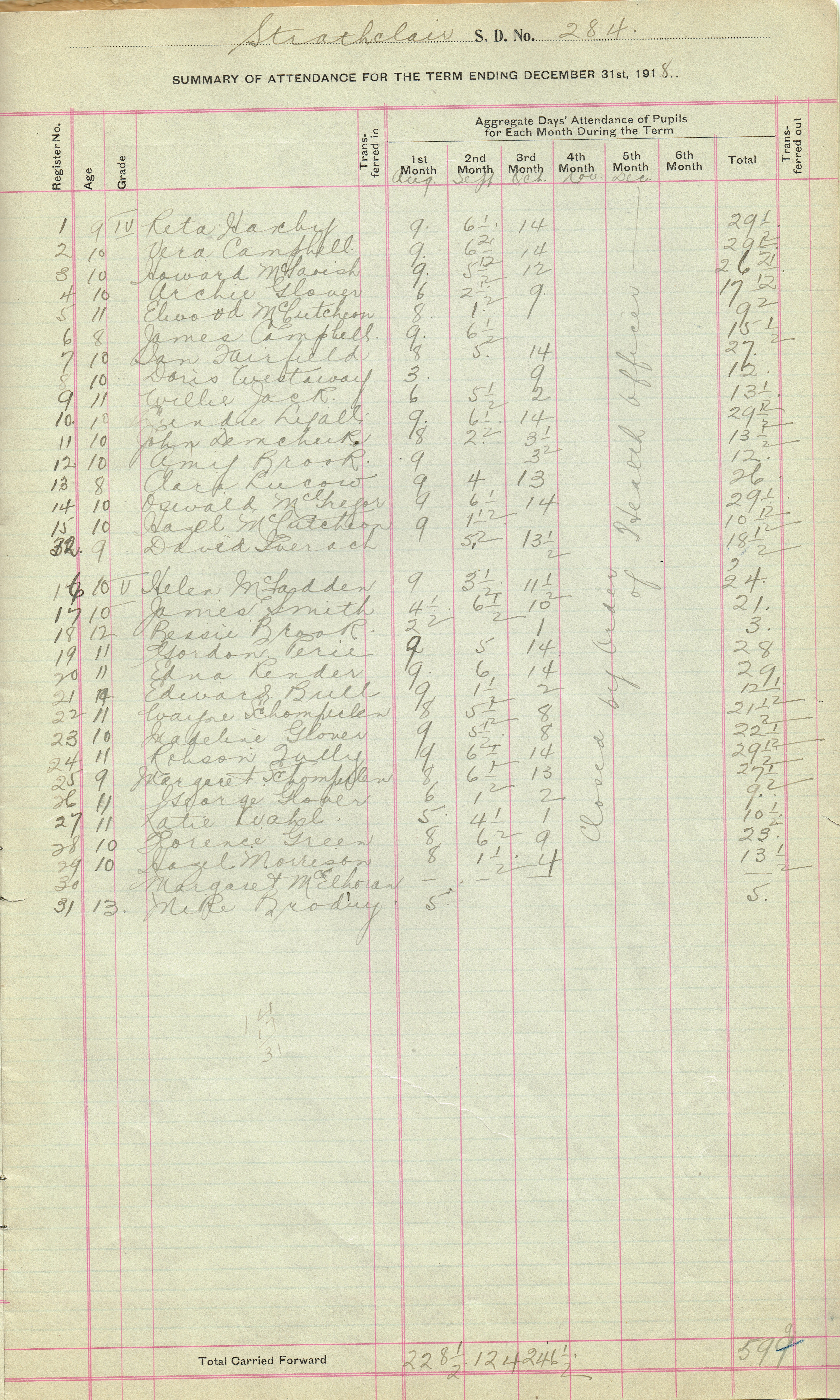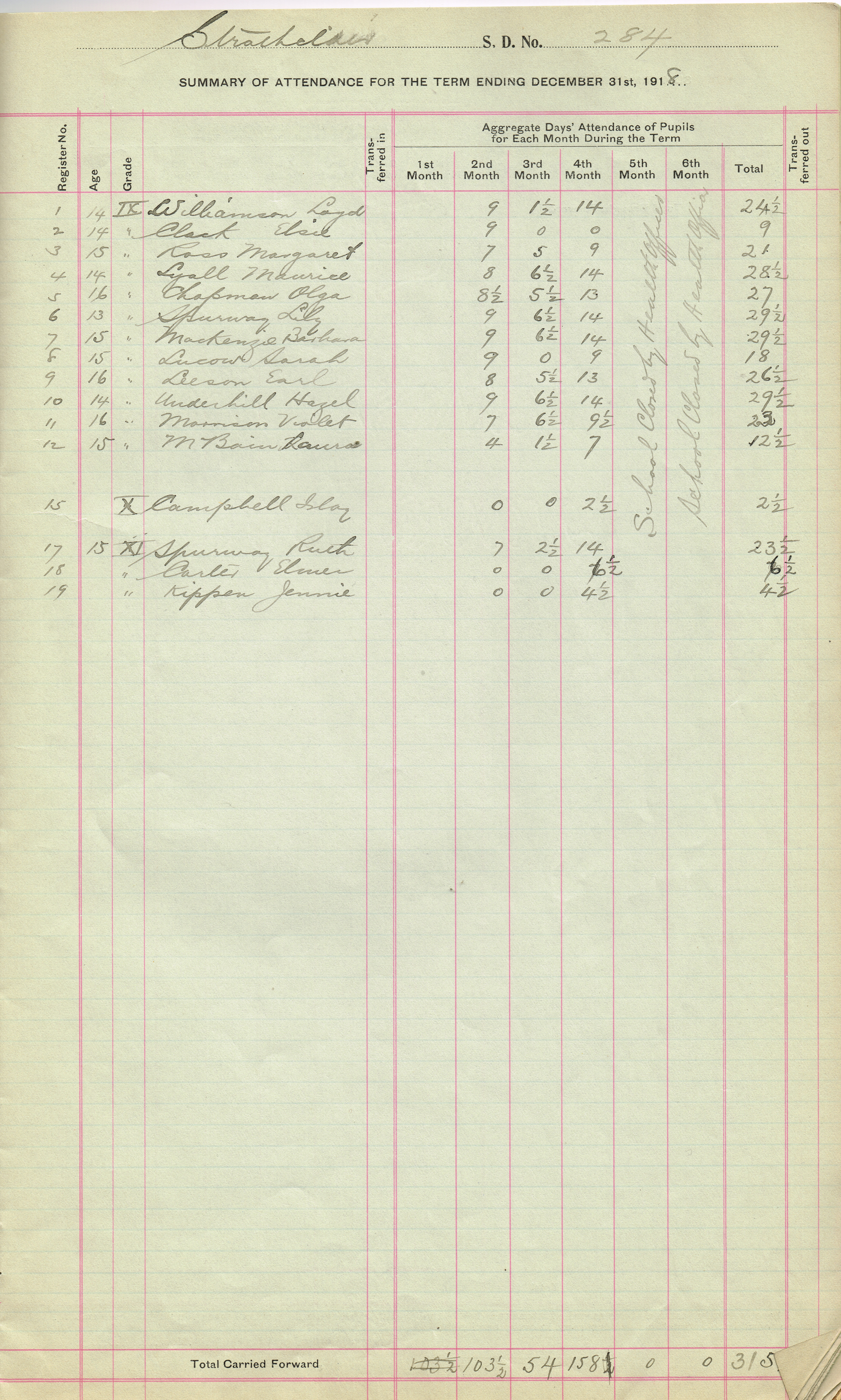 Description David Iverach (Teacher), Loyd Williamson (G.9), Elsie Clack (G.9), Margaret Ross (G.9), Olga Chapman (G.9), Maurice Lyall (G.9), Lily Spurway (G.9), Barbara Mackenzie (G.9), Sarah Lucow (G.9), Earl Leeson (G.9), Hazel Underhill (G.9), Violet Morrison (G.9), Laura McBain (G.9), Ella Underhill (G.9), Islay Campbell (G.10), Melville Cartes (G.10), Ruth Spurway (G.11), Elmer Cartes (G.11), Jennie Kippen (G.11), Stanley Westaway (G.11), Robert Campbell (G.11), Clinton Crawford (G.11).