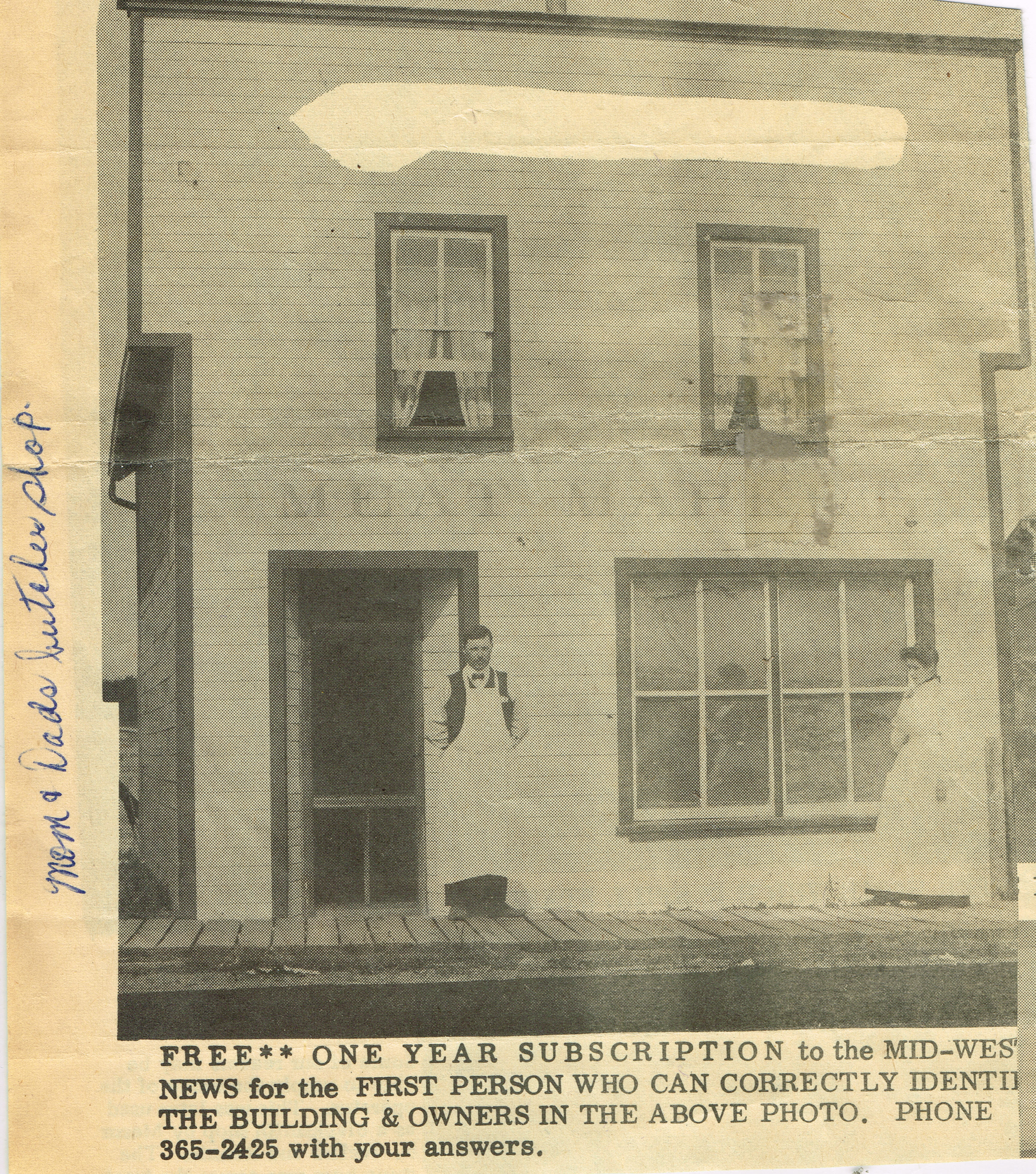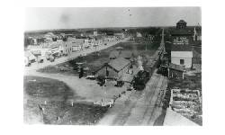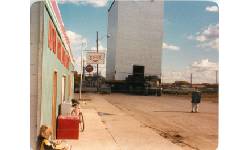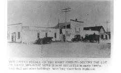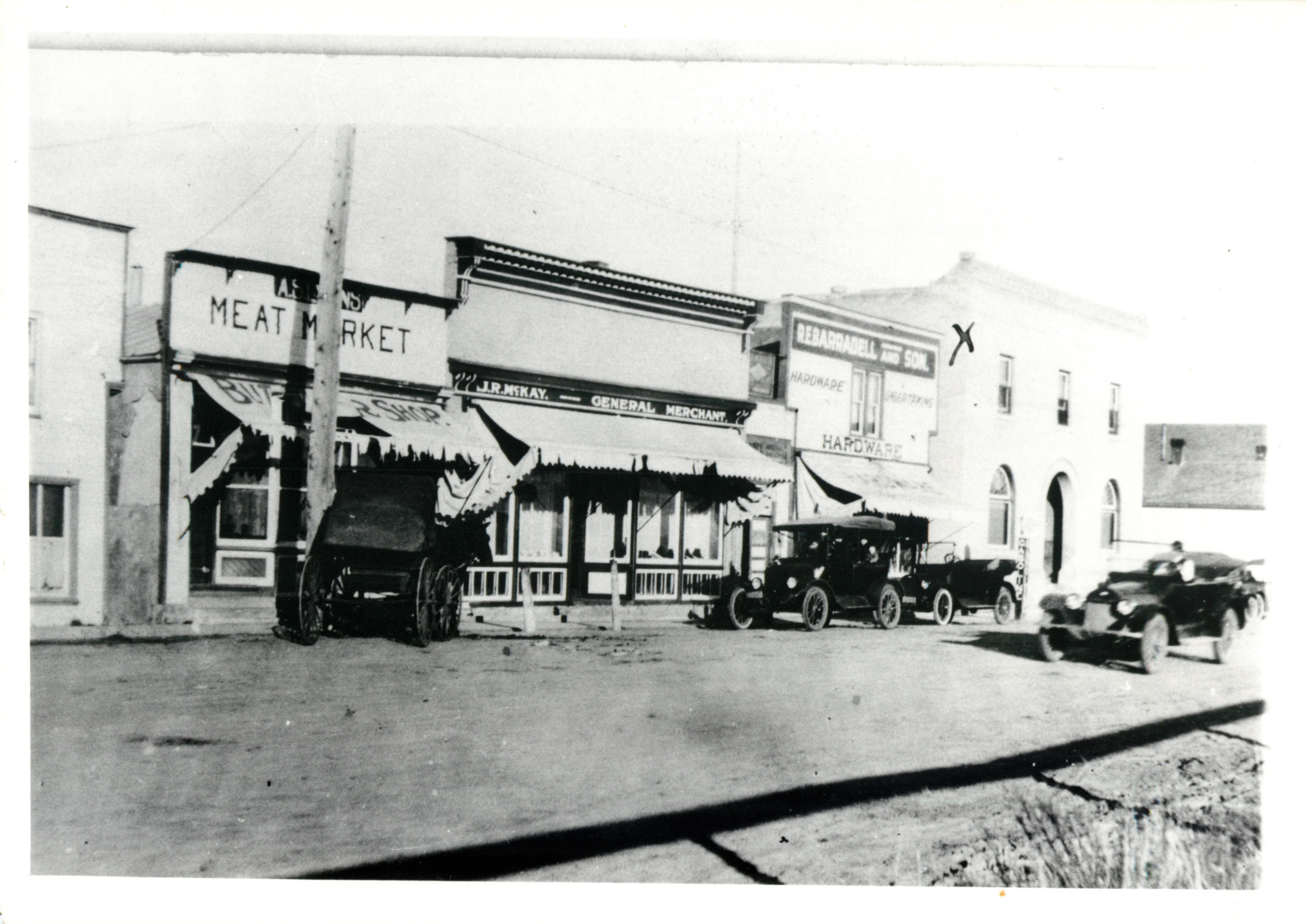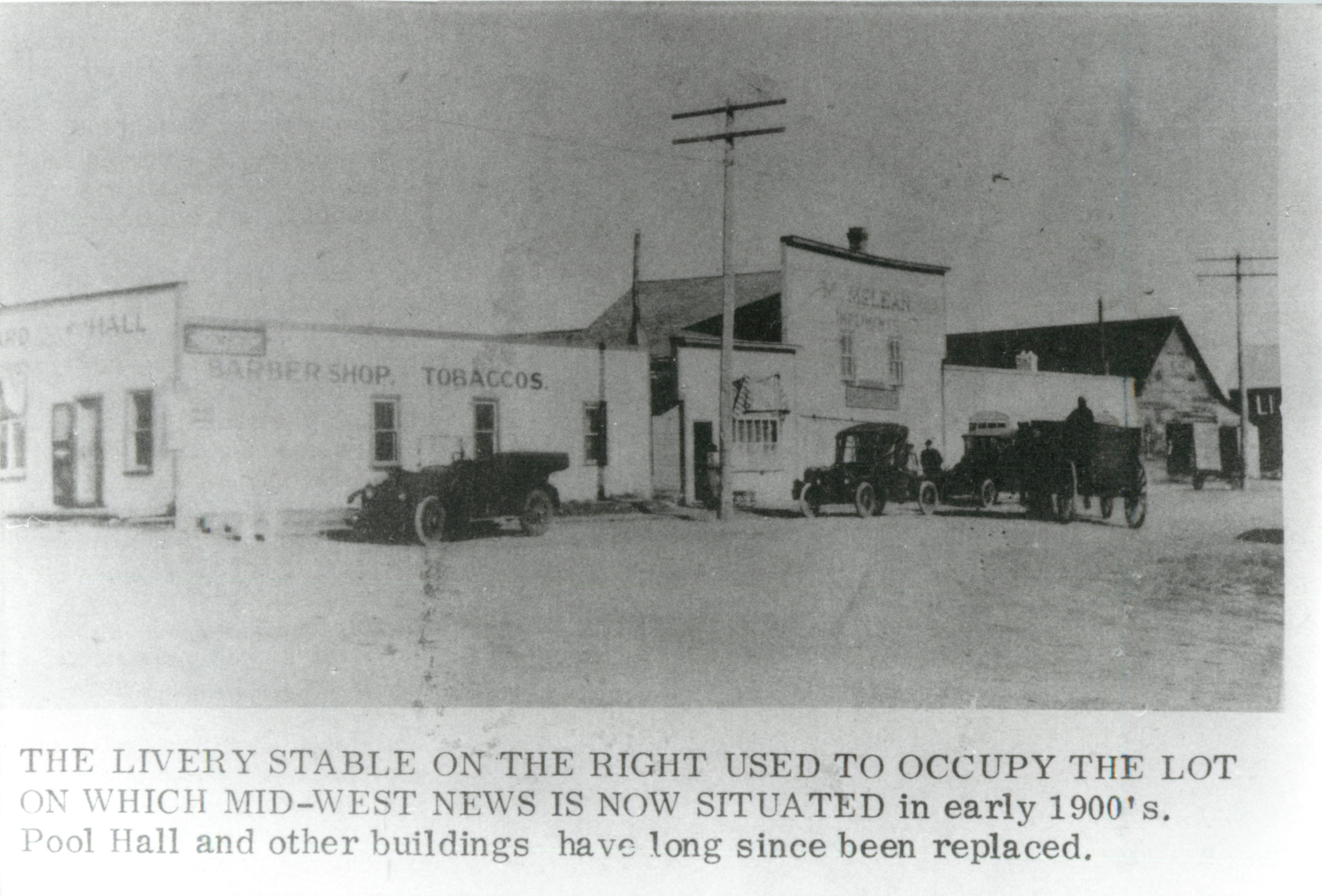 Description Left to Right: Mayhew Barber Shop & Pool room. Later sold to John Dmytar and rebuilt. Then then the Post office. Then McLeans Implements, and Palace Garage, Then Campbell Garage, Then the Livery Barn.