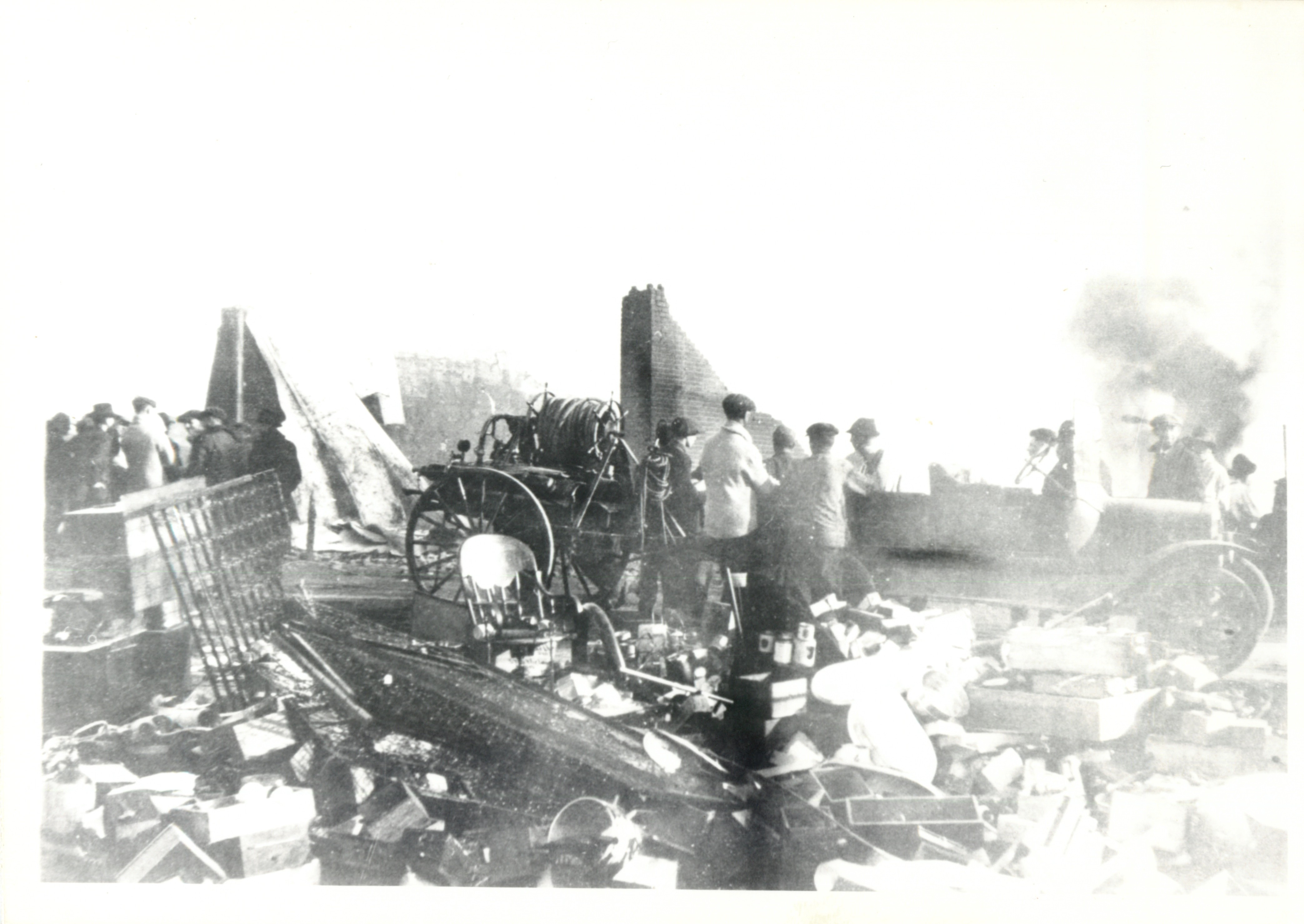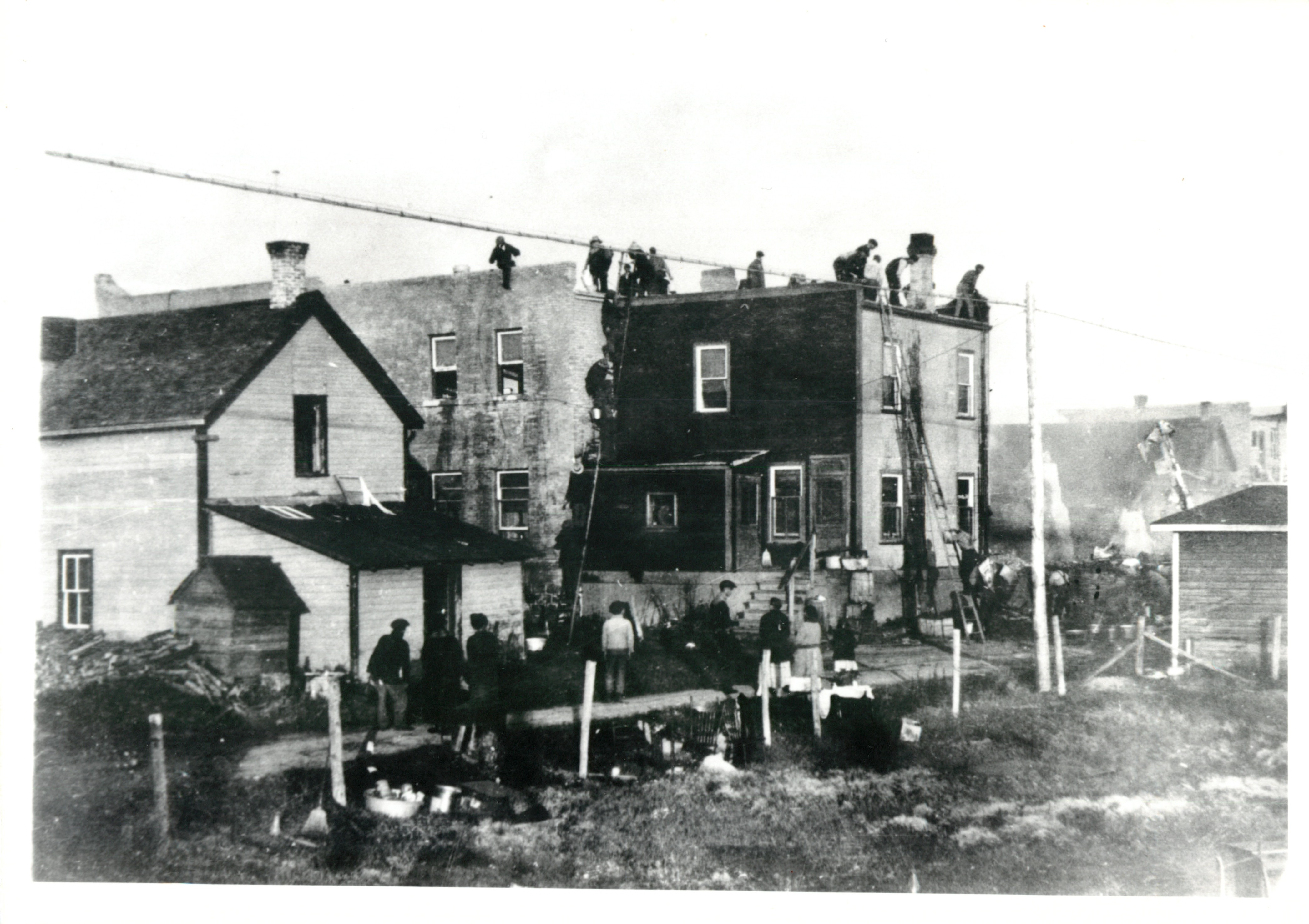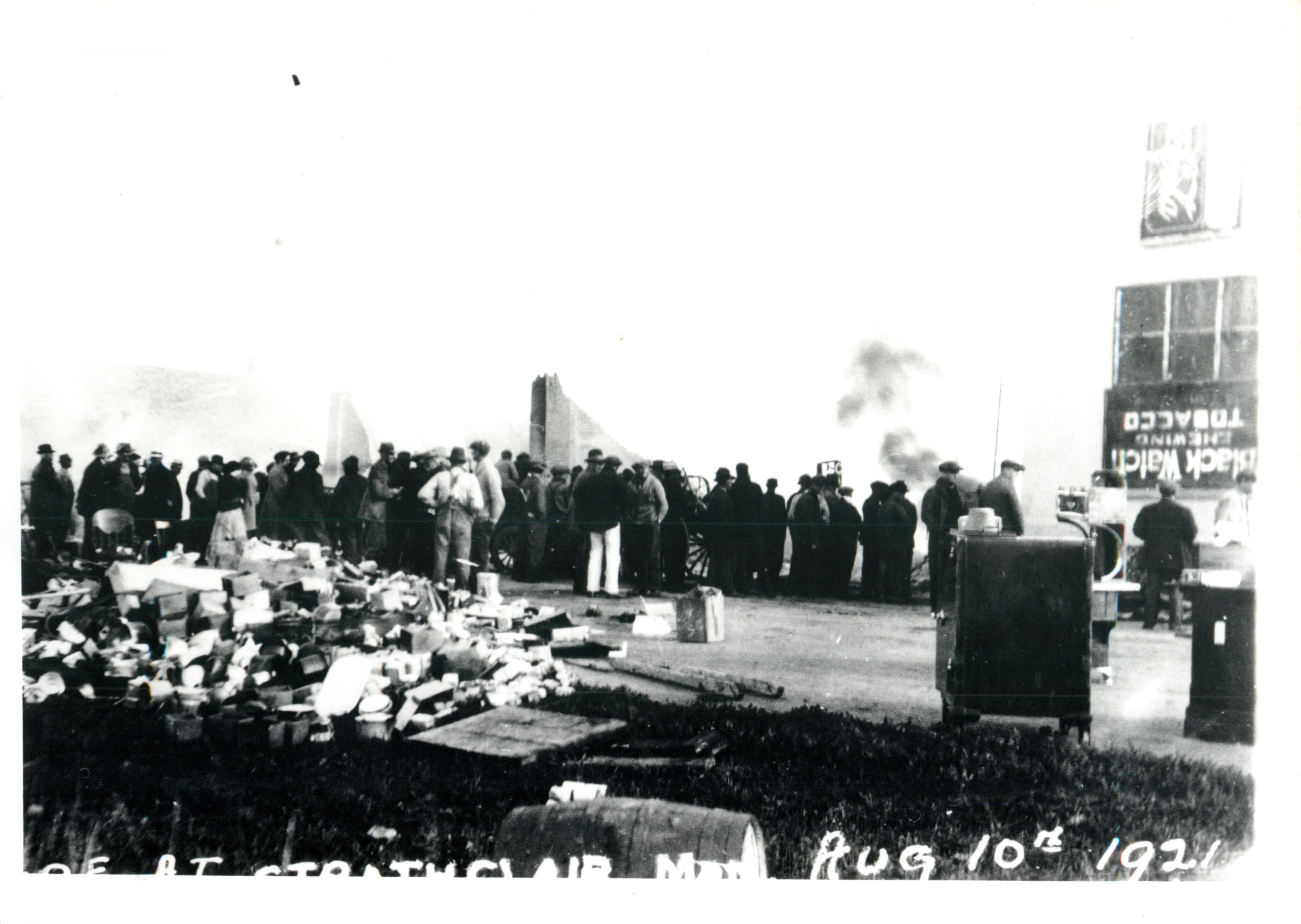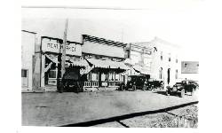 Description Left to Right: Mayhew Barber Shop & Pool room. Later sold to John Dmytar and rebuilt. Then then the Post office. Then McLeans Implements, and Palace Garage, Then Campbell Garage, Then the Livery Barn.