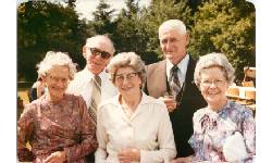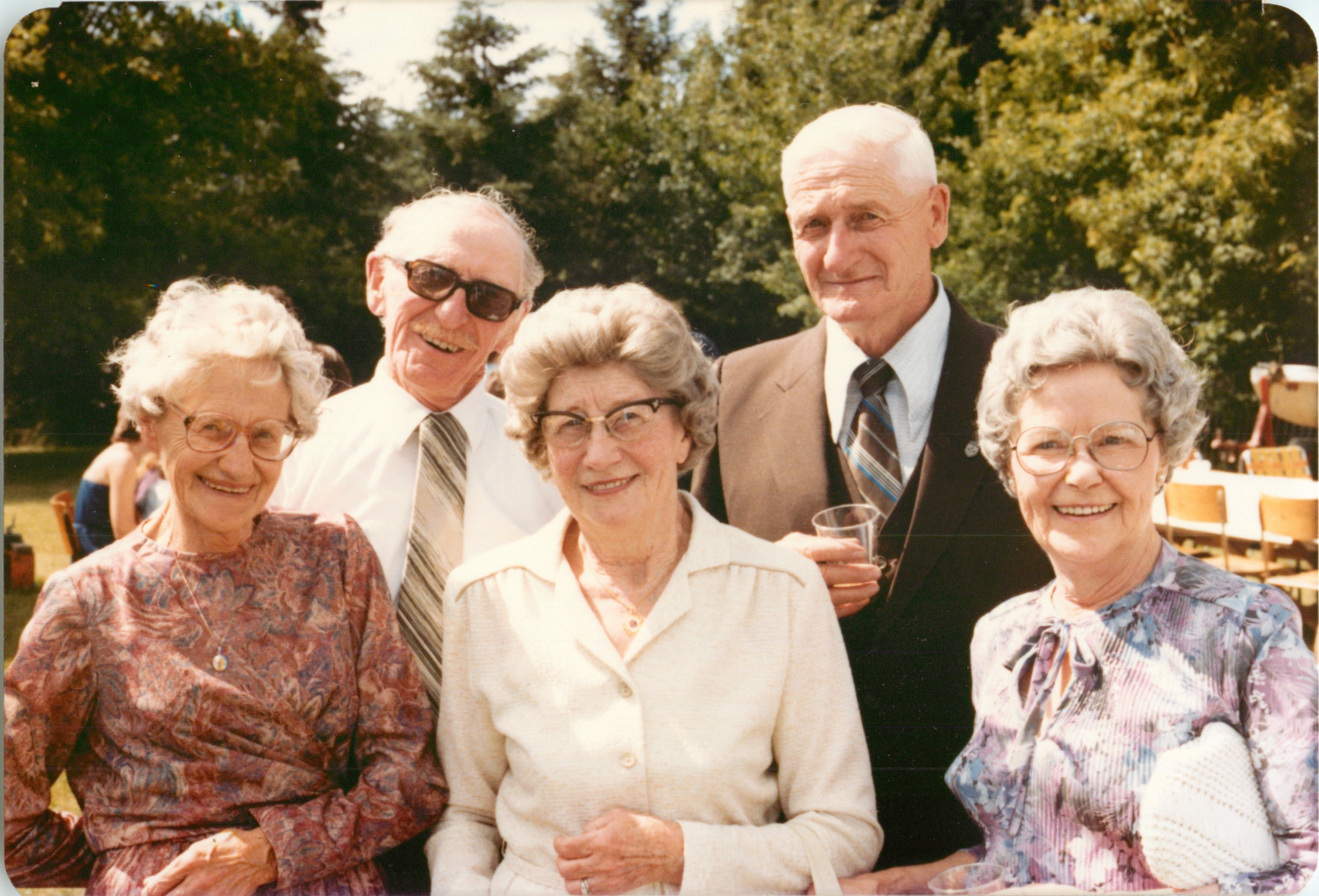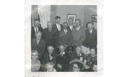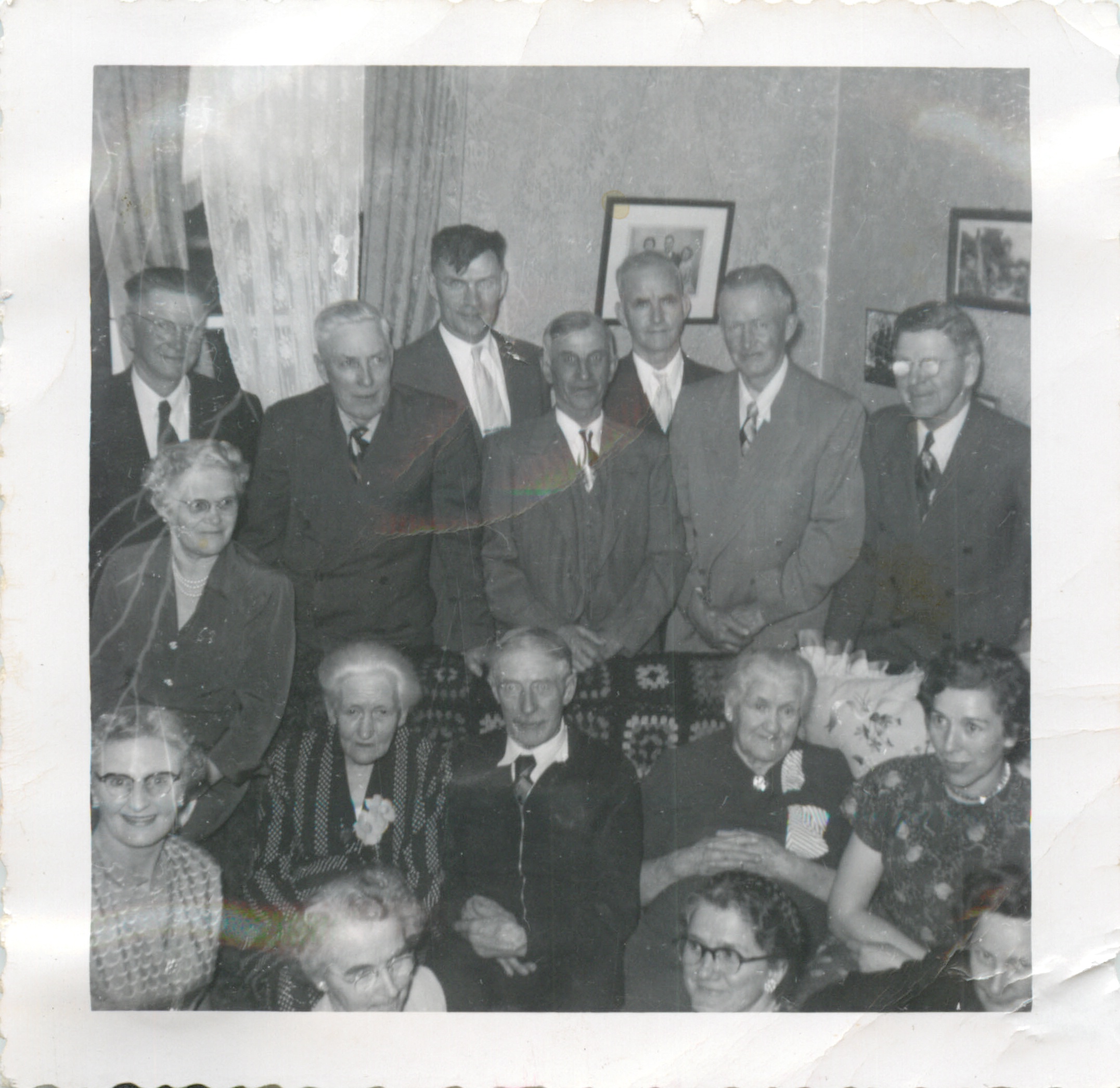 Description Photograph taken at Mr. and Mrs. Tom Head's anniversary. (possibly 40th) Back Row: Fred Mackie, Cam Robertson, Rev.Harland, Leonard Hayball, Jack Campbell, Art Gamey, John Elliott Middle Row: Mrs. Elliott, Mrs. Brook, Tom Head, Mrs. Head, Muriel Smollett Front Row: Ann Hayball, Agnes Robertson, Verna Gamey, Agnes Mackie